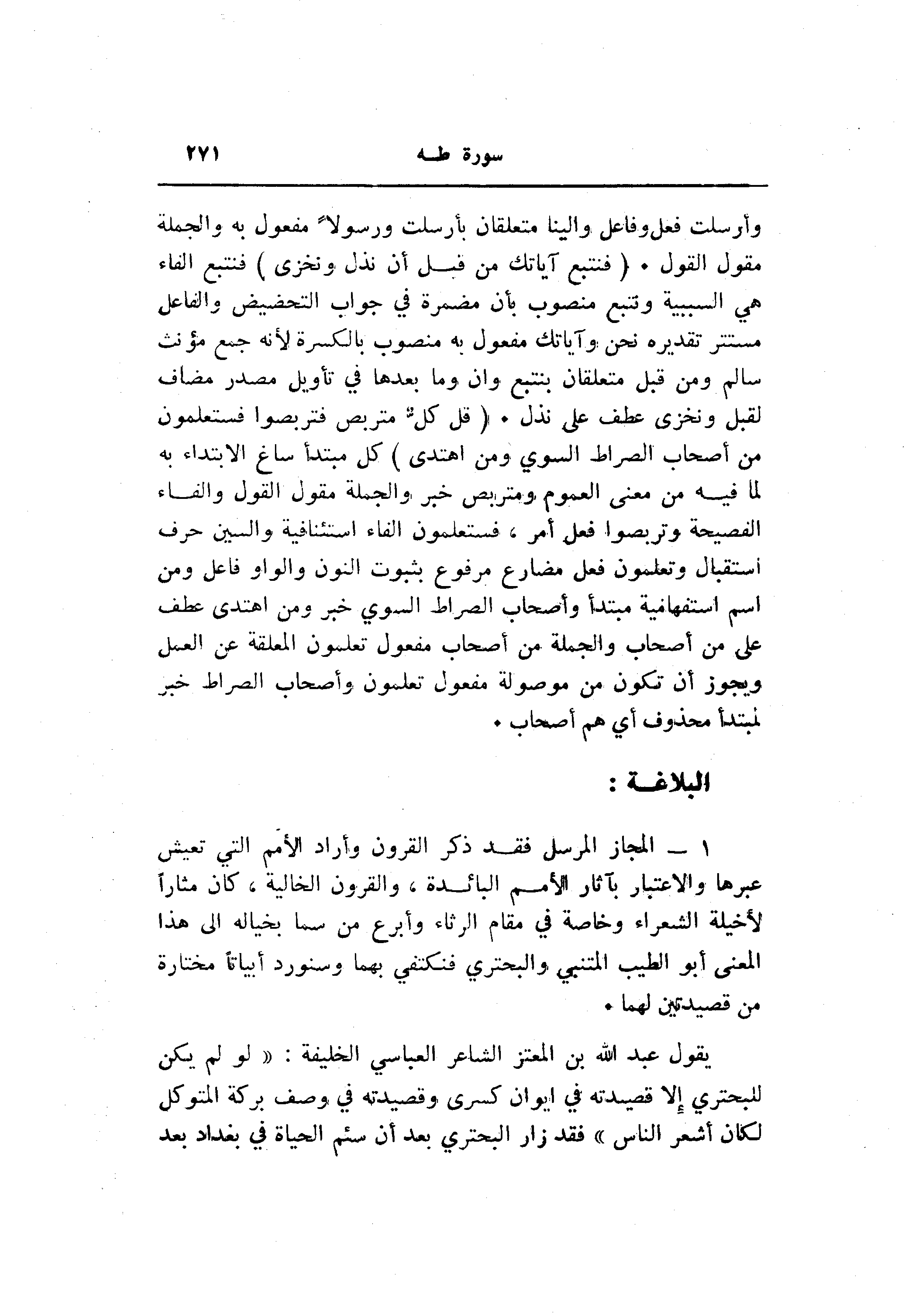 وأرسلت فعل وفاعل وإلينا متعلقان بأرسلت ورسولا مفعول به والجملة مقول القول. (فَنَتَّبِعَ آياتِكَ مِنْ قَبْلِ أَنْ نَذِلَّ وَنَخْزى) فنتبع الفاء هي السببية وتنبع منصوب بأن مضمرة في جواب التحضيض والفاعل مستتر تقديره نحن وآياتك مفعول به منصوب بالكسرة لأنه جمع مؤنث سالم ومن قبل متعلقان بنتبع وان وما بعدها في تأويل مصدر مضاف لقبل ونخزى عطف على نذل. (قُلْ كُلٌّ مُتَرَبِّصٌ فَتَرَبَّصُوا فَسَتَعْلَمُونَ مَنْ أَصْحابُ الصِّراطِ السَّوِيِّ وَمَنِ اهْتَدى) كل مبتدأ ساغ الابتداء به لما فيه من معنى العموم ومتربص خبر والجملة مقول القول والفاء الفصيحة وتربصوا فعل أمر، فستعلمون الفاء استئنافية والسين حرف استقبال وتعلمون فعل مضارع مرفوع بثبوت النون والواو فاعل ومن اسم استفهامية مبتدأ وأصحاب الصراط السوي خبر ومن اهتدى عطف على من أصحاب والجملة من أصحاب مفعول تعلمون المعلقة عن العمل ويجوز أن تكون من موصولة مفعول تعلمون وأصحاب الصراط خبر لمبتدأ محذوف أي هم أصحاب.