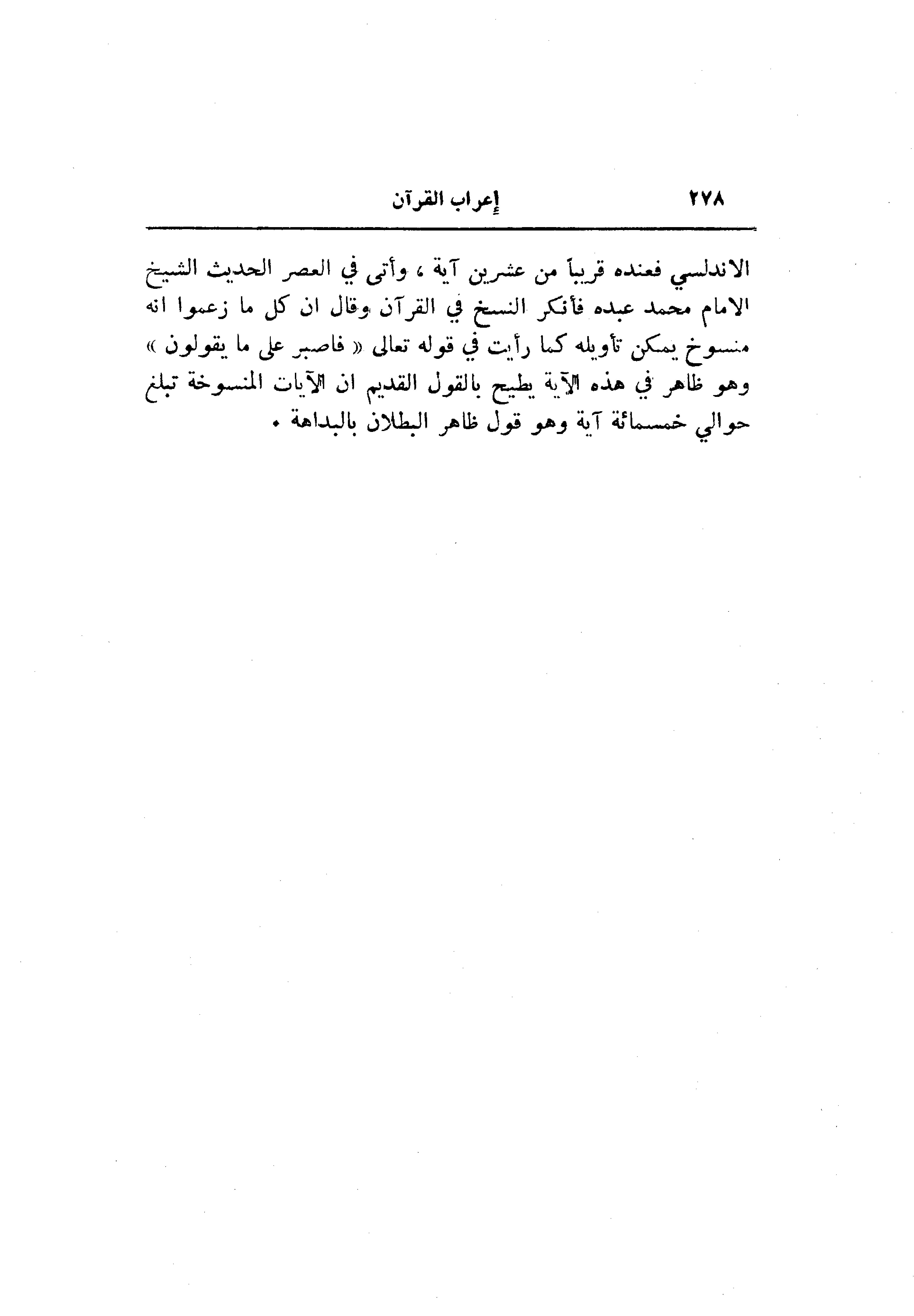 الاندلسي فعنده قريبا من عشرين آية، وأتى في العصر الحديث الشيخ الامام محمد عبده فأنكر النسخ في القرآن وقال ان كل ما زعموا انه منسوخ يمكن تأويله كما رأيت في قوله تعالى «فَاصْبِرْ عَلى ما يَقُولُونَ» وهو ظاهر في هذه الآية يطيح بالقول القديم ان الآيات المنسوخة تبلغ حوالي خمسمائة آية وهو قول ظاهر البطلان بالبداهة.