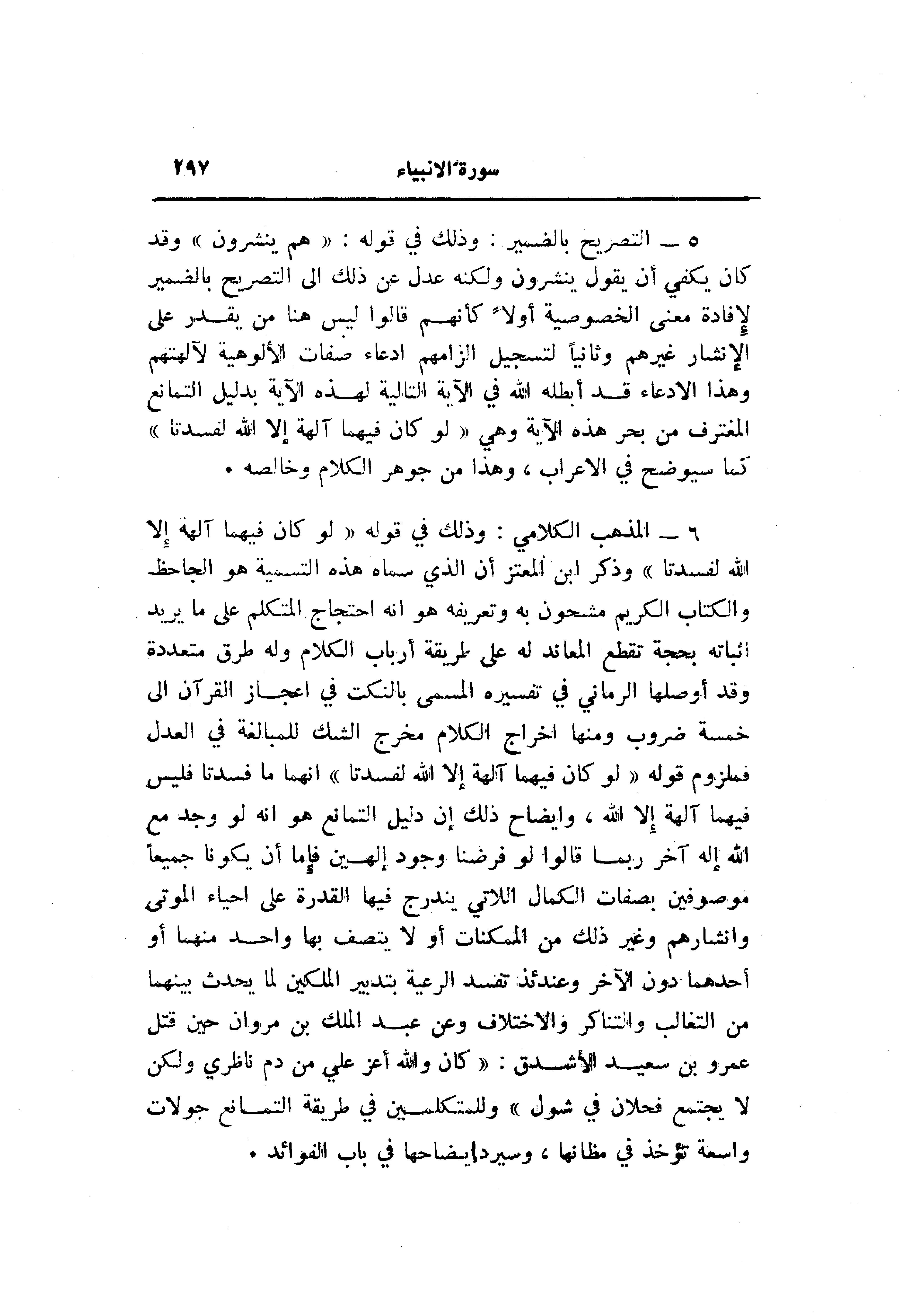 6- المذهب الكلامي: وذلك في قوله «لَوْ كانَ فِيهِما آلِهَةٌ إِلَّا اللَّهُ لَفَسَدَتا» وذكر ابن المعتز أن الذي سماه هذه التسمية هو الجاحظ والكتاب الكريم مشحون به وتعريفه هو انه احتجاج المتكلم على ما يريد إثباته بحجة تقطع المعاند له على طريقة أرباب الكلام وله طرق متعددة وقد أوصلها الرماني في تفسيره المسمى بالنكت في اعجاز القرآن الى خمسة ضروب ومنها إخراج الكلام مخرج الشك للمبالغة في العدل فملزوم قوله «لَوْ كانَ فِيهِما آلِهَةٌ إِلَّا اللَّهُ لَفَسَدَتا» انهما ما فسدتا فليس فيهما آلهة إلا الله، وإيضاح ذلك إن دليل التمانع هو انه لو وجد مع الله إله آخر ربما قالوا لو فرضنا وجود إلهين فإما أن يكونا جميعا موصوفين بصفات الكمال اللاتي يندرج فيها القدرة على احياء الموتى وانشارهم وغير ذلك من الممكنات أو لا يتصف بها واحد منهما أو أحدهما دون الآخر وعندئذ تفسد الرعية بتدبير الملكين لما يحدث بينهما من التغالب والتناكر والاختلاف وعن عبد الملك بن مروان حين قتل عمرو بن سعيد الأشدق: «كان والله أعز علي من دم ناظري ولكن لا يجتمع فحلان في شول» وللمتكلمين في طريقة التمانع جولات واسعة تؤخذ في مظانها، وسيرد إيضاحها في باب الفوائد.