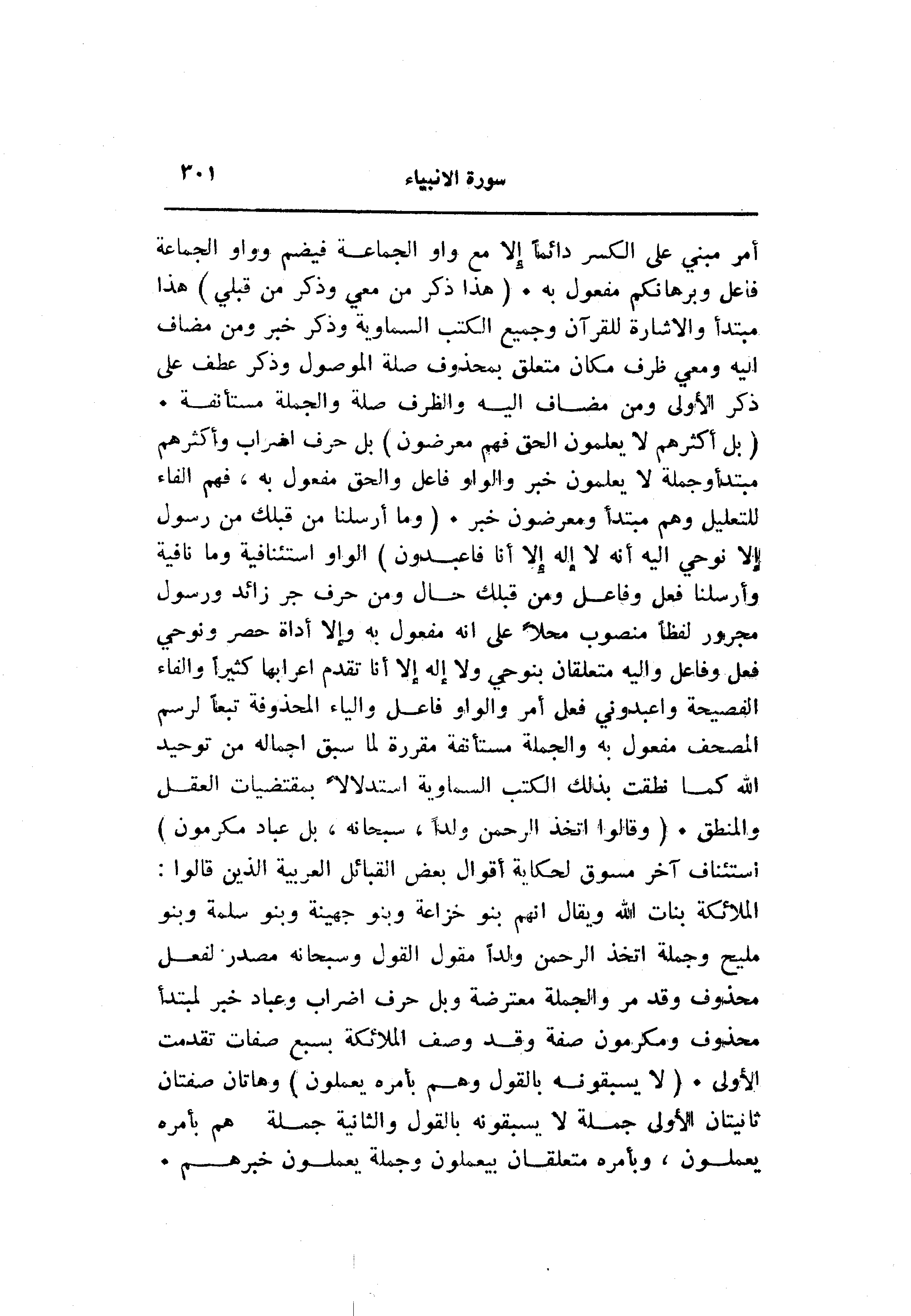 (بَلْ أَكْثَرُهُمْ لا يَعْلَمُونَ الْحَقَّ فَهُمْ مُعْرِضُونَ) بل حرف إضراب وأكثرهم مبتدأ وجملة لا يعلمون خبر والواو فاعل والحق مفعول به، فهم الفاء للتعليل وهم مبتدأ ومعرضون خبر. (وَما أَرْسَلْنا مِنْ قَبْلِكَ مِنْ رَسُولٍ إِلَّا نُوحِي إِلَيْهِ أَنَّهُ لا إِلهَ إِلَّا أَنَا فَاعْبُدُونِ) الواو استئنافية وما نافية وأرسلنا فعل وفاعل ومن قبلك حال ومن حرف جر زائد ورسول مجرور لفظا منصوب محلا على انه مفعول به وإلا أداة حصر ونوحي فعل وفاعل واليه متعلقان بنوحي ولا إله إلا أنا تقدم اعرابها كثيرا والفاء الفصيحة واعبدوني فعل أمر والواو فاعل والياء المحذوفة تبعا لرسم المصحف مفعول به والجملة مستأنفة مقررة لما سبق اجماله من توحيد الله كما نطقت بذلك الكتب السماوية استدلالا بمقتضيات العقل والمنطق. (وَقالُوا اتَّخَذَ الرَّحْمنُ وَلَداً، سُبْحانَهُ، بَلْ عِبادٌ مُكْرَمُونَ) استئناف آخر مسوق لحكاية أقوال بعض القبائل العربية الذين قالوا: