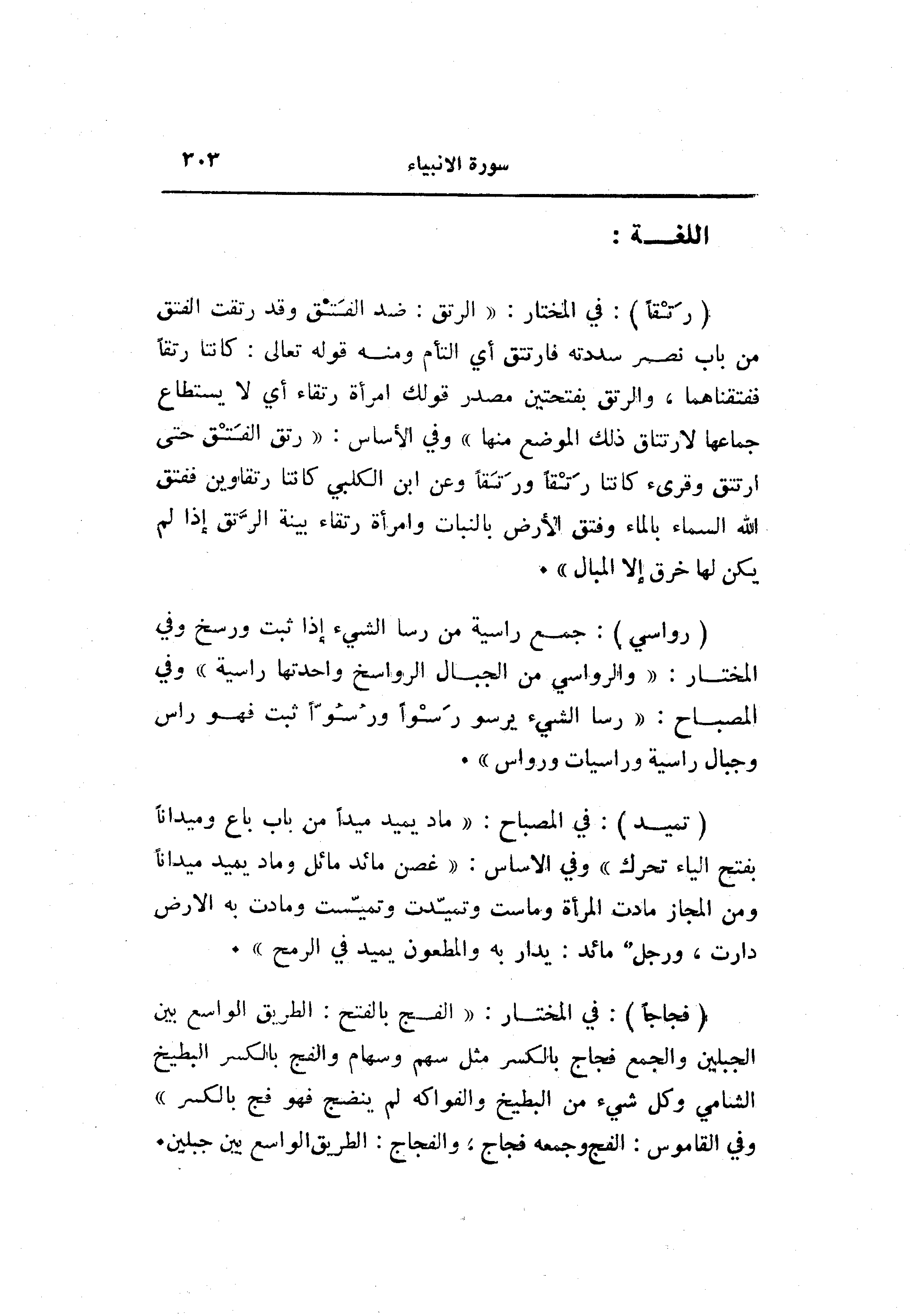 (فِجاجاً) : في المختار: «الفج بالفتح: الطريق الواسع بين الجبلين والجمع فجاج بالكسر مثل سهم وسهام والفج بالكسر البطيخ الشامي وكل شيء من البطيخ والفواكه لم ينضج فهو فج بالكسر» وفي القاموس: الفج وجمعه فجاج، والفجاج: الطريق الواسع بين جبلين.