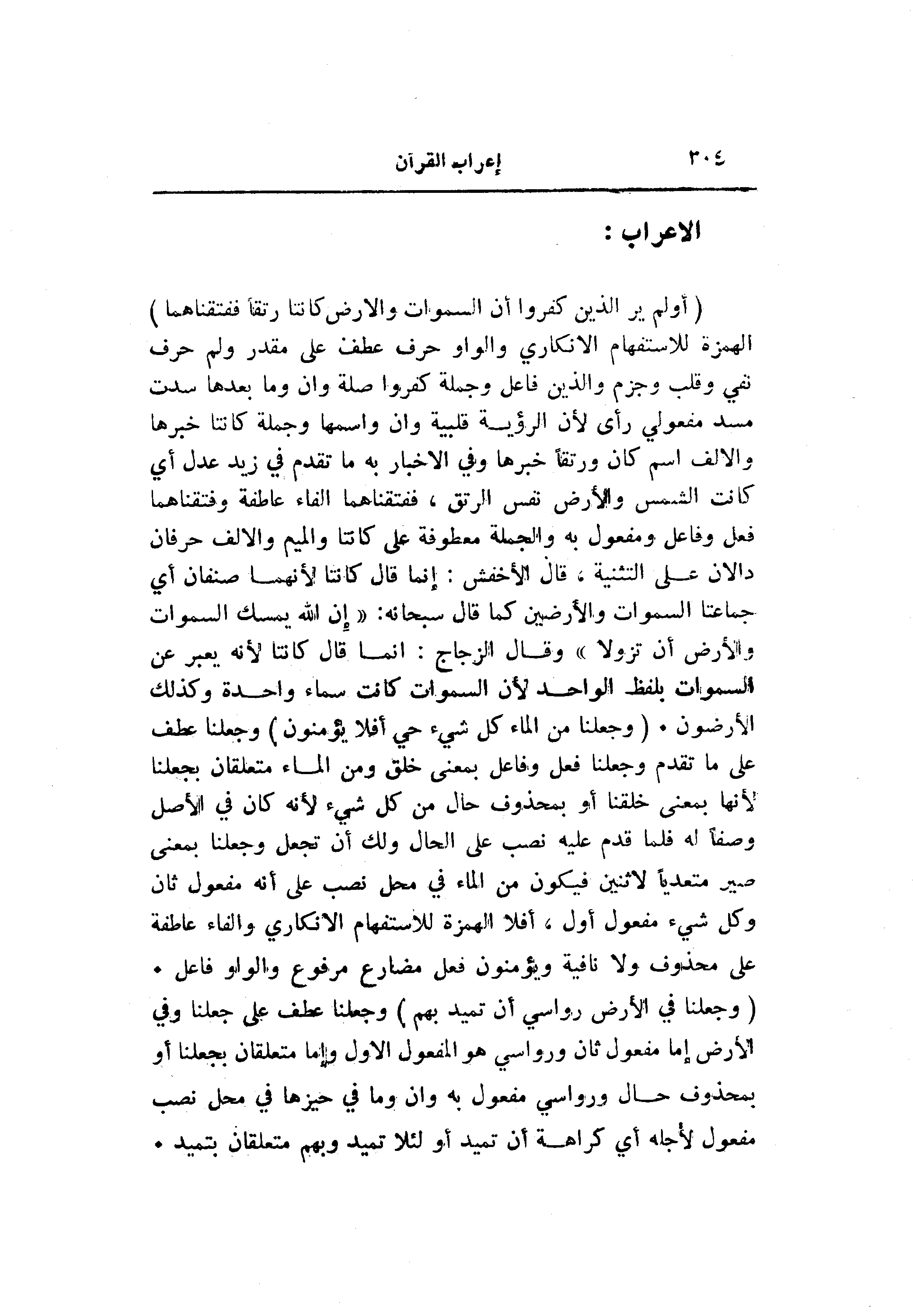 (أَوَلَمْ يَرَ الَّذِينَ كَفَرُوا أَنَّ السَّماواتِ وَالْأَرْضَ كانَتا رَتْقاً فَفَتَقْناهُما) الهمزة للاستفهام الانكاري والواو حرف عطف على مقدر ولم حرف نفي وقلب وجزم والذين فاعل وجملة كفروا صلة وان وما بعدها سدت مسد مفعولي رأى لأن الرؤية قلبية وان واسمها وجملة كانتا خبرها والالف اسم كان ورتقا خبرها وفي الاخبار به ما تقدم في زيد عدل أي كانت الشمس والأرض نفس الرتق، ففتقناهما الفاء عاطفة وفتقناهما فعل وفاعل ومفعول به والجملة معطوفة على كانتا والميم والالف حرفان دالان على التثنية، قال الأخفش: إنما قال كانتا لأنهما صنفان أي جماعتا السموات والأرضين كما قال سبحانه: «إِنَّ اللَّهَ يُمْسِكُ السَّماواتِ وَالْأَرْضَ أَنْ تَزُولا» وقال الزجاج: انما قال كانتا لأنه يعبر عن السموات بلفظ الواحد لأن السموات كانت سماء واحدة وكذلك الأرضون. (وَجَعَلْنا مِنَ الْماءِ كُلَّ شَيْءٍ حَيٍّ أَفَلا يُؤْمِنُونَ) وجعلنا عطف على ما تقدم وجعلنا فعل وفاعل بمعنى خلق ومن الماء متعلقان بجعلنا لأنها بمعنى خلقنا أو بمحذوف حال من كل شيء لأنه كان في الأصل وصفا له فلما قدم عليه نصب على الحال ولك أن تجعل وجعلنا بمعنى صير متعديا لاثنين فيكون من الماء في محل نصب على أنه مفعول ثان وكل شيء مفعول أول، أفلا الهمزة للاستفهام الانكاري والفاء عاطفة على محذوف ولا نافية ويؤمنون فعل مضارع مرفوع والواو فاعل.