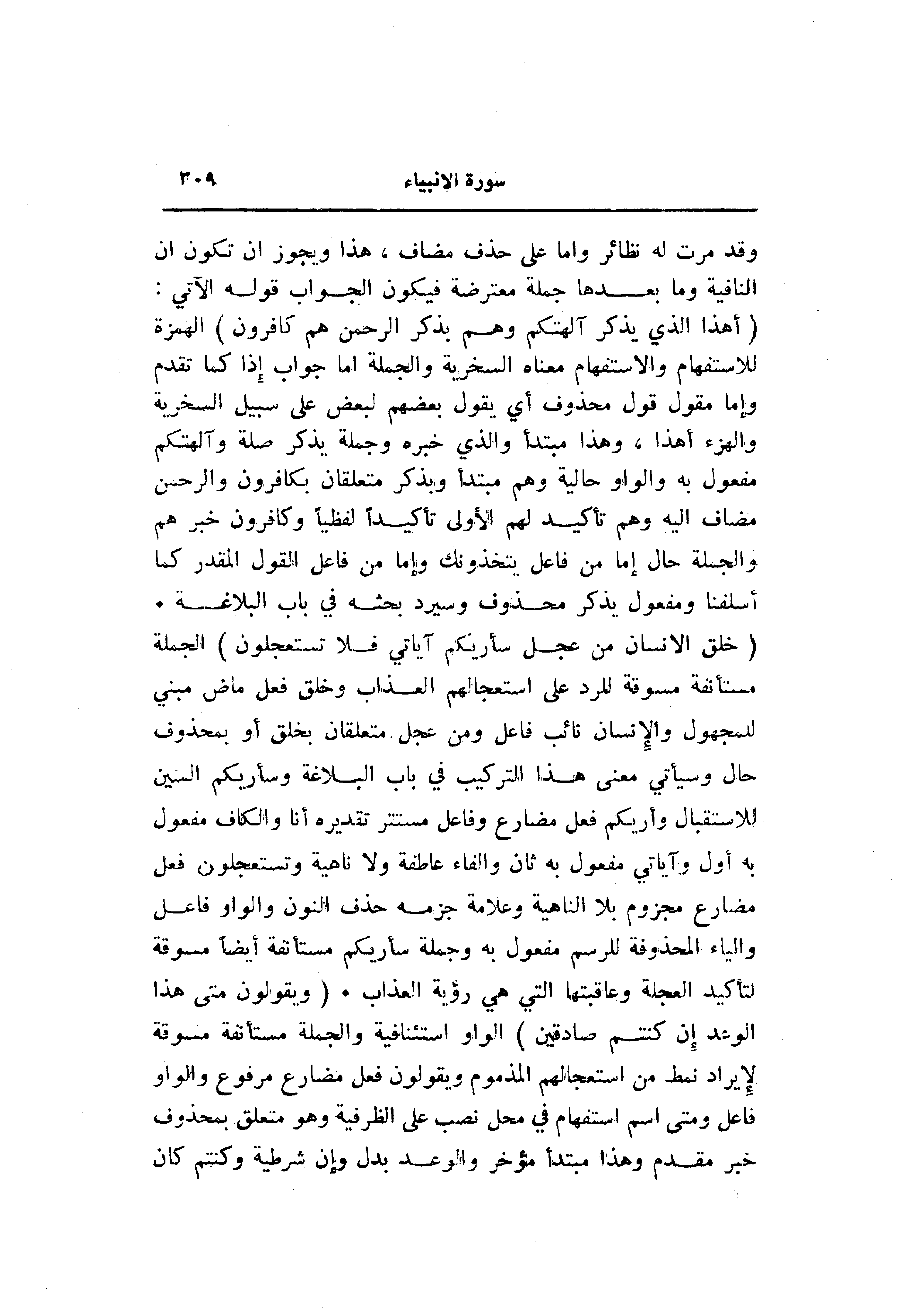 (خُلِقَ الْإِنْسانُ مِنْ عَجَلٍ سَأُرِيكُمْ آياتِي فَلا تَسْتَعْجِلُونِ) الجملة مستأنفة مسوقة للرد على استعجالهم العذاب وخلق فعل ماض مبني للمجهول والإنسان نائب فاعل ومن عجل متعلقان بخلق أو بمحذوف حال وسيأتي معنى هذا التركيب في باب البلاغة وسأريكم السنين للاستقبال وأريكم فعل مضارع وفاعل مستتر تقديره أنا والكاف مفعول به أول وآياتي مفعول به ثان والفاء عاطفة ولا ناهية وتستعجلون فعل مضارع مجزوم بلا الناهية وعلامة جزمه حذف النون والواو فاعل والياء المحذوفة للرسم مفعول به وجملة سأريكم مستأنفة أيضا مسوقة لتأكيد العجلة وعاقبتها التي هي رؤية العذاب. (وَيَقُولُونَ مَتى هذَا الْوَعْدُ إِنْ كُنْتُمْ صادِقِينَ) الواو استئنافية والجملة مستأنفة مسوقة لإيراد نمط من استعجالهم المذموم ويقولون فعل مضارع مرفوع والواو فاعل ومتى اسم استفهام في محل نصب على الظرفية وهو متعلق بمحذوف خبر مقدم وهذا مبتدأ مؤخر والوعد بدل وإن شرطية وكنتم كان