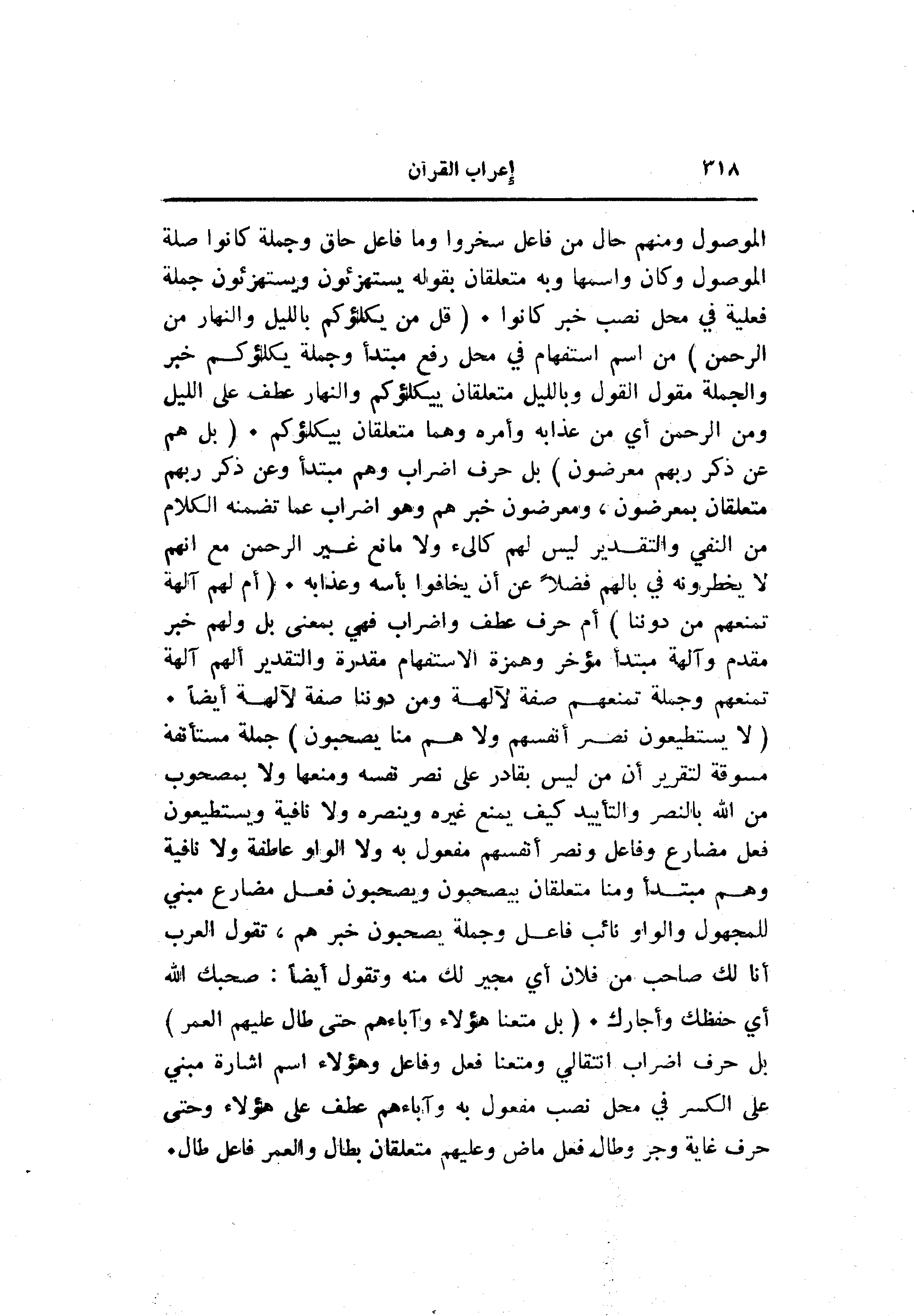 الموصول ومنهم حال من فاعل سخروا وما فاعل حاق وجملة كانوا صلة الموصول وكان واسمها وبه متعلقان بقوله يستهزئون ويستهزئون جملة فعلية في محل نصب خبر كانوا. (قُلْ مَنْ يَكْلَؤُكُمْ بِاللَّيْلِ وَالنَّهارِ مِنَ الرَّحْمنِ) من اسم استفهام في محل رفع مبتدأ وجملة يكلؤكم خبر والجملة مقول القول وبالليل متعلقان ييكلؤكم والنهار عطف على الليل ومن الرحمن أي من عذابه وأمره وهما متعلقان بيكلؤكم. (بَلْ هُمْ عَنْ ذِكْرِ رَبِّهِمْ مُعْرِضُونَ) بل حرف إضراب وهم مبتدأ وعن ذكر ربهم متعلقان بمعرضون، ومعرضون خبر هم وهو إضراب عما تضمنه الكلام من النفي والتقدير ليس لهم كالىء ولا مانع غير الرحمن مع انهم لا يخطرونه في بالهم فضلا عن أن يخافوا بأسه وعذابه. (أَمْ لَهُمْ آلِهَةٌ تَمْنَعُهُمْ مِنْ دُونِنا) أم حرف عطف وإضراب فهي بمعنى بل ولهم خبر مقدم وآلهة مبتدأ مؤخر وهمزة الاستفهام مقدرة والتقدير ألهم آلهة تمنعهم وجملة تمنعهم صفة لآلهة ومن دوننا صفة لآلهة أيضا.