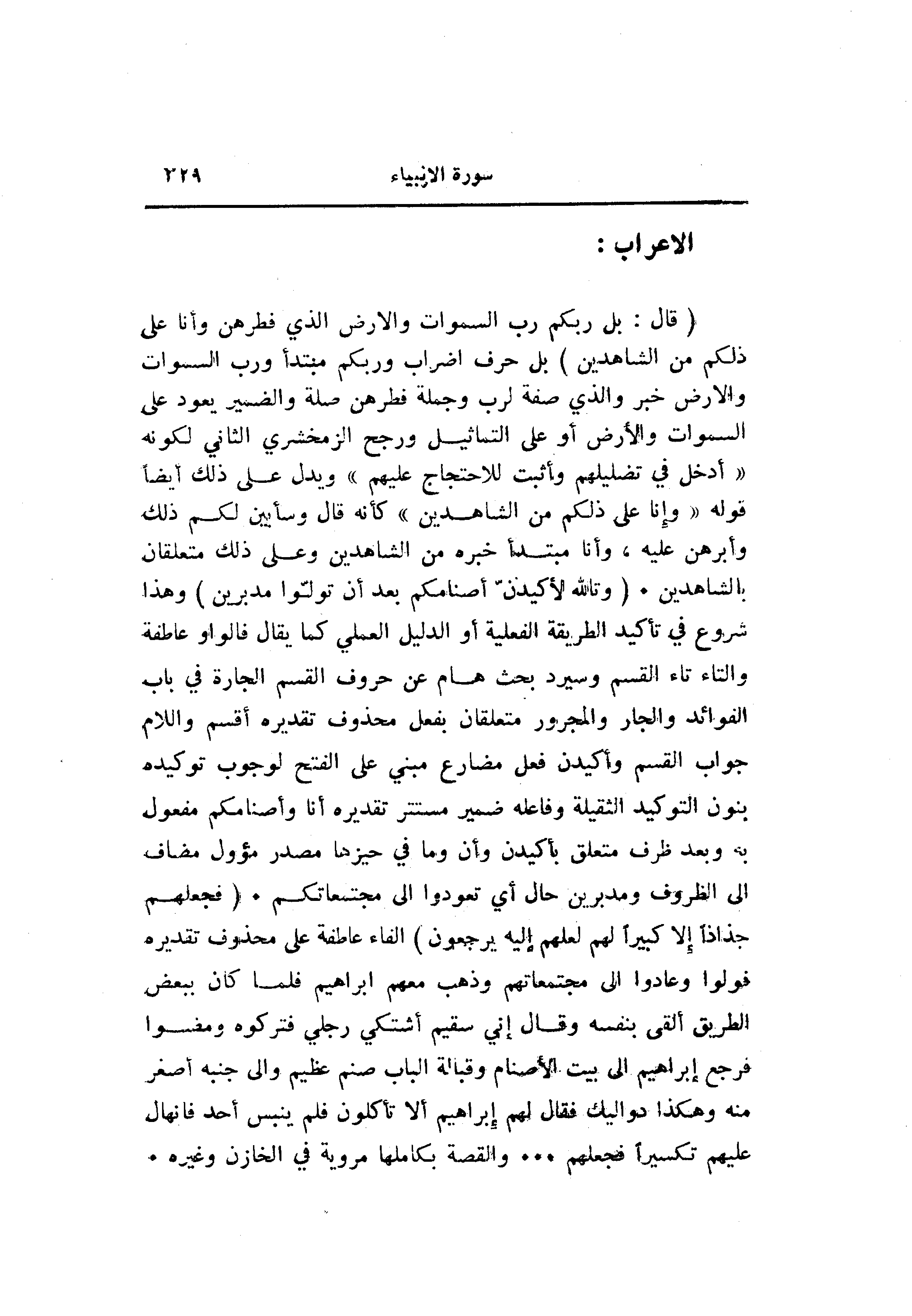 (قالَ: بَلْ رَبُّكُمْ رَبُّ السَّماواتِ وَالْأَرْضِ الَّذِي فَطَرَهُنَّ وَأَنَا عَلى ذلِكُمْ مِنَ الشَّاهِدِينَ) بل حرف إضراب وربكم مبتدأ ورب السموات والأرض خبر والذي صفة لرب وجملة فطرهن صلة والضمير يعود على السموات والأرض أو على التماثيل ورجح الزمخشري الثاني لكونه «أدخل في تضليلهم وأثبت للاحتجاج عليهم» ويدل على ذلك أيضا قوله «وَأَنَا عَلى ذلِكُمْ مِنَ الشَّاهِدِينَ» كأنه قال وسأبين لكم ذلك وأبرهن عليه، وأنا مبتدأ خبره من الشاهدين وعلى ذلك متعلقان بالشاهدين. (وَتَاللَّهِ لَأَكِيدَنَّ أَصْنامَكُمْ بَعْدَ أَنْ تُوَلُّوا مُدْبِرِينَ) وهذا شروع في تأكيد الطريقة الفعلية أو الدليل العملي كما يقال فالواو عاطفة والتاء تاء القسم وسيرد بحث هام عن حروف القسم الجارة في باب الفوائد والجار والمجرور متعلقان بفعل محذوف تقديره أقسم واللام جواب القسم وأكيدن فعل مضارع مبني على الفتح لوجوب توكيده بنون التوكيد الثقيلة وفاعله ضمير مستتر تقديره أنا وأصنامكم مفعول به وبعد ظرف متعلق بأكيدن وأن وما في حيزها مصدر مؤول مضاف الى الظروف ومدبرين حال أي تعودوا الى مجتمعاتكم. (فَجَعَلَهُمْ جُذاذاً إِلَّا كَبِيراً لَهُمْ لَعَلَّهُمْ إِلَيْهِ يَرْجِعُونَ) الفاء عاطفة على محذوف تقديره فولوا وعادوا الى مجتمعاتهم وذهب معهم ابراهيم فلما كان ببعض الطريق ألقى بنفسه وقال إني سقيم أشتكي رجلي فتركوه ومضوا فرجع إبراهيم الى بيت الأصنام وقبالة الباب صنم عظيم والى جنبه أصغر منه وهكذا دواليك فقال لهم إبراهيم ألا تأكلون فلم ينبس أحد فانهال عليهم تكسيرا فجعلهم ... والقصة بكاملها مروية في الخازن وغيره.