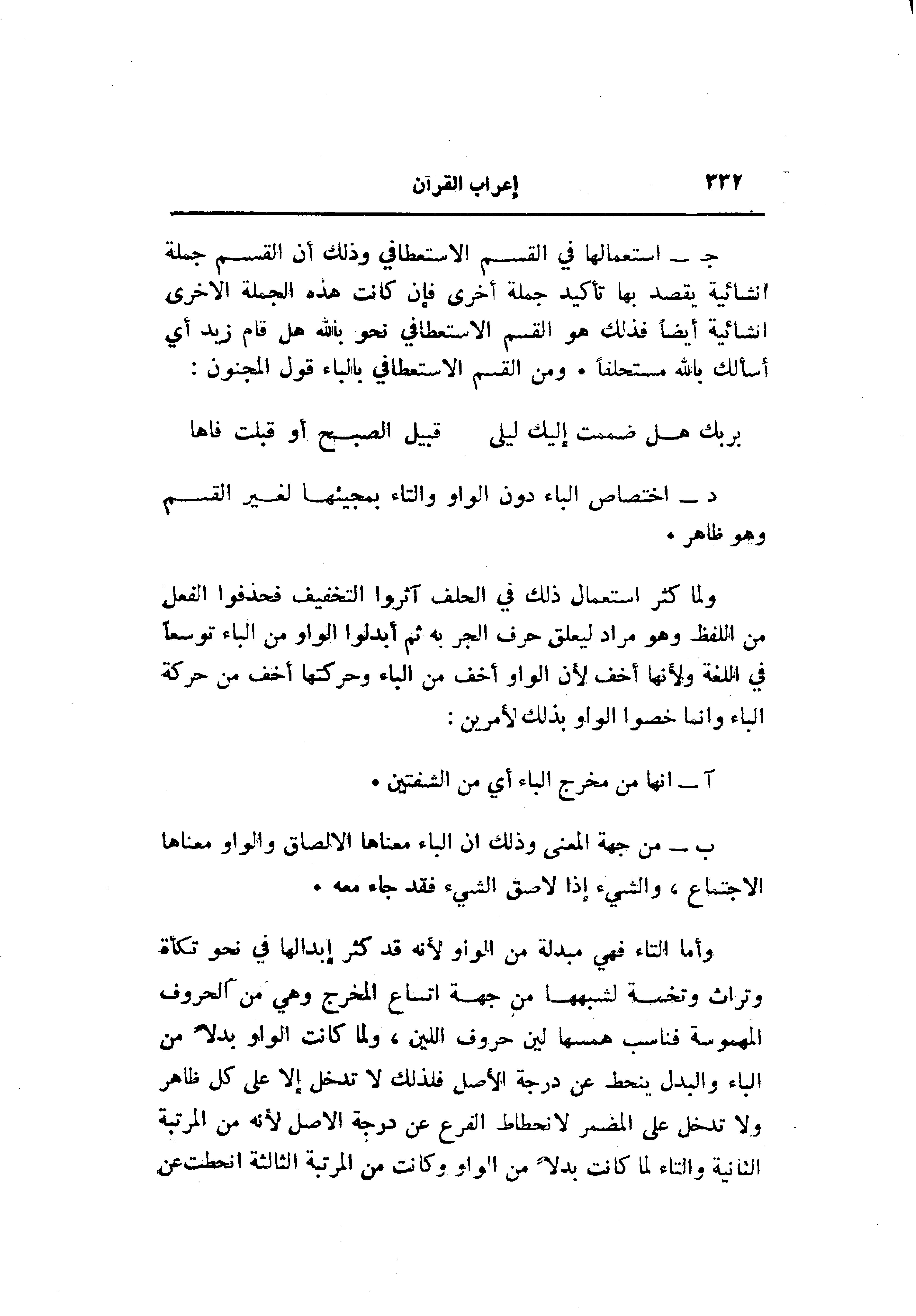 ولما كثر استعمال ذلك في الحلف آثروا التخفيف فحذفوا الفعل من اللفظ وهو مراد ليعلق حرف الجر به ثم أبدلوا الواو من الباء توسعا في اللغة ولأنها أخف لأن الواو أخف من الباء وحركتها أخف من حركة الباء وانما خصوا الواو بذلك لأمرين: