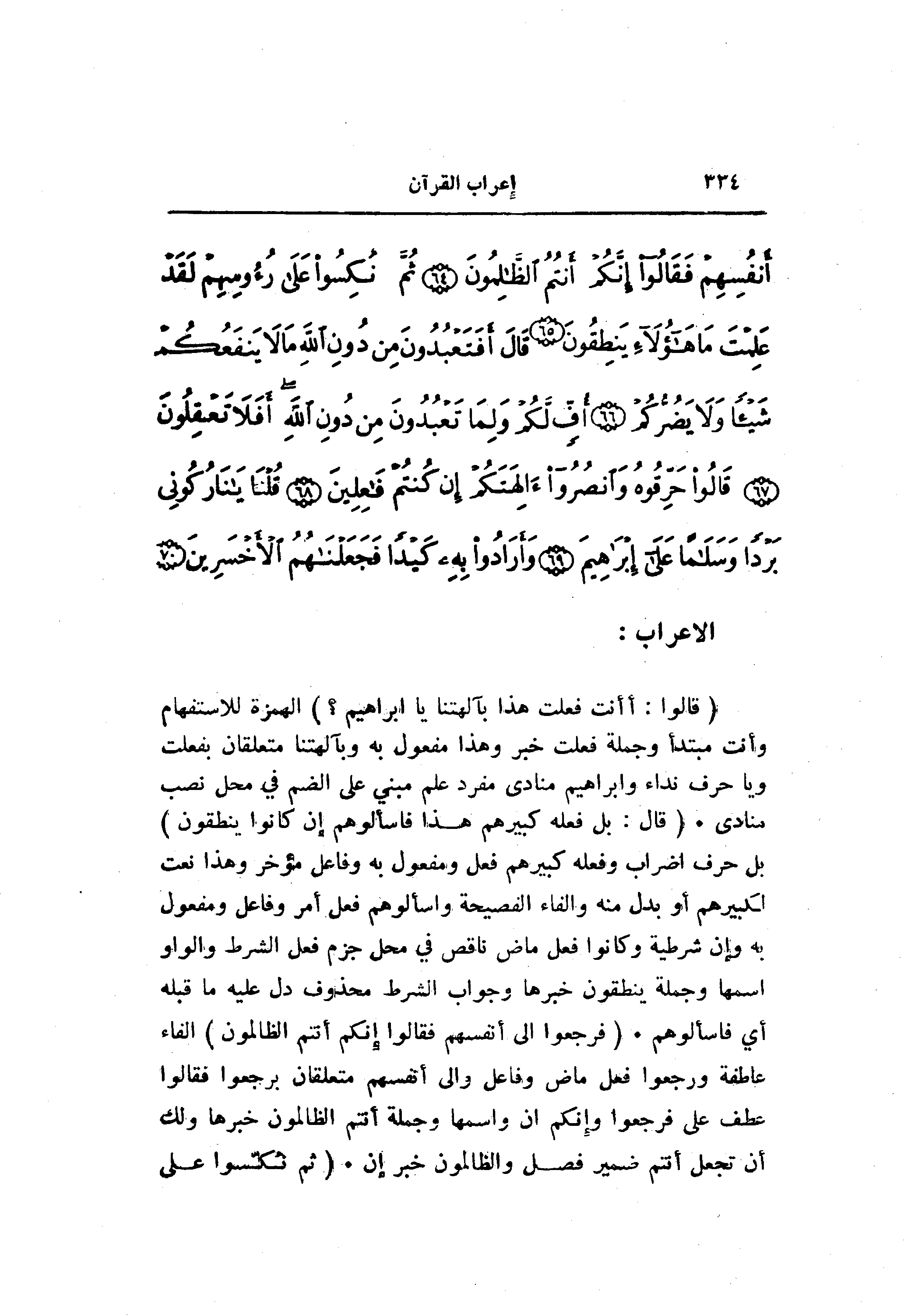 (قالُوا: أَأَنْتَ فَعَلْتَ هذا بِآلِهَتِنا يا إِبْراهِيمُ؟) الهمزة للاستفهام وأنت مبتدأ وجملة فعلت خبر وهذا مفعول به وبآلهتنا متعلقان بفعلت ويا حرف نداء وابراهيم منادى مفرد علم مبني على الضم في محل نصب منادى. (قالَ: بَلْ فَعَلَهُ كَبِيرُهُمْ هذا فَسْئَلُوهُمْ إِنْ كانُوا يَنْطِقُونَ) بل حرف إضراب وفعله كبيرهم فعل ومفعول به وفاعل مؤخر وهذا نعت لكبيرهم أو بدل منه والفاء الفصيحة واسألوهم فعل أمر وفاعل ومفعول به وإن شرطية وكانوا فعل ماض ناقص في محل جزم فعل الشرط والواو اسمها وجملة ينطقون خبرها وجواب الشرط محذوف دل عليه ما قبله أي فاسألوهم. (فَرَجَعُوا إِلى أَنْفُسِهِمْ فَقالُوا إِنَّكُمْ أَنْتُمُ الظَّالِمُونَ) الفاء عاطفة ورجعوا فعل ماض وفاعل والى أنفسهم متعلقان برجعوا فقالوا عطف على فرجعوا وإنكم ان واسمها وجملة أنتم الظالمون خبرها ولك أن تجعل أنتم ضمير فصل والظالمون خبر إن. (ثُمَّ نُكِسُوا عَلى