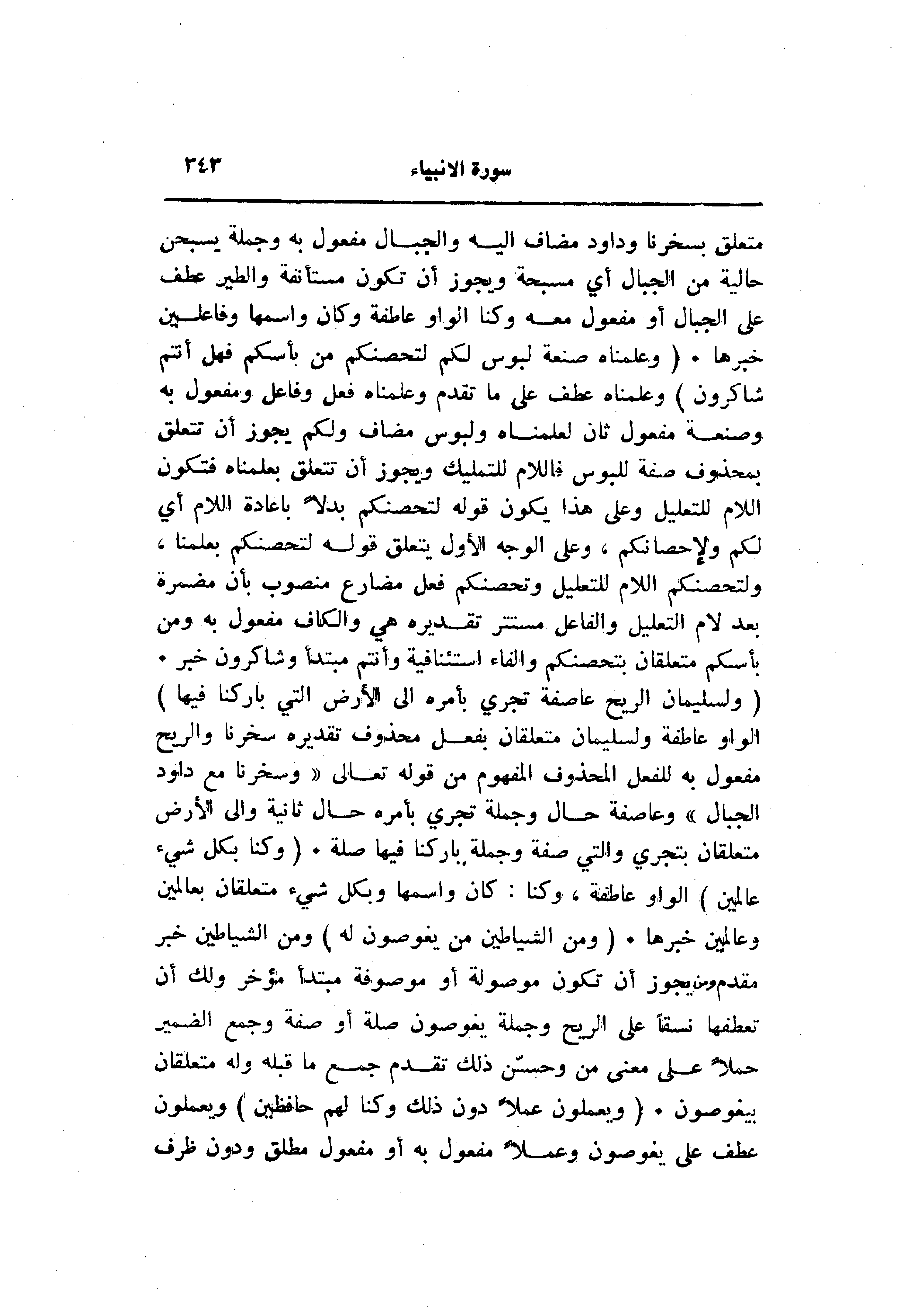متعلق بسخرنا وداود مضاف اليه والجبال مفعول به وجملة يسبحن حالية من الجبال أي مسبحة ويجوز أن تكون مستأنفة والطير عطف على الجبال أو مفعول معه وكنا الواو عاطفة وكان واسمها وفاعلين خبرها. (وَعَلَّمْناهُ صَنْعَةَ لَبُوسٍ لَكُمْ لِتُحْصِنَكُمْ مِنْ بَأْسِكُمْ فَهَلْ أَنْتُمْ شاكِرُونَ) وعلمناه عطف على ما تقدم وعلمناه فعل وفاعل ومفعول به وصنعة مفعول ثان لعلمناه ولبوس مضاف ولكم يجوز أن تتعلق بمحذوف صفة للبوس فاللام للتمليك ويجوز أن تتعلق بعلمناه فتكون اللام للتعليل وعلى هذا يكون قوله لتحصنكم بدلا باعادة اللام أي لكم ولإحصانكم، وعلى الوجه الأول يتعلق قوله لتحصنكم بعلمنا، ولتحصنكم اللام للتعليل وتحصنكم فعل مضارع منصوب بأن مضمرة بعد لام التعليل والفاعل مستتر تقديره هي والكاف مفعول به ومن بأسكم متعلقان بتحصنكم والفاء استئنافية وأنتم مبتدأ وشاكرون خبر.