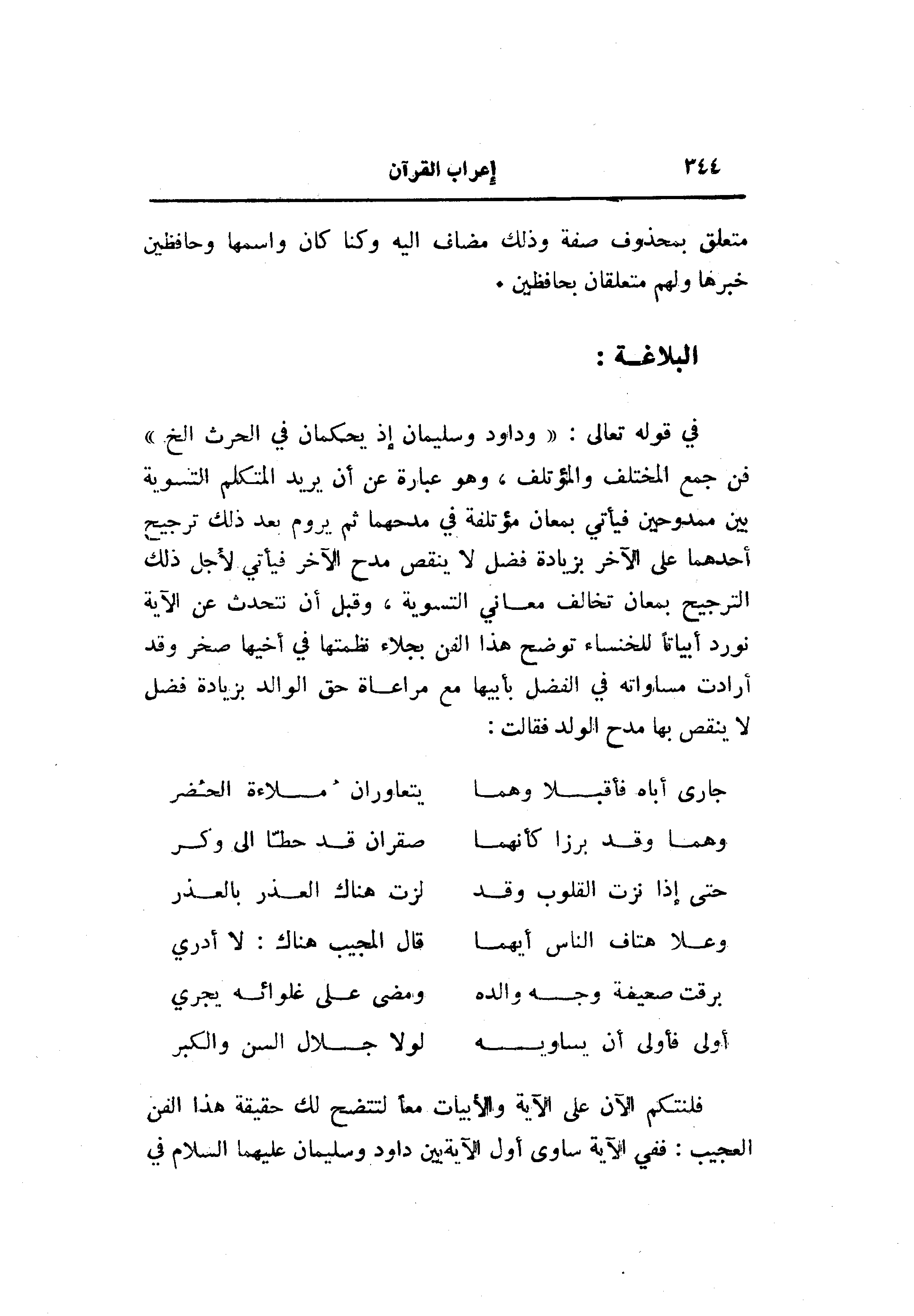 فلنتكم الآن على الآية والأبيات معا لتتضح لك حقيقة هذا الفن العجيب: ففي الآية ساوى أول الآية بين داود وسليمان عليهما السلام في