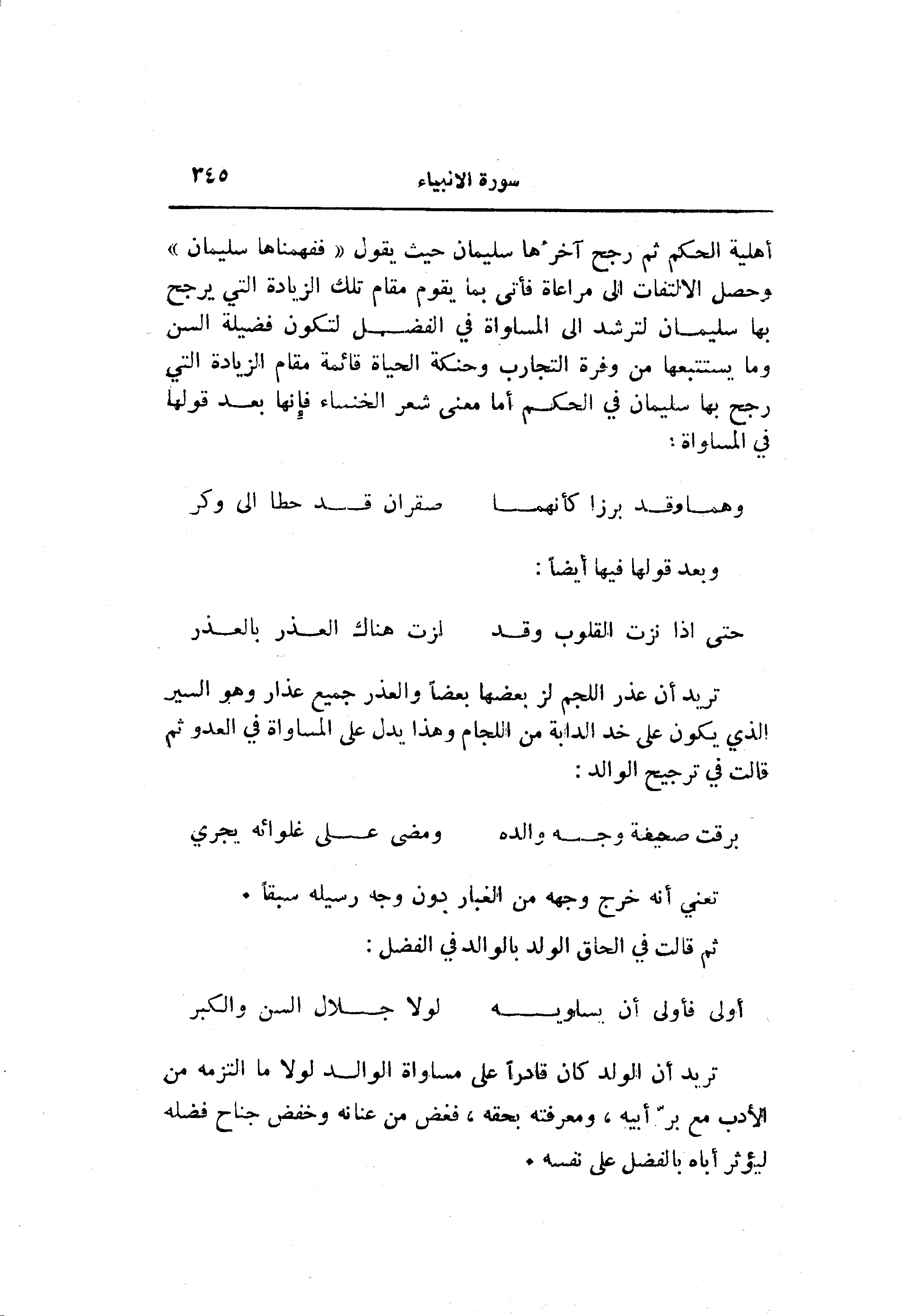 أهلية الحكم ثم رجح آخرها سليمان حيث يقول «فَفَهَّمْناها سُلَيْمانَ» وحصل الالتفات الى مراعاة فأتى بما يقوم مقام تلك الزيادة التي يرجح بها سليمان لترشد الى المساواة في الفضل لتكون فضيلة السن وما يستتبعها من وفرة التجارب وحنكة الحياة قائمة مقام الزيادة التي رجح بها سليمان في الحكم أما معنى شعر الخنساء فإنها بعد قولها في المساواة: