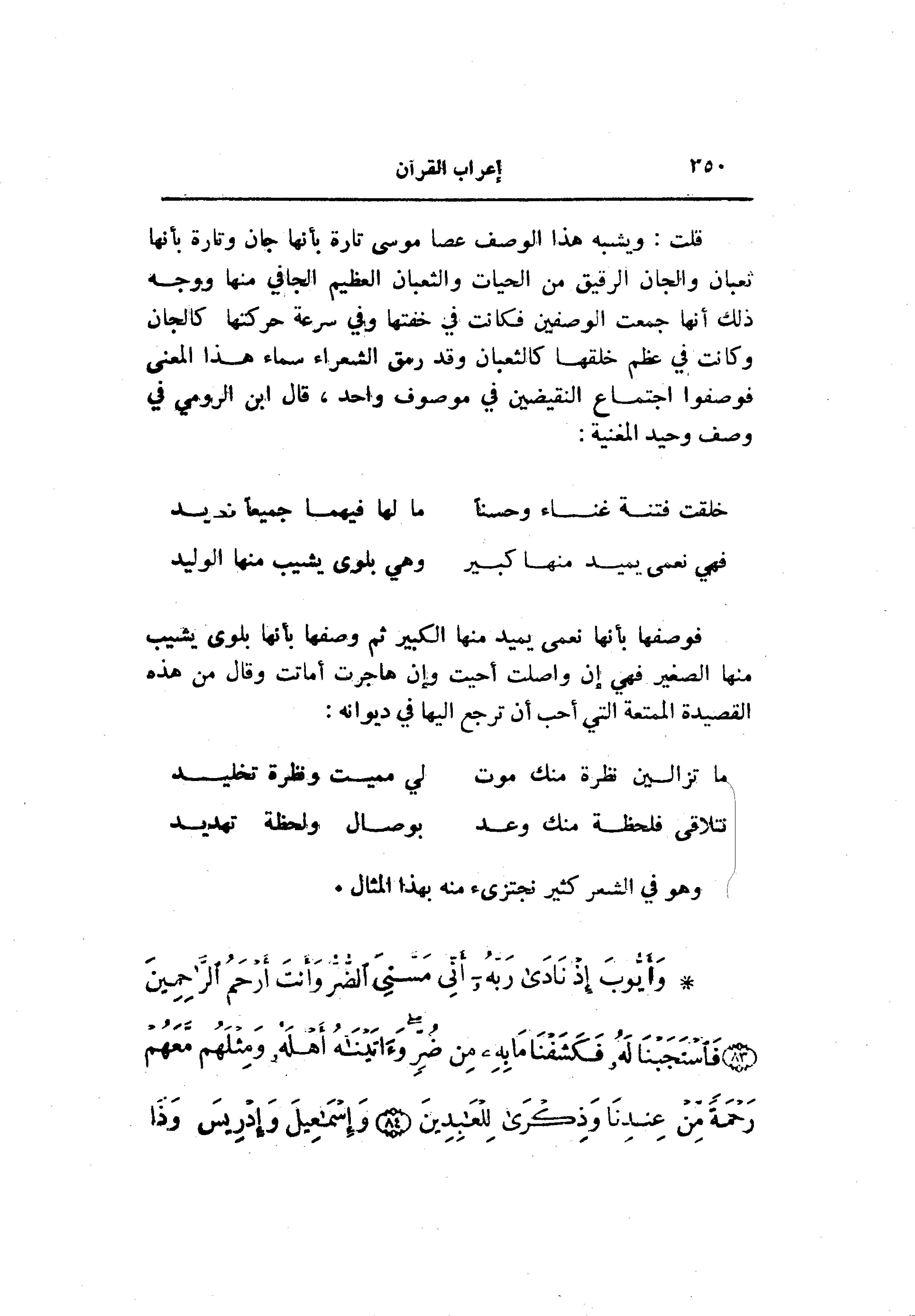 قلت: ويشبه هذا الوصف عصا موسى تارة بأنها جان وتارة بأنها ثعبان والجان الرقيق من الحيات والثعبان العظيم الجافي منها ووجه ذلك أنها جمعت الوصفين فكانت في خفتها وفي سرعة حركتها كالجان وكانت في عظم خلقها كالثعبان وقد رمق الشعراء سماء هذا المعنى فوصفوا اجتماع النقيضين في موصوف واحد، قال ابن الرومي في وصف وحيد المغنية: