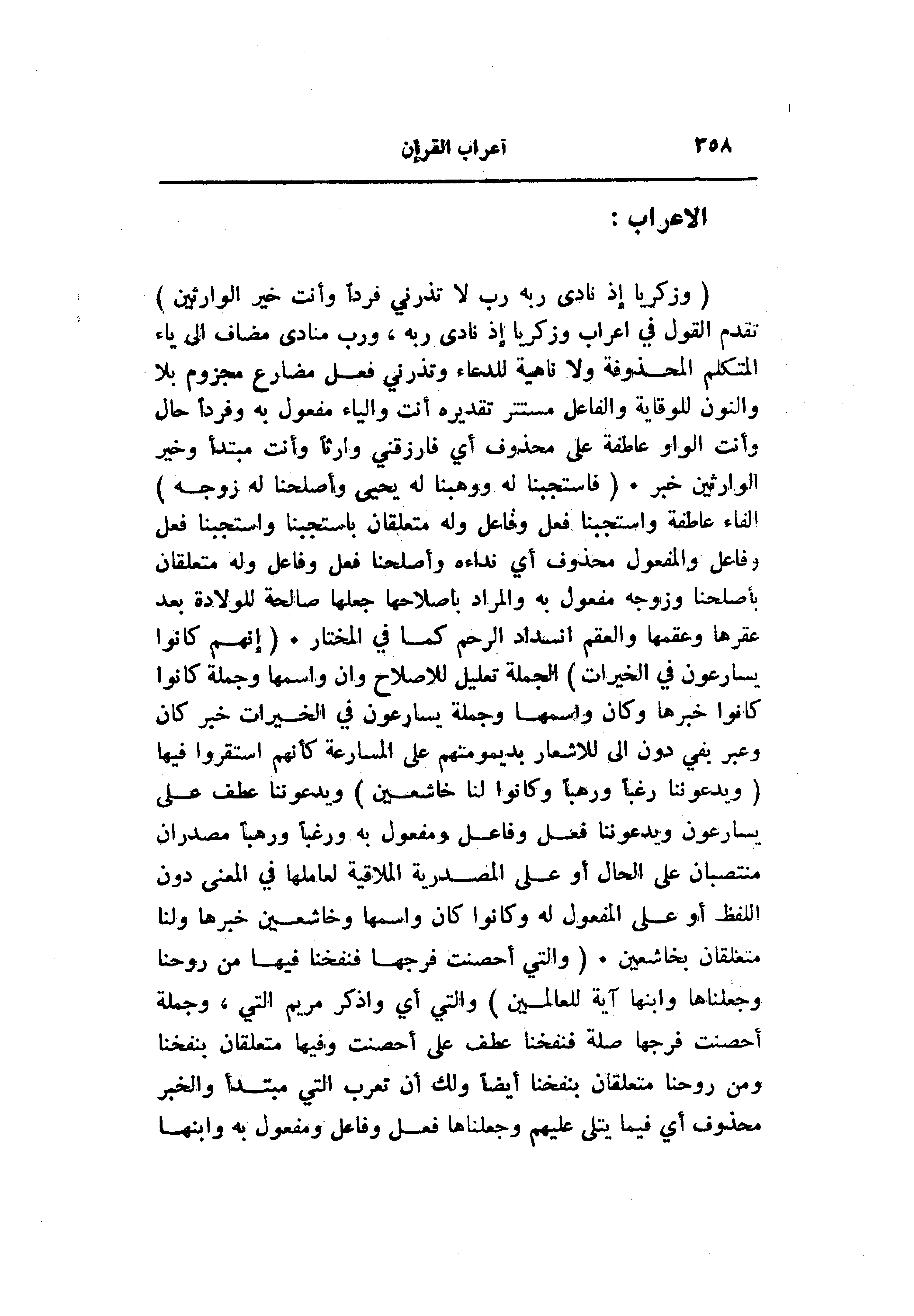 (وَزَكَرِيَّا إِذْ نادى رَبَّهُ رَبِّ لا تَذَرْنِي فَرْداً وَأَنْتَ خَيْرُ الْوارِثِينَ) تقدم القول في اعراب وزكريا إذ نادى ربه، ورب منادى مضاف الى ياء المتكلم المحذوفة ولا ناهية للدعاء وتذرني فعل مضارع مجزوم بلا والنون للوقاية والفاعل مستتر تقديره أنت والياء مفعول به وفردا حال وأنت الواو عاطفة على محذوف أي فارزقني وارثا وأنت مبتدأ وخير الوارثين خبر. (فَاسْتَجَبْنا لَهُ وَوَهَبْنا لَهُ يَحْيى وَأَصْلَحْنا لَهُ زَوْجَهُ) الفاء عاطفة واستجبنا فعل وفاعل وله متعلقان باستجبنا واستجبنا فعل وفاعل والمفعول محذوف أي نداءه وأصلحنا فعل وفاعل وله متعلقان بأصلحنا وزوجه مفعول به والمراد بإصلاحها جعلها صالحة للولادة بعد عقرها وعقمها والعقم انسداد الرحم كما في المختار. (إِنَّهُمْ كانُوا يُسارِعُونَ فِي الْخَيْراتِ) الجملة تعليل للاصلاح وان واسمها وجملة كانوا كانوا خبرها وكان واسمها وجملة يسارعون في الخيرات خبر كان وعبر بفي دون الى للاشعار بديمومتهم على المسارعة كأنهم استقروا فيها (وَيَدْعُونَنا رَغَباً وَرَهَباً وَكانُوا لَنا خاشِعِينَ) ويدعوننا عطف على يسارعون ويدعوننا فعل وفاعل ومفعول به ورغبا ورهبا مصدران منتصبان على الحال أو على المصدرية الملاقية لعاملها في المعنى دون اللفظ أو على المفعول له وكانوا كان واسمها وخاشعين خبرها ولنا متعلقان بخاشعين. (وَالَّتِي أَحْصَنَتْ فَرْجَها فَنَفَخْنا فِيها مِنْ رُوحِنا وَجَعَلْناها وَابْنَها آيَةً لِلْعالَمِينَ) والتي أي واذكر مريم التي، وجملة أحصنت فرجها صلة فنفخنا عطف على أحصنت وفيها متعلقان بنفخنا ومن روحنا متعلقان بنفخنا أيضا ولك أن تعرب التي مبتدأ والخبر محذوف أي فيما يتلى عليهم وجعلناها فعل وفاعل ومفعول به وابنها