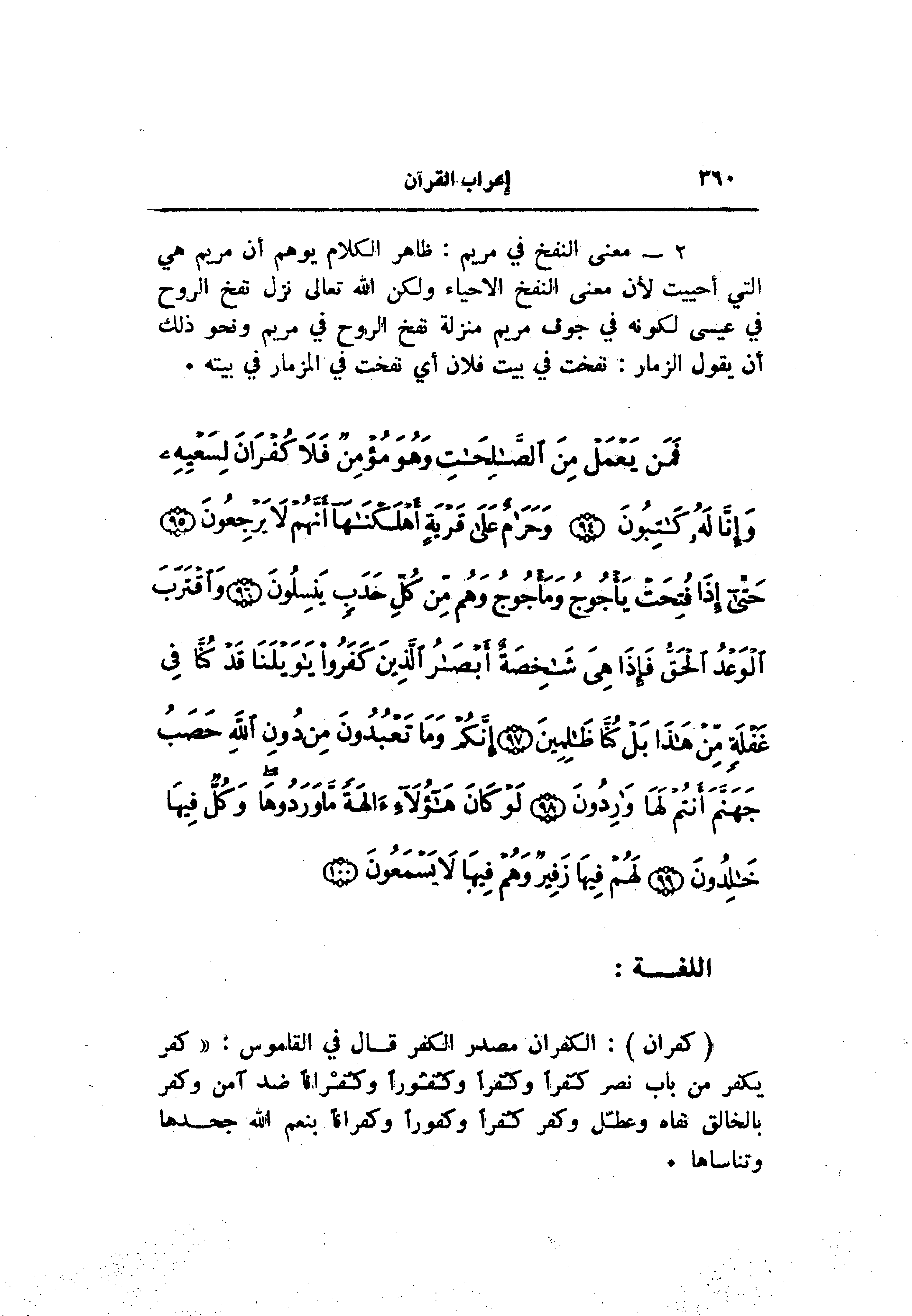 (كُفْرانَ) : الكفران مصدر الكفر قال في القاموس: «كفر يكفر من باب نصر كفرا وكفرا وكفورا وكفرانا ضد آمن وكفر بالخالق نفاه وعطّل وكفر كفرا وكفورا وكفرانا بنعم الله جحدها وتناساها.