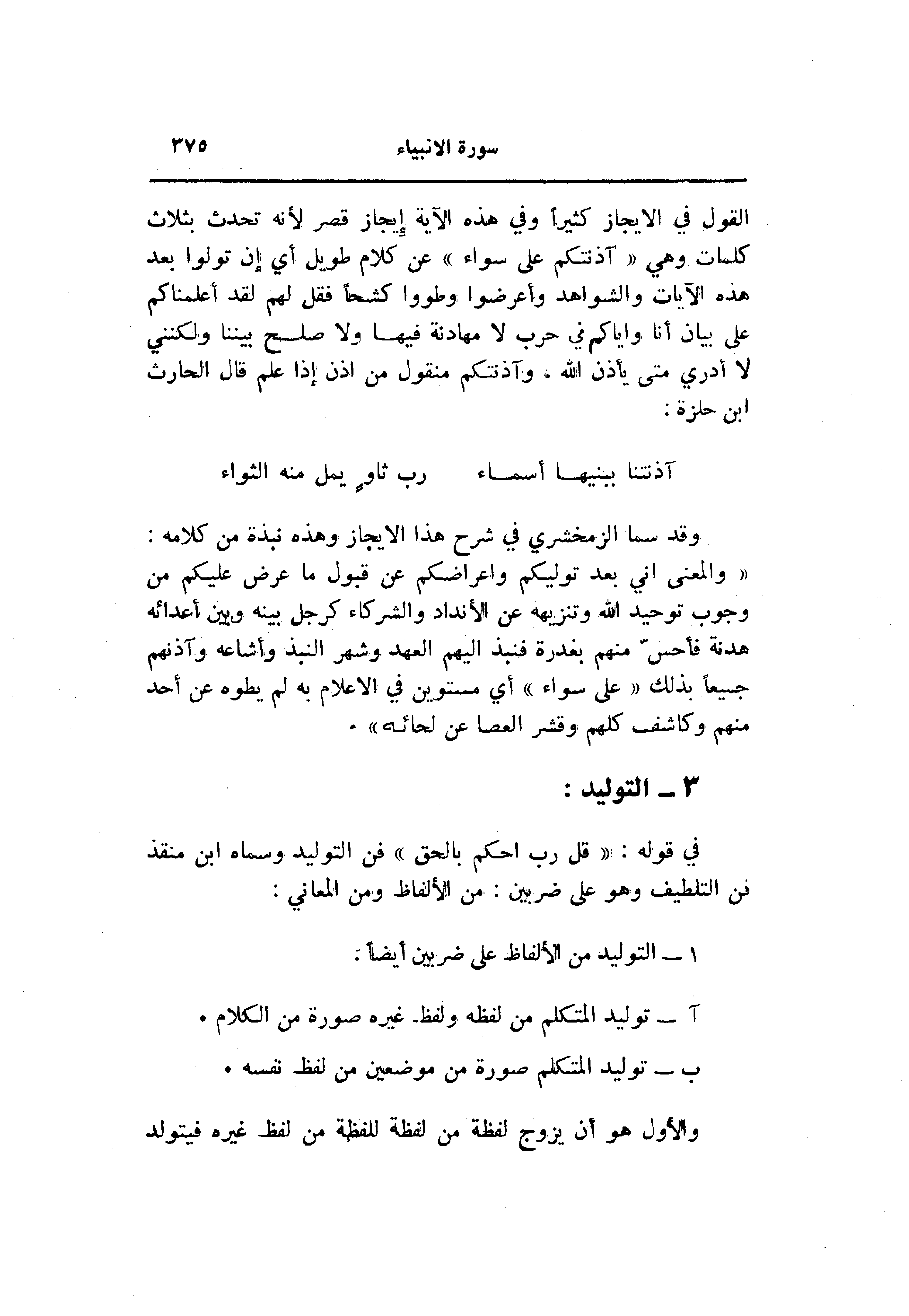 في قوله: «قل رب احكم بالحق» فن التوليد وسماه ابن منقذ فن التلطيف وهو على ضربين: من الألفاظ ومن المعاني: