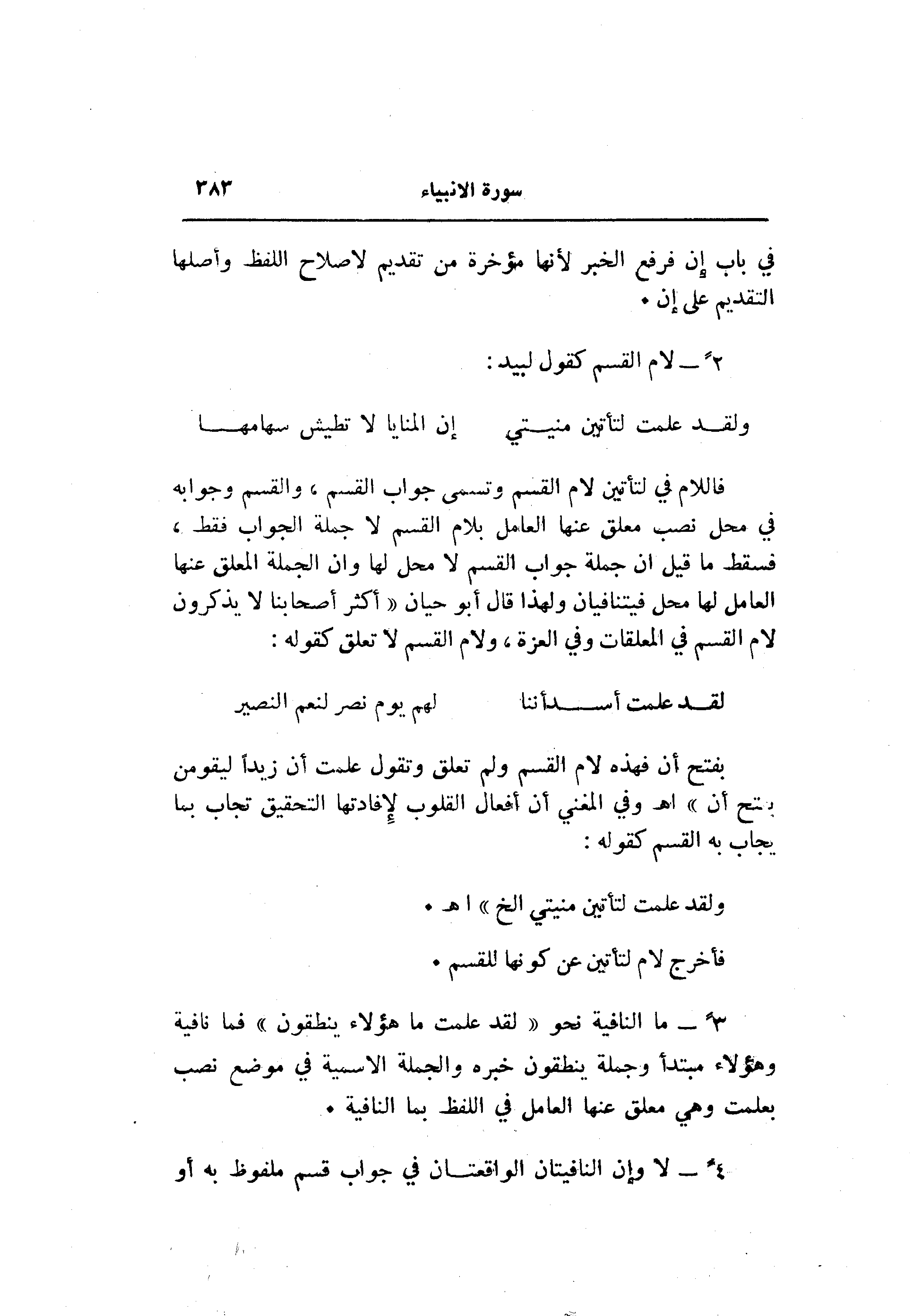 فاللام في لتأتين لام القسم وتسمى جواب القسم، والقسم وجوابه في محل نصب معلق عنها العامل بلام القسم لا جملة الجواب فقط، فسقط ما قيل ان جملة جواب القسم لا محل لها وان الجملة المعلق عنها العامل لها محل فيتنافيان ولهذا قال أبو حيان «أكثر أصحابنا لا يذكرون لام القسم في المعلقات وفي العزة، ولام القسم لا تعلق كقوله: