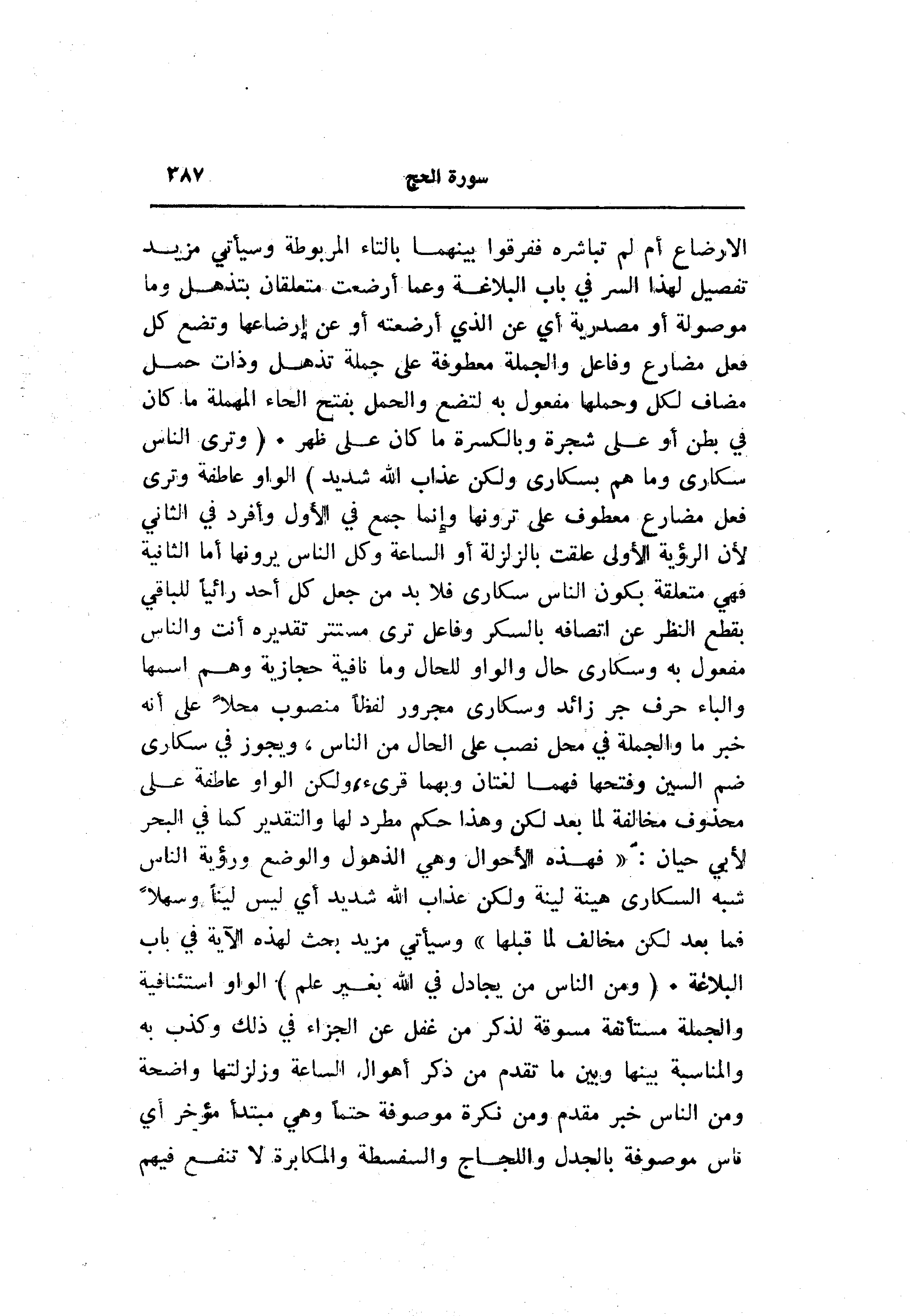 الواو عاطفة وترى فعل مضارع معطوف على ترونها وإنما جمع في الأول وأفرد في الثاني لأن الرؤية الأولى علقت بالزلزلة أو الساعة وكل الناس يرونها أما الثانية فهي متعلقة بكون الناس سكارى فلا بد من جعل كل أحد رائيا للباقي بقطع النظر عن اتصافه بالسكر وفاعل ترى مستتر تقديره أنت والناس مفعول به وسكارى حال والواو للحال وما نافية حجازية وهم اسمها والباء حرف جر زائد وسكارى مجرور لفظا منصوب محلا على أنه خبر ما والجملة في محل نصب على الحال من الناس، ويجوز في سكارى ضم السين وفتحها فهما لغتان وبهما قرىء، ولكن الواو عاطفة على محذوف مخالفة لما بعد لكن وهذا حكم مطرد لها والتقدير كما في البحر لأبي حيان: «فهذه الأحوال وهي الذهول والوضع ورؤية الناس شبه السكارى هينة لينة ولكن عذاب الله شديد أي ليس لينا وسهلا فما بعد لكن مخالف لما قبلها» وسيأتي مزيد بحث لهذه الآية في باب البلاغة. (وَمِنَ النَّاسِ مَنْ يُجادِلُ فِي اللَّهِ بِغَيْرِ عِلْمٍ) الواو استئنافية والجملة مستأنفة مسوقة لذكر من غفل عن الجزاء في ذلك وكذب به والمناسبة بينها وبين ما تقدم من ذكر أهوال الساعة وزلزلتها واضحة ومن الناس خبر مقدم ومن نكرة موصوفة حتما وهي مبتدأ مؤخر أي ناس موصوفة بالجدل واللجاج والسفسطة والمكابرة لا تنفع فيهم