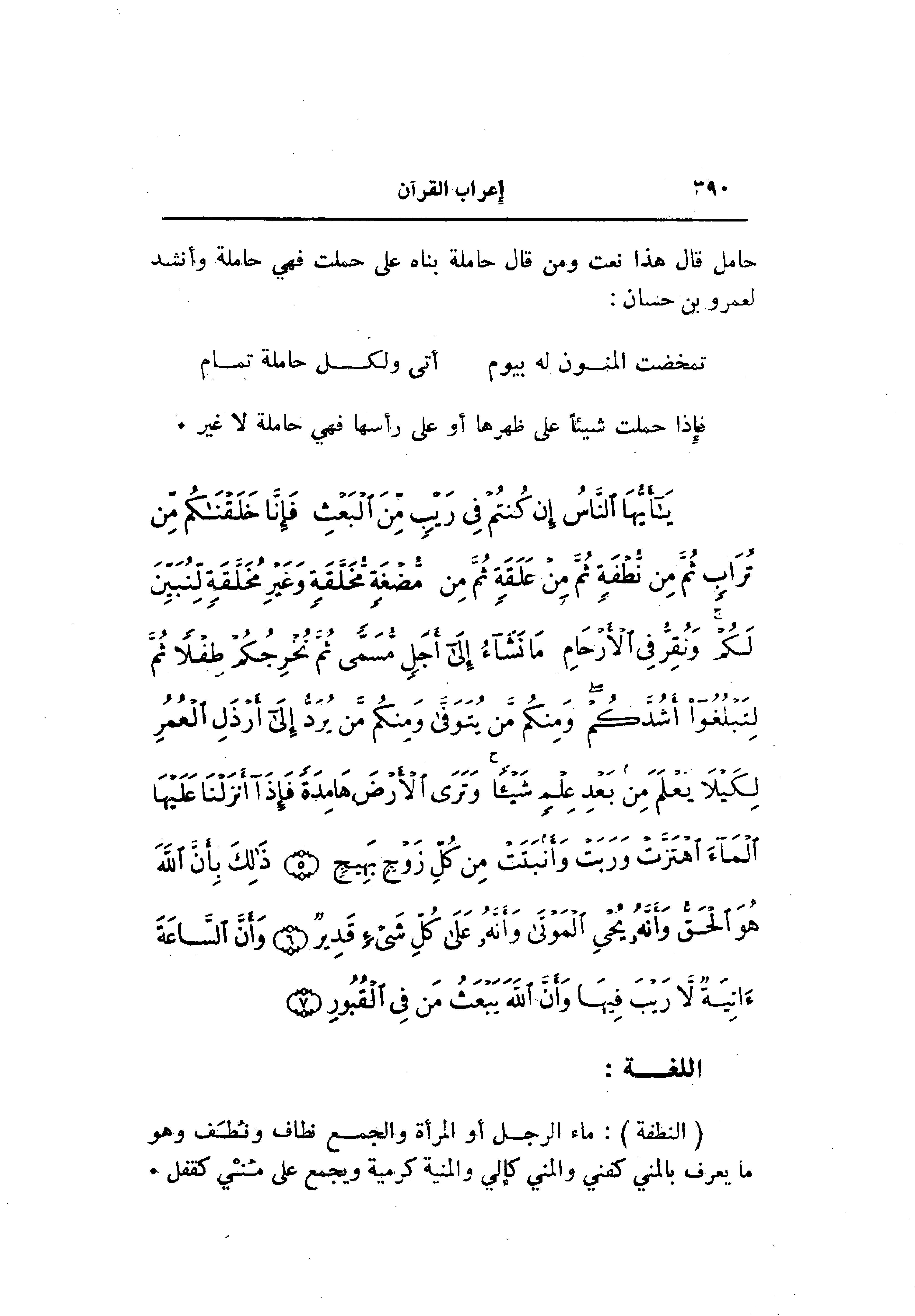 يا أَيُّهَا النَّاسُ إِنْ كُنْتُمْ فِي رَيْبٍ مِنَ الْبَعْثِ فَإِنَّا خَلَقْناكُمْ مِنْ تُرابٍ ثُمَّ مِنْ نُطْفَةٍ ثُمَّ مِنْ عَلَقَةٍ ثُمَّ مِنْ مُضْغَةٍ مُخَلَّقَةٍ وَغَيْرِ مُخَلَّقَةٍ لِنُبَيِّنَ لَكُمْ وَنُقِرُّ فِي الْأَرْحامِ ما نَشاءُ إِلى أَجَلٍ مُسَمًّى ثُمَّ نُخْرِجُكُمْ طِفْلاً ثُمَّ لِتَبْلُغُوا أَشُدَّكُمْ وَمِنْكُمْ مَنْ يُتَوَفَّى وَمِنْكُمْ مَنْ يُرَدُّ إِلى أَرْذَلِ الْعُمُرِ لِكَيْلا يَعْلَمَ مِنْ بَعْدِ عِلْمٍ شَيْئاً وَتَرَى الْأَرْضَ هامِدَةً فَإِذا أَنْزَلْنا عَلَيْهَا الْماءَ اهْتَزَّتْ وَرَبَتْ وَأَنْبَتَتْ مِنْ كُلِّ زَوْجٍ بَهِيجٍ (5) ذلِكَ بِأَنَّ اللَّهَ هُوَ الْحَقُّ وَأَنَّهُ يُحْيِ الْمَوْتى وَأَنَّهُ عَلى كُلِّ شَيْءٍ قَدِيرٌ (6) وَأَنَّ السَّاعَةَ آتِيَةٌ لا رَيْبَ فِيها وَأَنَّ اللَّهَ يَبْعَثُ مَنْ فِي الْقُبُورِ (7)