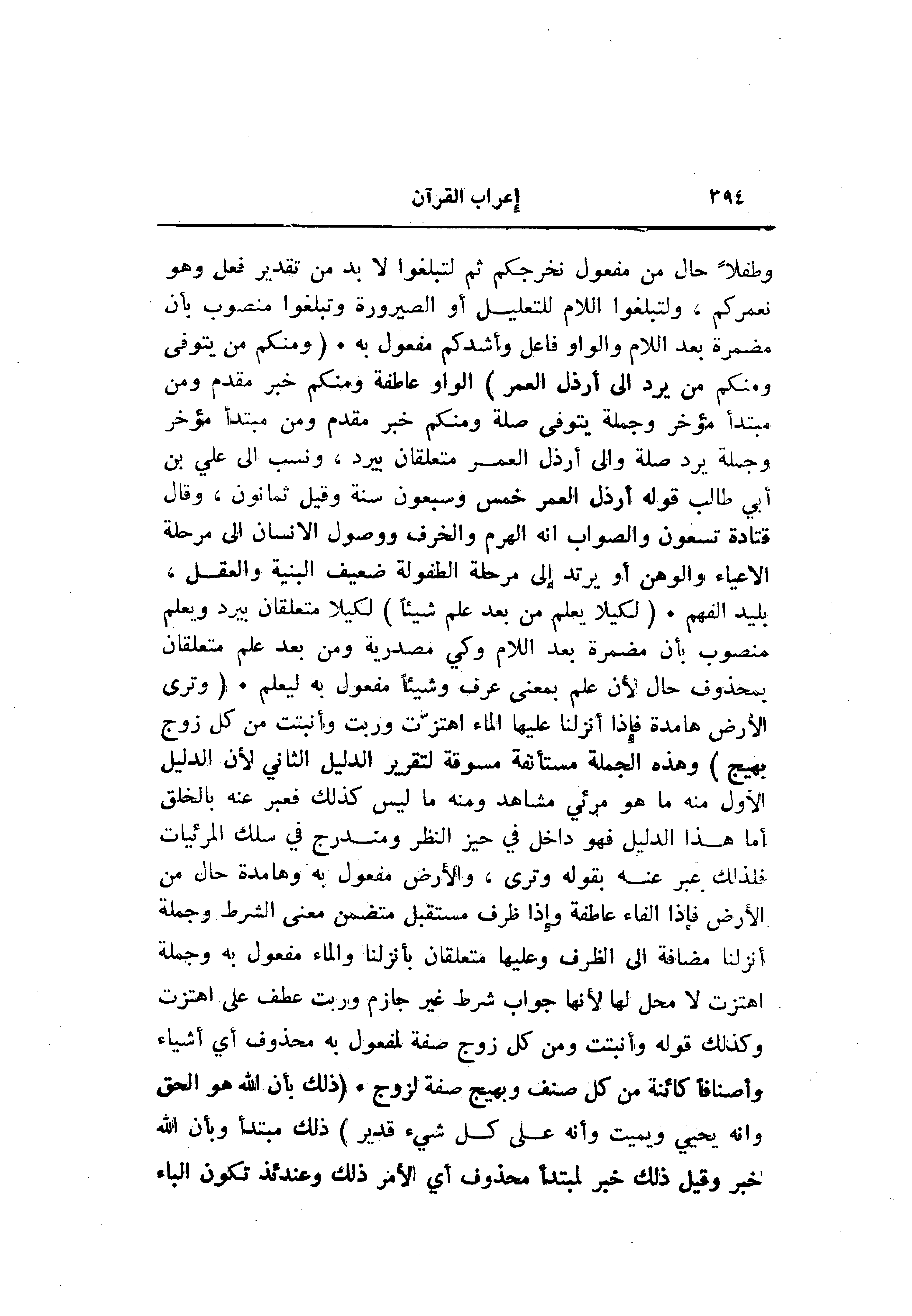 وطفلا حال من مفعول نخرجكم ثم لتبلغوا لا بد من تقدير فعل وهو نعمركم، ولتبلغوا اللام للتعليل أو الصيرورة وتبلغوا منصوب بأن مضمرة بعد اللام والواو فاعل وأشدكم مفعول به. (وَمِنْكُمْ مَنْ يُتَوَفَّى وَمِنْكُمْ مَنْ يُرَدُّ إِلى أَرْذَلِ الْعُمُرِ) الواو عاطفة ومنكم خبر مقدم ومن مبتدأ مؤخر وجملة يتوفى صلة ومنكم خبر مقدم ومن مبتدأ مؤخر وجملة يرد صلة والى أرذل العمر متعلقان بيرد، ونسب الى علي بن أبي طالب قوله أرذل العمر خمس وسبعون سنة وقيل ثمانون، وقال قتادة تسعون والصواب انه الهرم والخرف ووصول الإنسان الى مرحلة الاعياء والوهن أو يرتد إلى مرحلة الطفولة ضعيف البنية والعقل، بليد الفهم. (لِكَيْلا يَعْلَمَ مِنْ بَعْدِ عِلْمٍ شَيْئاً) لكيلا متعلقان بيرد ويعلم منصوب بأن مضمرة بعد اللام وكي مصدرية ومن بعد علم متعلقان بمحذوف حال لأن علم بمعنى عرف وشيئا مفعول به ليعلم. (وَتَرَى الْأَرْضَ هامِدَةً فَإِذا أَنْزَلْنا عَلَيْهَا الْماءَ اهْتَزَّتْ وَرَبَتْ وَأَنْبَتَتْ مِنْ كُلِّ زَوْجٍ بَهِيجٍ) وهذه الجملة مستأنفة مسوقة لتقرير الدليل الثاني لأن الدليل الأول منه ما هو مرئي مشاهد ومنه ما ليس كذلك فعبر عنه بالخلق أما هذا الدليل فهو داخل في حيز النظر ومندرج في سلك المرئيات فلذلك عبر عنه بقوله وترى، والأرض مفعول به وهامدة حال من الأرض فإذا الفاء عاطفة وإذا ظرف مستقبل متضمن معنى الشرط وجملة أنزلنا مضافة الى الظرف وعليها متعلقان بأنزلنا والماء مفعول به وجملة اهتزت لا محل لها لأنها جواب شرط غير جازم وربت عطف على اهتزت وكذلك قوله وأنبتت ومن كل زوج صفة لمفعول به محذوف أي أشياء وأصنافا كائنة من كل صنف وبهيج صفة لزوج. (ذلِكَ بِأَنَّ اللَّهَ هُوَ الْحَقُّ وَأَنَّهُ يُحْيِ الْمَوْتى وَأَنَّهُ عَلى كُلِّ شَيْءٍ قَدِيرٌ) ذلك مبتدأ وبأن الله خبر وقيل ذلك خبر لمبتدأ محذوف أي الأمر ذلك وعندئذ تكون الباء