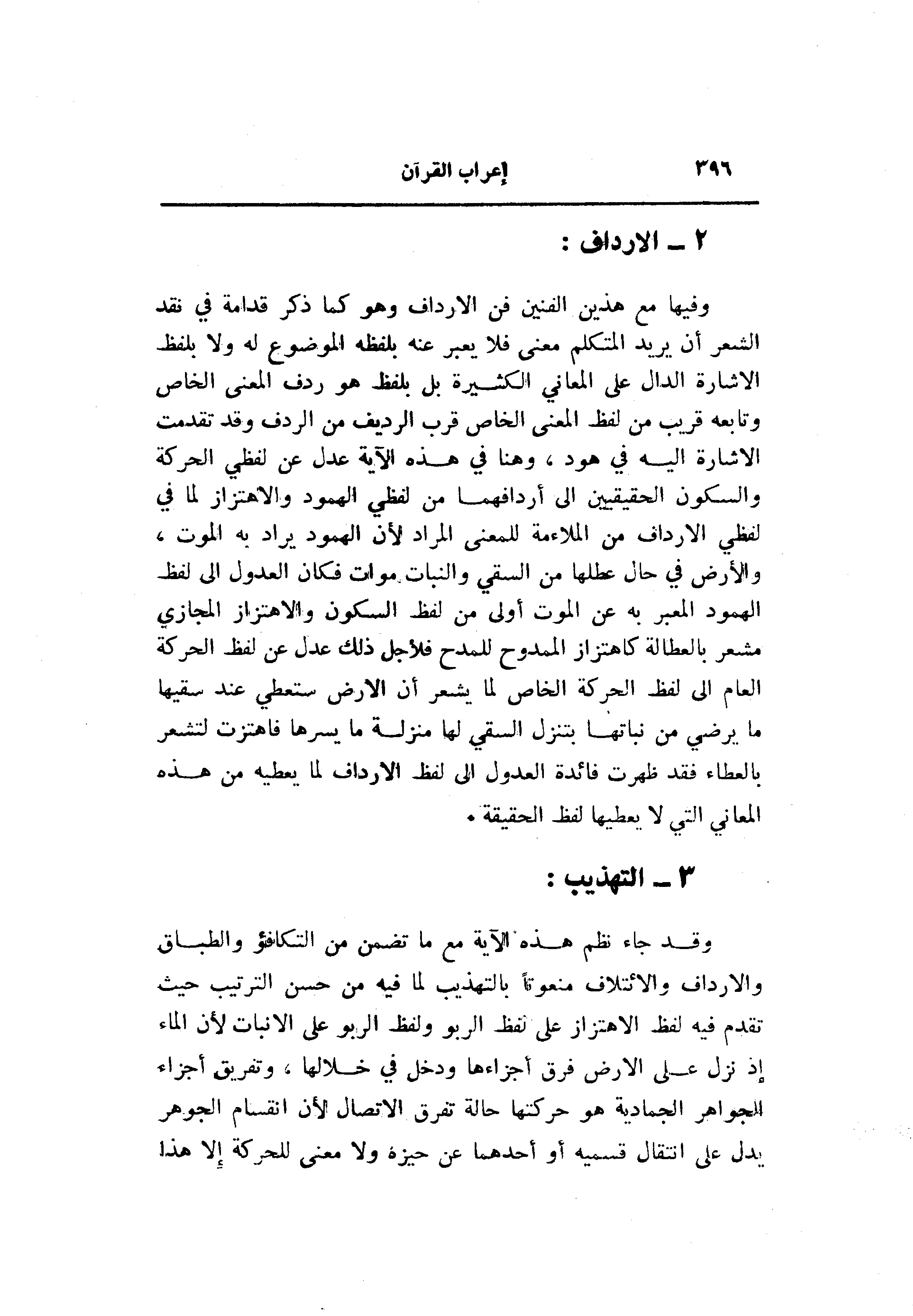 وفيها مع هذين الفنين فن الارداف وهو كما ذكر قدامة في نقد الشعر أن يريد المتكلم معنى فلا يعبر عنه بلفظه الموضوع له ولا بلفظ الاشارة الدال على المعاني الكثيرة بل بلفظ هو ردف المعنى الخاص وتابعه قريب من لفظ المعنى الخاص قرب الرديف من الردف وقد تقدمت الاشارة اليه في هود، وهنا في هذه الآية عدل عن لفظي الحركة والسكون الحقيقيين الى أردافهما من لفظي الهمود والاهتزاز لما في لفظي الارداف من الملاءمة للمعنى المراد لأن الهمود يراد به الموت، والأرض في حال عطلها من السقي والنبات موات فكان العدول الى لفظ الهمود المعبر به عن الموت أولى من لفظ السكون والاهتزاز المجازي مشعر بالعطالة كاهتزاز الممدوح للمدح فلأجل ذلك عدل عن لفظ الحركة العام الى لفظ الحركة الخاص لما يشعر أن الأرض ستعطي عند سقيها ما يرضي من نباتها بتنزل السقي لها منزلة ما يسرها فاهتزت لتشعر بالعطاء فقد ظهرت فائدة العدول الى لفظ الارداف لما يعطيه من هذه المعاني التي لا يعطيها لفظ الحقيقة.