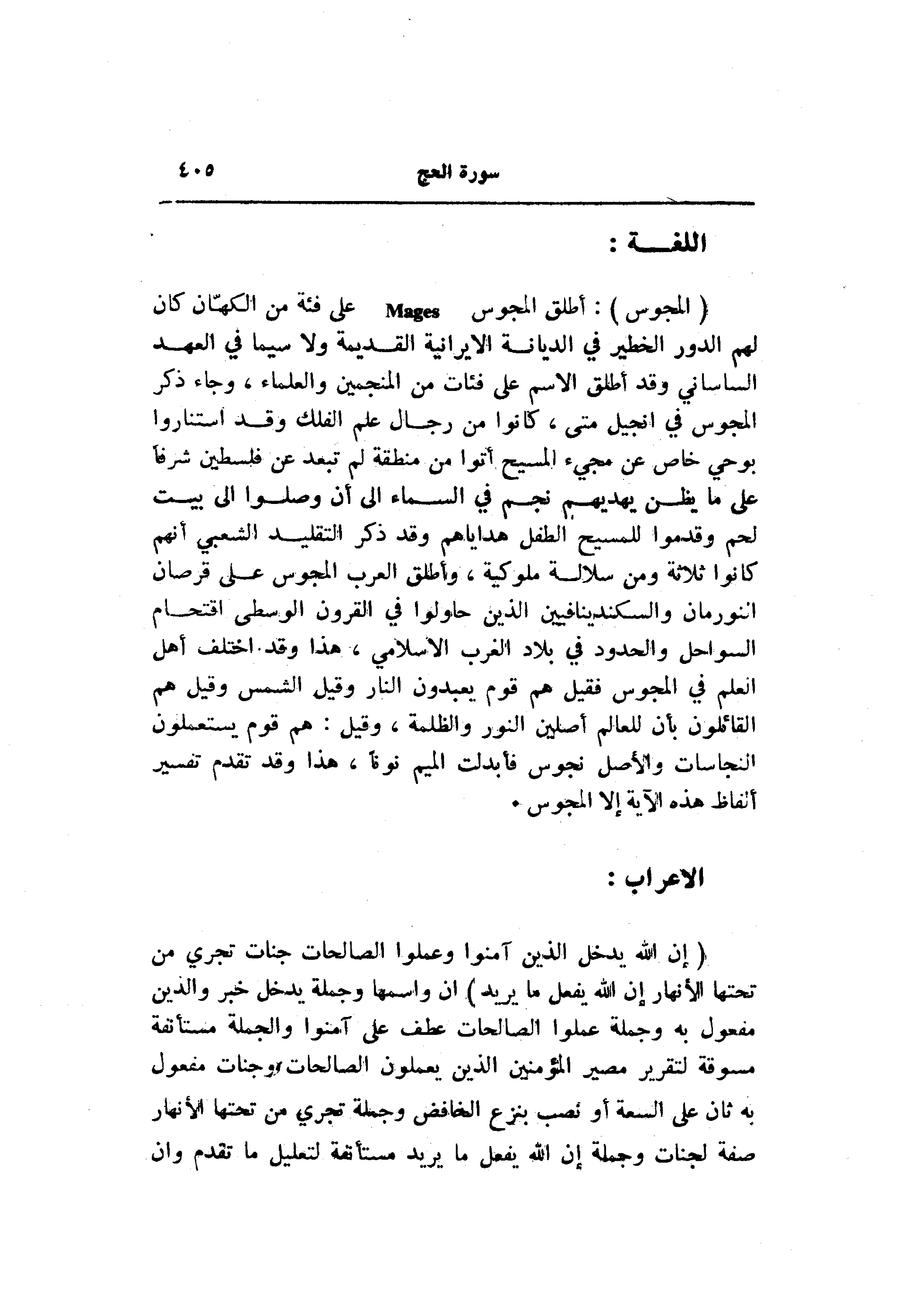 (الْمَجُوسَ) : أطلق المجوس على فئة من الكهّان كان لهم الدور الخطير في الديانة الايرانية القديمة ولا سيما في العهد الساساني وقد أطلق الاسم على فئات من المنجمين والعلماء، وجاء ذكر المجوس في إنجيل متى، كانوا من رجال علم الفلك وقد استناروا بوحي خاص عن مجيء المسيح أتوا من منطقة لم تبعد عن فلسطين شرفا على ما يظن يهديهم نجم في السماء الى أن وصلوا الى بيت لحم وقدموا للمسيح الطفل هداياهم وقد ذكر التقليد الشعبي أنهم كانوا ثلاثة ومن سلالة ملوكية، وأطلق العرب المجوس على قرصان النورمان والسكندينافيين الذين حاولوا في القرون الوسطى اقتحام السواحل والحدود في بلاد الغرب الاسلامي، هذا وقد اختلف أهل العلم في المجوس فقيل هم قوم يعبدون النار وقيل الشمس وقيل هم القائلون بأن للعالم أصلين النور والظلمة، وقيل: هم قوم يستعملون النجاسات والأصل نجوس فأبدلت الميم نونا، هذا وقد تقدم تفسير ألفاظ هذه الآية إلا المجوس.