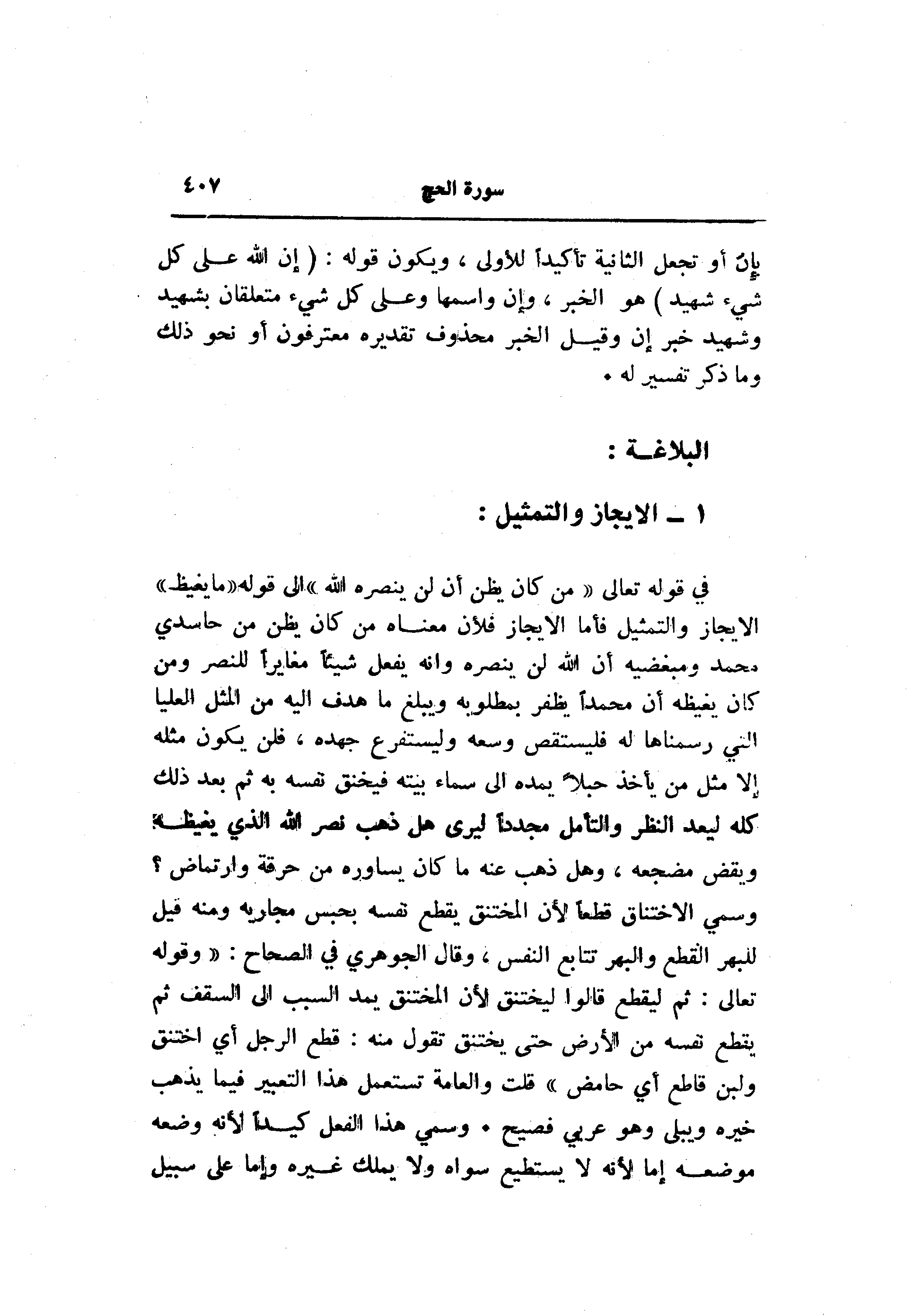 في قوله تعالى «مَنْ كانَ يَظُنُّ أَنْ لَنْ يَنْصُرَهُ اللَّهُ» الى قوله «ما يغيظ» الإيجاز والتمثيل فأما الإيجاز فلأن معناه من كان يظن من حاسدي محمد ومبغضيه أن الله لن ينصره وانه يفعل شيئا مغايرا للنصر ومن كان يغيظه أن محمدا يظفر بمطلوبه ويبلغ ما هدف اليه من المثل العليا التي رسمناها له فليستقص وسعه وليستفرع جهده، فلن يكون مثله إلا مثل من يأخذ حبلا يمده الى سماء بيته فيخنق نفسه به ثم بعد ذلك كله ليعد النظر والتأمل مجددا ليرى هل ذهب نصر الله الذي يغيظه ويقض مضجعه، وهل ذهب عنه ما كان يساوره من حرقة وارتماض؟