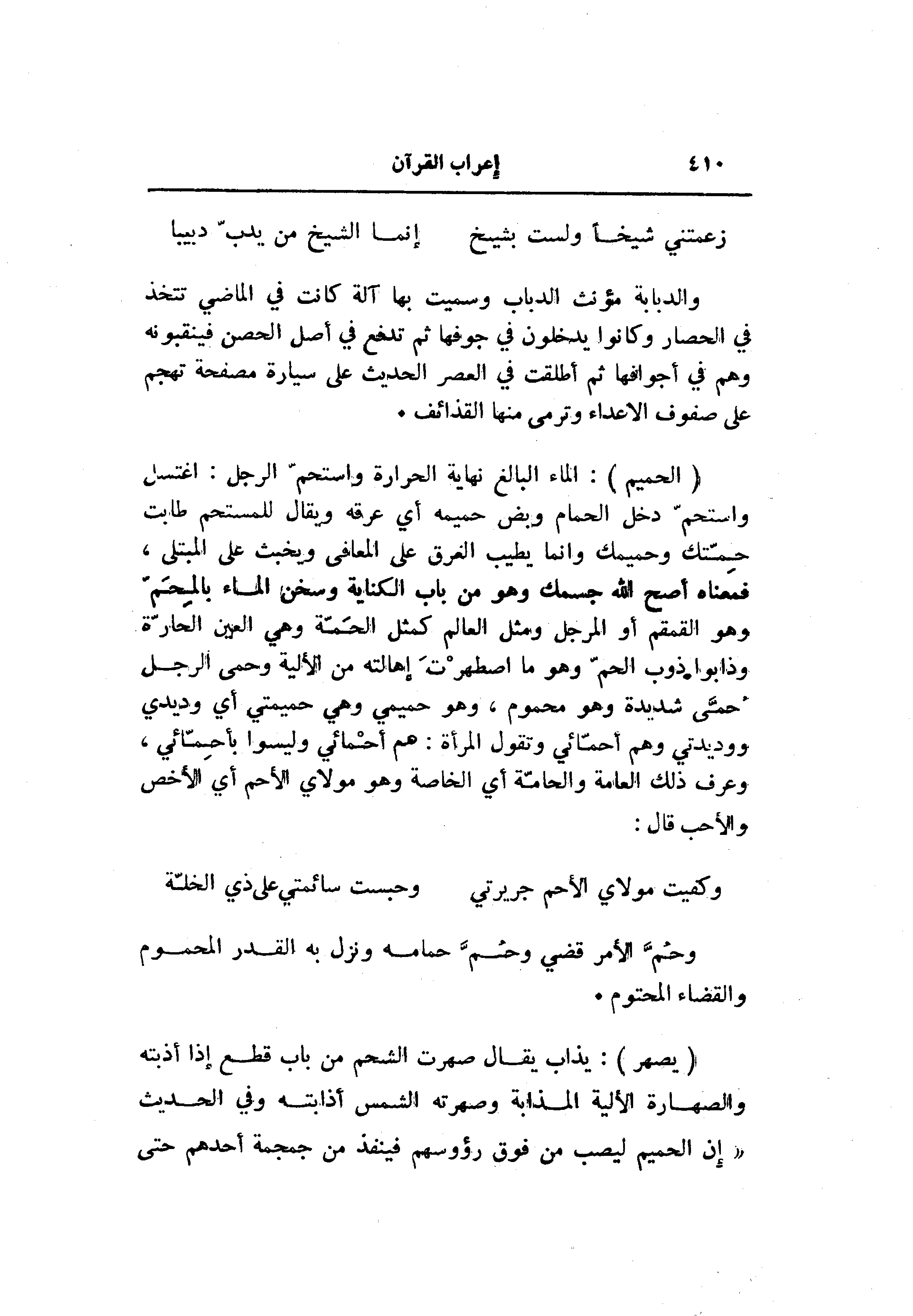 (الْحَمِيمُ) : الماء البالغ نهاية الحرارة واستحمّ الرجل: اغتسل واستحمّ دخل الحمام وبض حميمه أي عرقه ويقال للمستحم طابت حمّتك وحميمك وانما يطيب الغرق على المعافى ويخبث على المبتلى، فمعناه أصح الله جسمك وهو من باب الكناية وسخن الماء بالمحمّ وهو القمقم أو الرجل ومثل العالم كمثل الحمّة وهي العين الحارّة وذابوا ذوب الحمّ وهو ما اصطهرت إهالته من الألية وحمى الرجل حمّى شديدة وهو محموم، وهو حميمي وهي حميمتي أي وديدي ووديدتي وهم أحمّائي وتقول المرأة: هم أحمائي وليسوا بأحمّائي، وعرف ذلك العامة والحامّة أي الخاصة وهو مولاي الأحم أي الأخص والأحب قال: