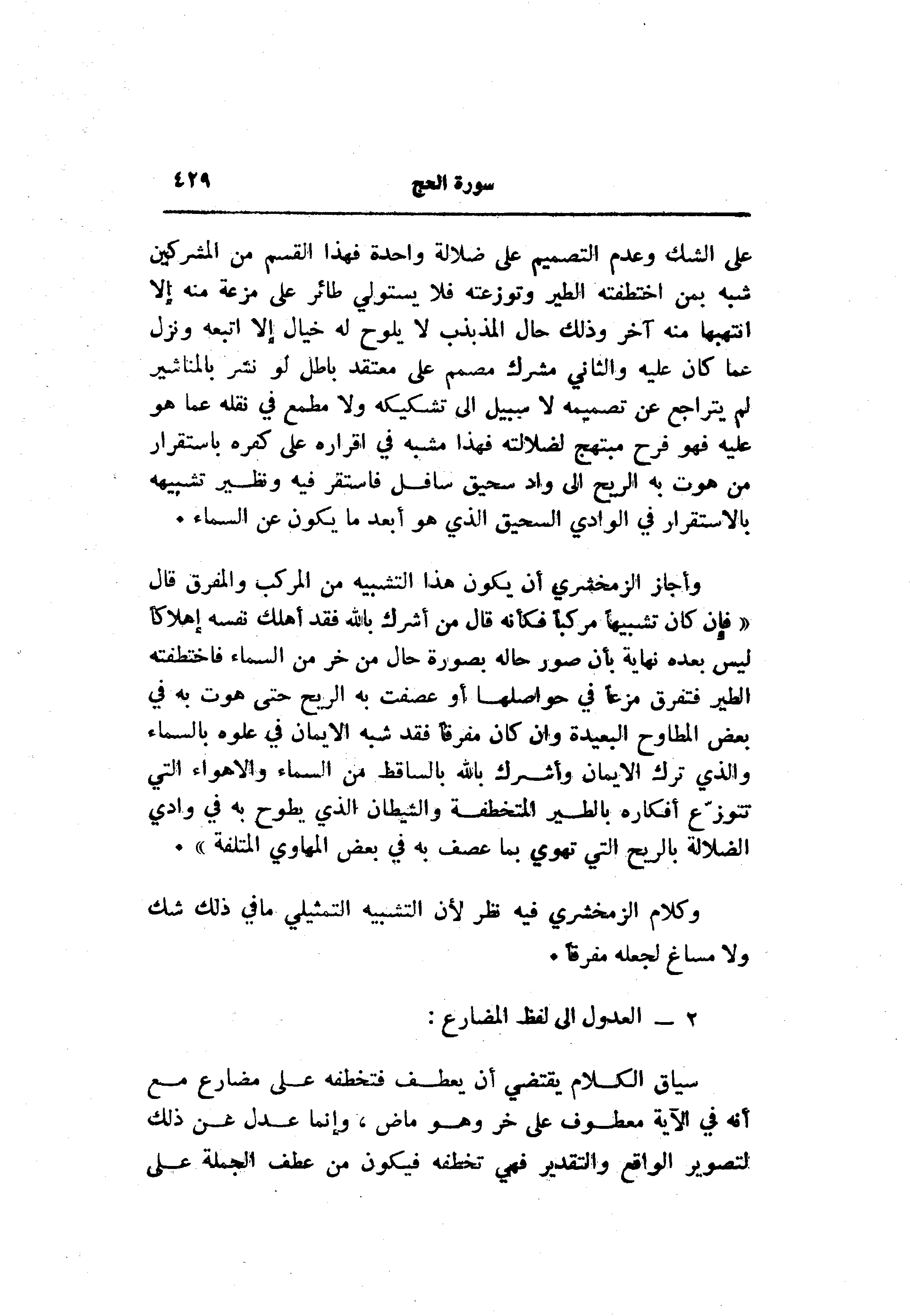 وأجاز الزمخشري أن يكون هذا التشبيه من المركب والمفرق قال «فإن كان تشبيها مركبا فكأنه قال من أشرك بالله فقد أهلك نفسه إهلاكا ليس بعده نهاية بأن صور حاله بصورة حال من خر من السماء فاختطفته الطير فتفرق مزعا في حواصلها أو عصفت به الريح حتى هوت به في بعض المطاوح البعيدة وان كان مفرقا فقد شبه الايمان في علوه بالسماء والذي ترك الايمان وأشرك بالله بالساقط من السماء والأهواء التي تتوزّع أفكاره بالطير المتخطفة والشيطان الذي يطوح به في وادي الضلالة بالريح التي تهوي بما عصف به في بعض المهاوي المتلفة» .
