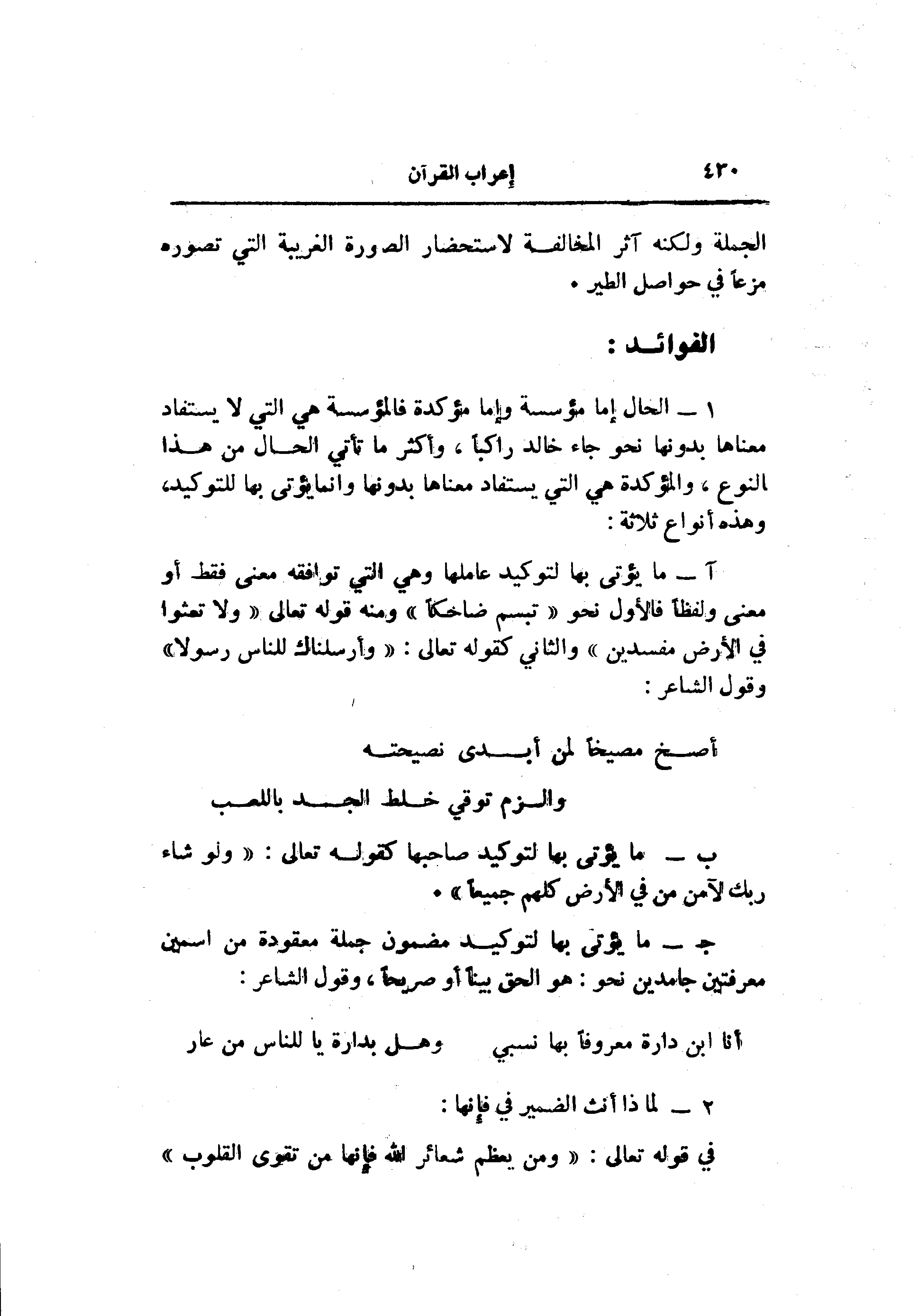 آ- ما يؤتى بها لتوكيد عاملها وهي التي توافقه معنى فقط أو معنى ولفظا فالأول نحو «تبسم ضاحكا» ومنه قوله تعالى «وَلا تَعْثَوْا فِي الْأَرْضِ مُفْسِدِينَ» والثاني كقوله تعالى: «وَأَرْسَلْناكَ لِلنَّاسِ رَسُولًا» وقول الشاعر: