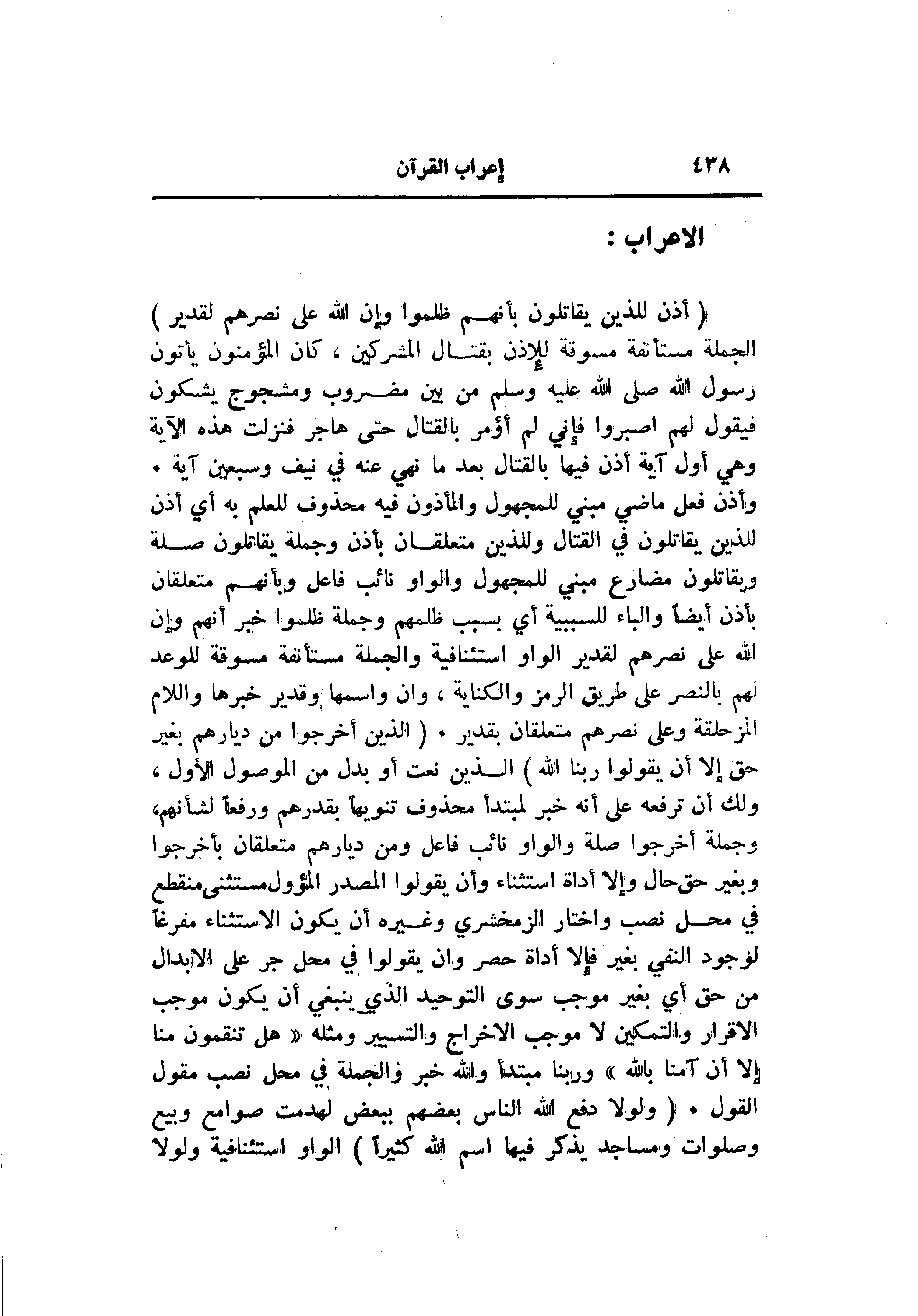وأذن فعل ماضي مبني للمجهول والمأذون فيه محذوف للعلم به أي أذن للذين يقاتلون في القتال وللذين متعلقان بأذن وجملة يقاتلون صلة ويقاتلون مضارع مبني للمجهول والواو نائب فاعل وبأنهم متعلقان بأذن أيضا والباء للسببية أي بسبب ظلمهم وجملة ظلموا خبر أنهم وإن الله على نصرهم لقدير الواو استئنافية والجملة مستأنفة مسوقة للوعد لهم بالنصر على طريق الرمز والكناية، وان واسمها وقدير خبرها واللام المزحلقة وعلى نصرهم متعلقان بقدير. (الَّذِينَ أُخْرِجُوا مِنْ دِيارِهِمْ بِغَيْرِ حَقٍّ إِلَّا أَنْ يَقُولُوا رَبُّنَا اللَّهُ) الذين نعت أو بدل من الموصول الأول، ولك أن ترفعه على أنه خبر لمبتدأ محذوف تنويها بقدرهم ورفعا لشأنهم، وجملة أخرجوا صلة والواو نائب فاعل ومن ديارهم متعلقان بأخرجوا وبغير حق حال وإلا أداة استثناء وأن يقولوا المصدر المؤول مستثنى منقطع في محل نصب واختار الزمخشري وغيره أن يكون الاستثناء مفرغا لوجود النفي بغير فإلا أداة حصر وان يقولوا في محل جر على الابدال من حق أي بغير موجب سوى التوحيد الذي ينبغي أن يكون موجب الإقرار والتمكين لا موجب الإخراج والتسيير ومثله «هَلْ تَنْقِمُونَ مِنَّا إِلَّا أَنْ آمَنَّا بِاللَّهِ» وربنا مبتدأ والله خبر والجملة في محل نصب مقول القول. (وَلَوْلا دَفْعُ اللَّهِ النَّاسَ بَعْضَهُمْ بِبَعْضٍ لَهُدِّمَتْ صَوامِعُ وَبِيَعٌ وَصَلَواتٌ وَمَساجِدُ يُذْكَرُ فِيهَا اسْمُ اللَّهِ كَثِيراً) الواو استئنافية ولولا