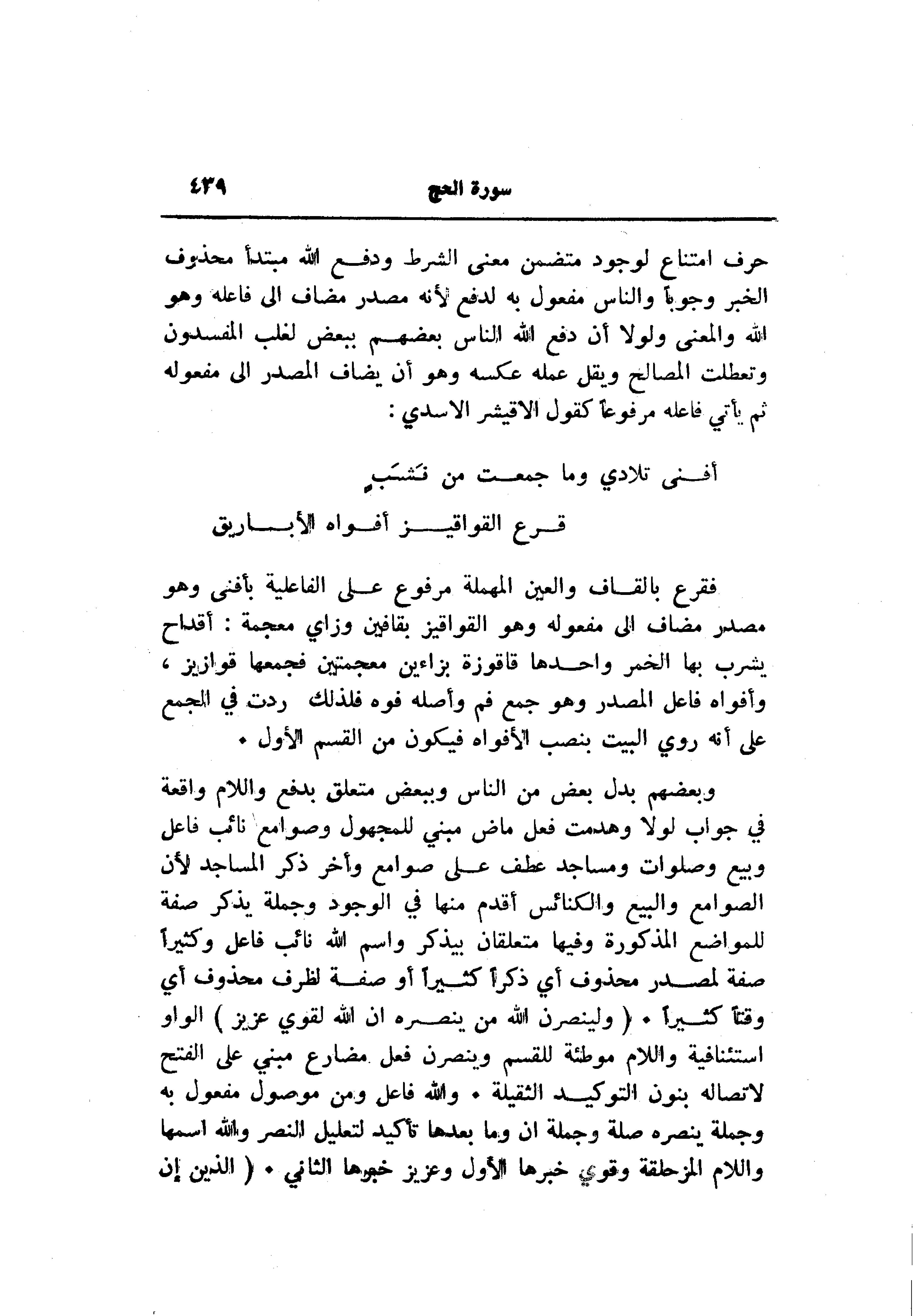 وبعضهم بدل بعض من الناس وببعض متعلق بدفع واللام واقعة في جواب لولا وهدمت فعل ماض مبني للمجهول وصوامع نائب فاعل وبيع وصلوات ومساجد عطف على صوامع وأخر ذكر المساجد لأن الصوامع والبيع والكنائس أقدم منها في الوجود وجملة يذكر صفة للمواضع المذكورة وفيها متعلقان بيذكر واسم الله نائب فاعل وكثيرا صفة لمصدر محذوف أي ذكرا كثيرا أو صفة لظرف محذوف أي وقتا كثيرا. (وَلَيَنْصُرَنَّ اللَّهُ مَنْ يَنْصُرُهُ إِنَّ اللَّهَ لَقَوِيٌّ عَزِيزٌ) الواو استئنافية واللام موطئة للقسم وينصرن فعل مضارع مبني على الفتح لاتصاله بنون التوكيد الثقيلة. والله فاعل ومن موصول مفعول به وجملة ينصره صلة وجملة ان وما بعدها تأكيد لتعليل النصر والله اسمها واللام المزحلقة وقوي خبرها الأول وعزيز خبرها الثاني. (الَّذِينَ إِنْ