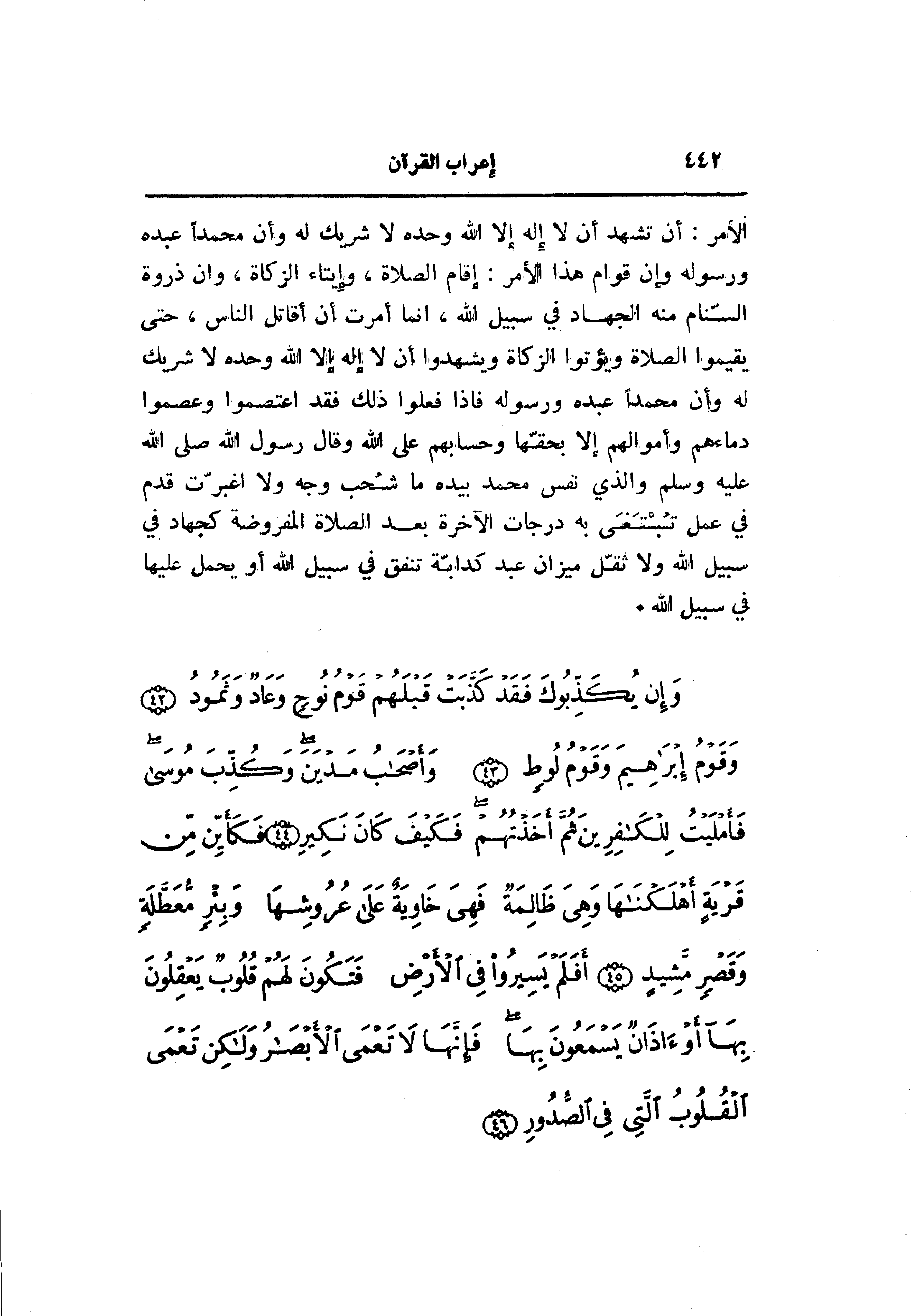 الأمر: أن تشهد أن لا إله إلا الله وحده لا شريك له وأن محمدا عبده ورسوله وإن قوام هذا الأمر: إقام الصلاة، وإيتاء الزكاة، وان ذروة السّنام منه الجهاد في سبيل الله، انما أمرت أن أقاتل الناس، حتى يقيموا الصلاة ويؤتوا الزكاة ويشهدوا أن لا إله إلا الله وحده لا شريك له وأن محمدا عبده ورسوله فاذا فعلوا ذلك فقد اعتصموا وعصموا دماءهم وأموالهم إلا بحقّها وحسابهم على الله وقال رسول الله صلى الله عليه وسلم والذي نفس محمد بيده ما شحب وجه ولا اغبرّت قدم في عمل تبتغى به درجات الآخرة بعد الصلاة المفروضة كجهاد في سبيل الله ولا ثقّل ميزان عبد كدابّة تنفق في سبيل الله أو يحمل عليها في سبيل الله.