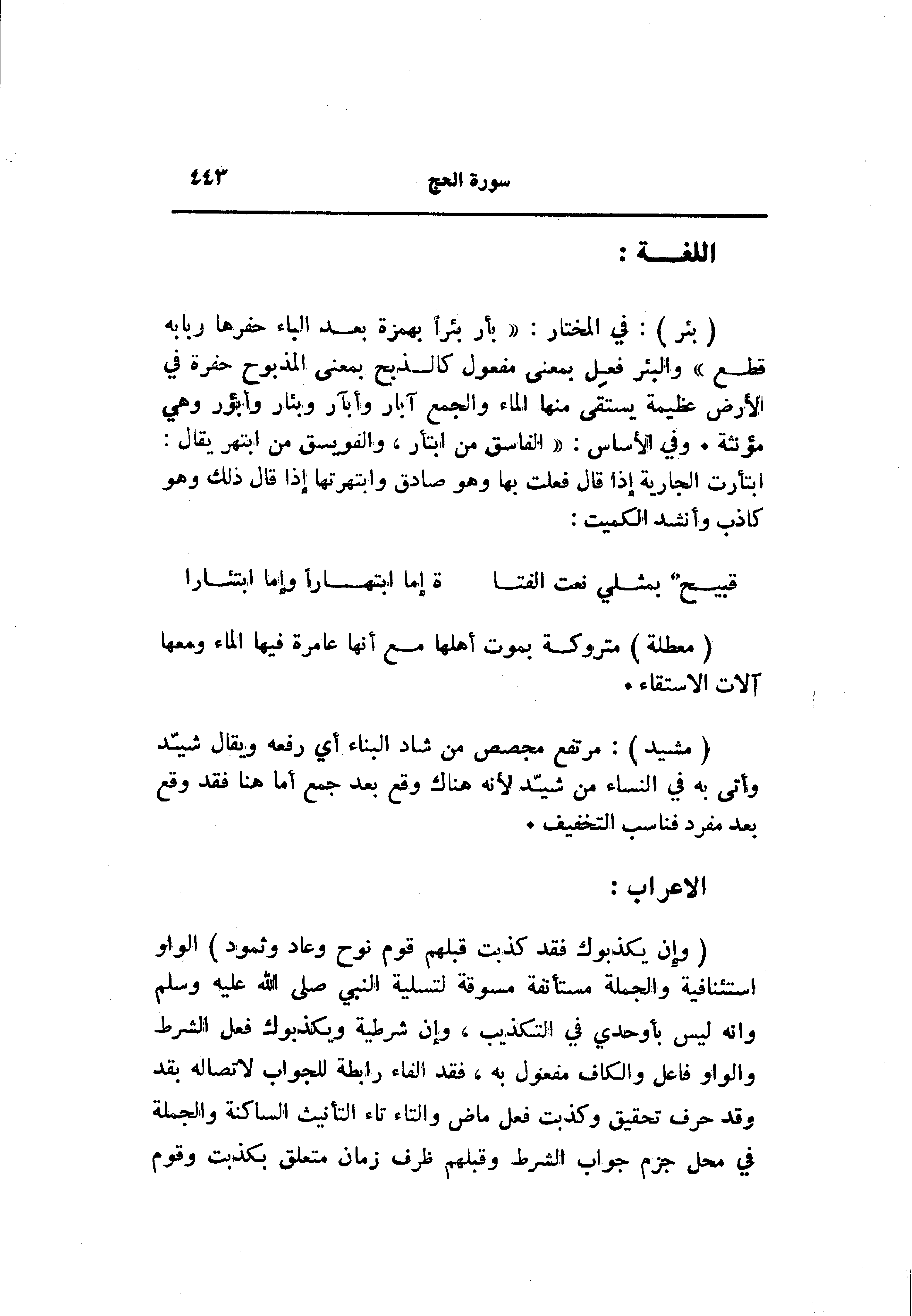 (مَشِيدٍ) : مرتفع مجصص من شاد البناء أي رفعه ويقال شيّد وأتى به في النساء من شيّد لأنه هناك وقع بعد جمع أما هنا فقد وقع بعد مفرد فناسب التخفيف.