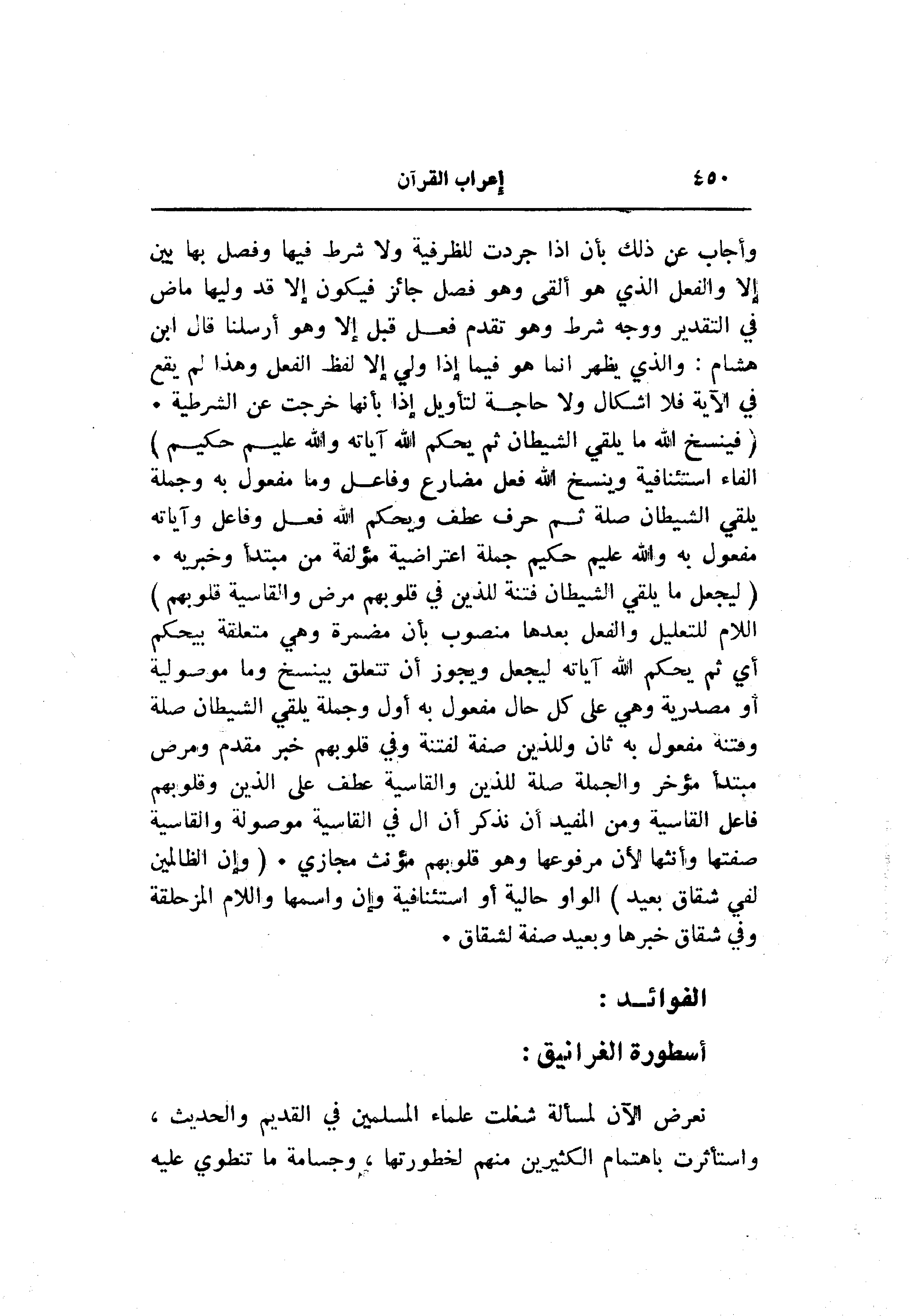 (لِيَجْعَلَ ما يُلْقِي الشَّيْطانُ فِتْنَةً لِلَّذِينَ فِي قُلُوبِهِمْ مَرَضٌ وَالْقاسِيَةِ قُلُوبُهُمْ) اللام للتعليل والفعل بعدها منصوب بأن مضمرة وهي متعلقة بيحكم أي ثم يحكم الله آياته ليجعل ويجوز أن تتعلق بينسخ وما موصولية أو مصدرية وهي على كل حال مفعول به أول وجملة يلقي الشيطان صلة وفتنة مفعول به ثان وللذين صفة لفتنة وفي قلوبهم خبر مقدم ومرض مبتدأ مؤخر والجملة صلة للذين والقاسية عطف على الذين وقلوبهم فاعل القاسية ومن المفيد أن نذكر أن ال في القاسية موصولة والقاسية صفتها وأنثها لأن مرفوعها وهو قلوبهم مؤنث مجازي. (وَإِنَّ الظَّالِمِينَ لَفِي شِقاقٍ بَعِيدٍ) الواو حالية أو استئنافية وإن واسمها واللام المزحلقة وفي شقاق خبرها وبعيد صفة لشقاق.