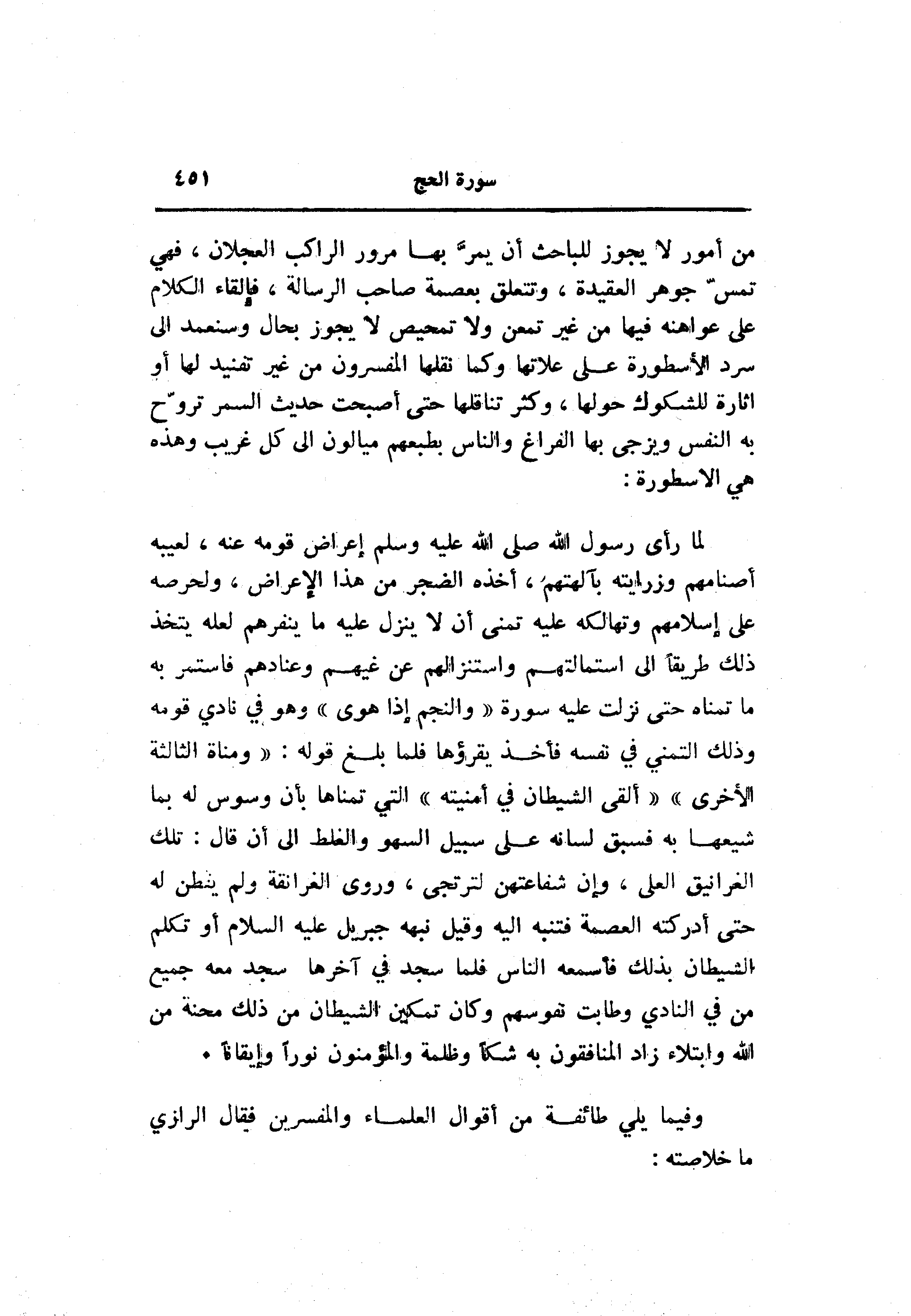 من أمور لا يجوز للباحث أن يمرّ بها مرور الراكب العجلان، فهي تمسّ جوهر العقيدة، وتتعلق بعصمة صاحب الرسالة، فإلقاء الكلام على عواهنه فيها من غير تمعن ولا تمحيص لا يجوز بحال وسنعمد الى سرد الأسطورة على علاتها وكما نقلها المفسرون من غير تفنيد لها أو اثارة للشكوك حولها، وكثر تناقلها حتى أصبحت حديث السمر تروّح به النفس ويزجى بها الفراغ والناس بطبعهم ميالون الى كل غريب وهذه هي الاسطورة:
