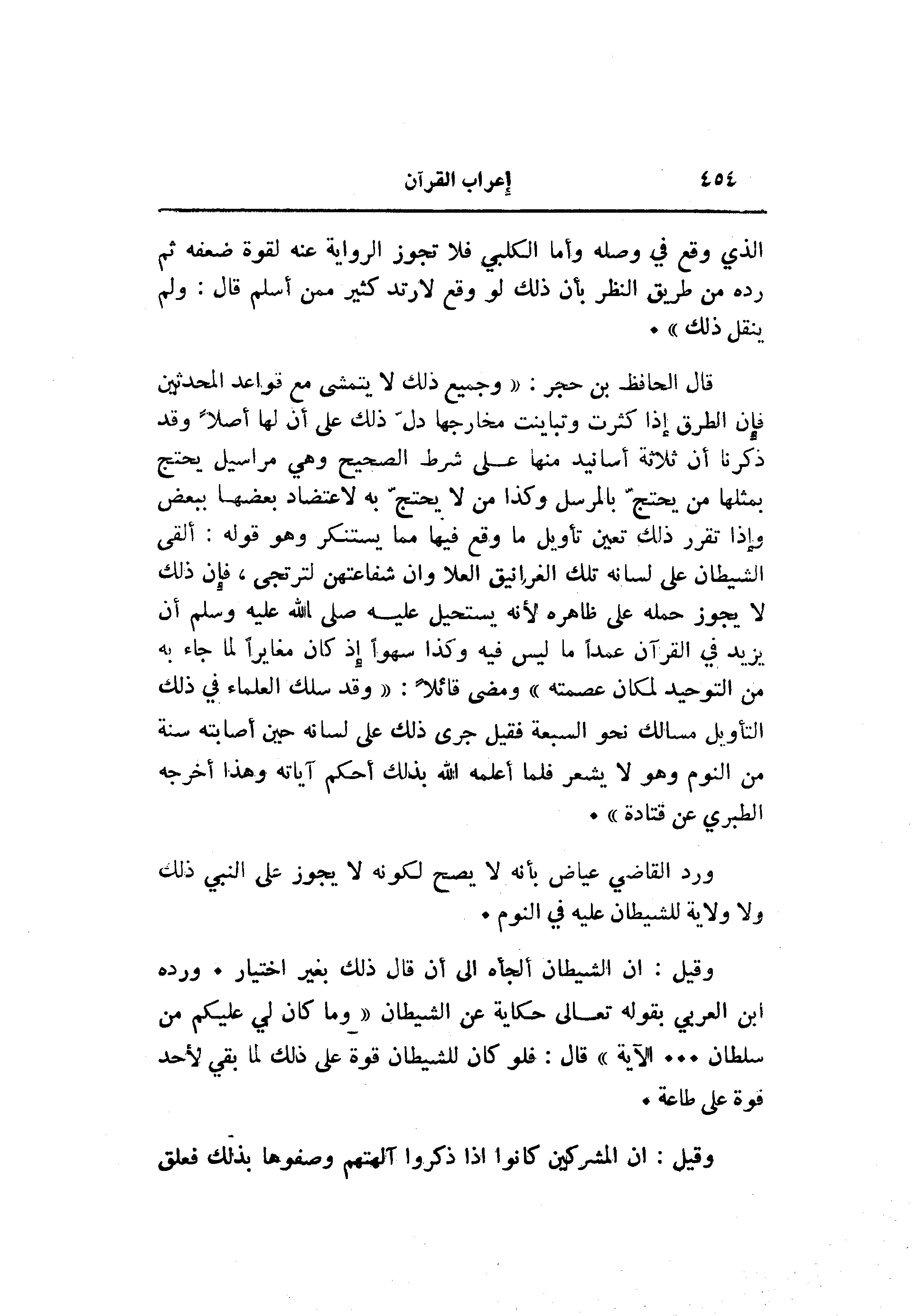 قال الحافظ بن حجر: «وجميع ذلك لا يتمشى مع قواعد المحدثين فإن الطرق إذا كثرت وتباينت مخارجها دلّ ذلك على أن لها أصلا وقد ذكرنا أن ثلاثة أسانيد منها على شرط الصحيح وهي مراسيل يحتج بمثلها من يحتجّ بالمرسل وكذا من لا يحتجّ به لاعتضاد بعضها ببعض وإذا تقرر ذلك تعين تأويل ما وقع فيها مما يستنكر وهو قوله: ألقى الشيطان على لسانه تلك الغرانيق العلا وان شفاعتهن لترتجى، فإن ذلك لا يجوز حمله على ظاهره لأنه يستحيل عليه صلى الله عليه وسلم أن يزيد في القرآن عمدا ما ليس فيه وكذا سهوا إذ كان مغايرا لما جاء به من التوحيد لمكان عصمته» ومضى قائلا: «وقد سلك العلماء في ذلك التأويل مسالك نحو السبعة فقيل جرى ذلك على لسانه حين أصابته سنة من النوم وهو لا يشعر فلما أعلمه الله بذلك أحكم آياته وهذا أخرجه الطبري عن قتادة» .
