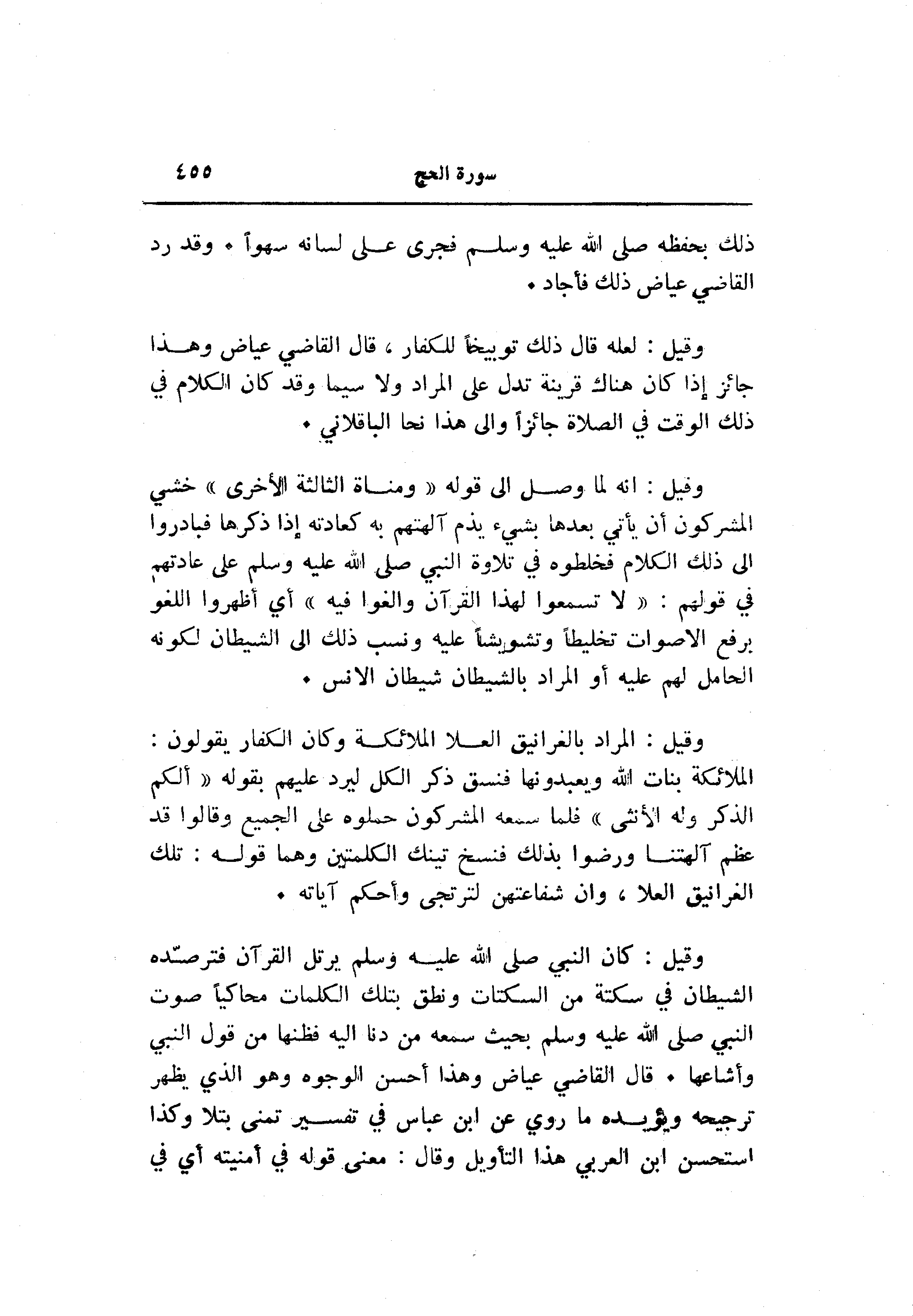 وقيل: كان النبي صلى الله عليه وسلم يرتل القرآن فترصّده الشيطان في سكتة من السكتات ونطق بتلك الكلمات محاكيا صوت النبي صلى الله عليه وسلم بحيث سمعه من دنا اليه فظنها من قول النبي وأشاعها. قال القاضي عياض وهذا أحسن الوجوه وهو الذي يظهر ترجيحه ويؤيده ما روي عن ابن عباس في تفسير تمنى بتلا وكذا استحسن ابن العربي هذا التأويل وقال: معنى قوله في أمنيته أي في