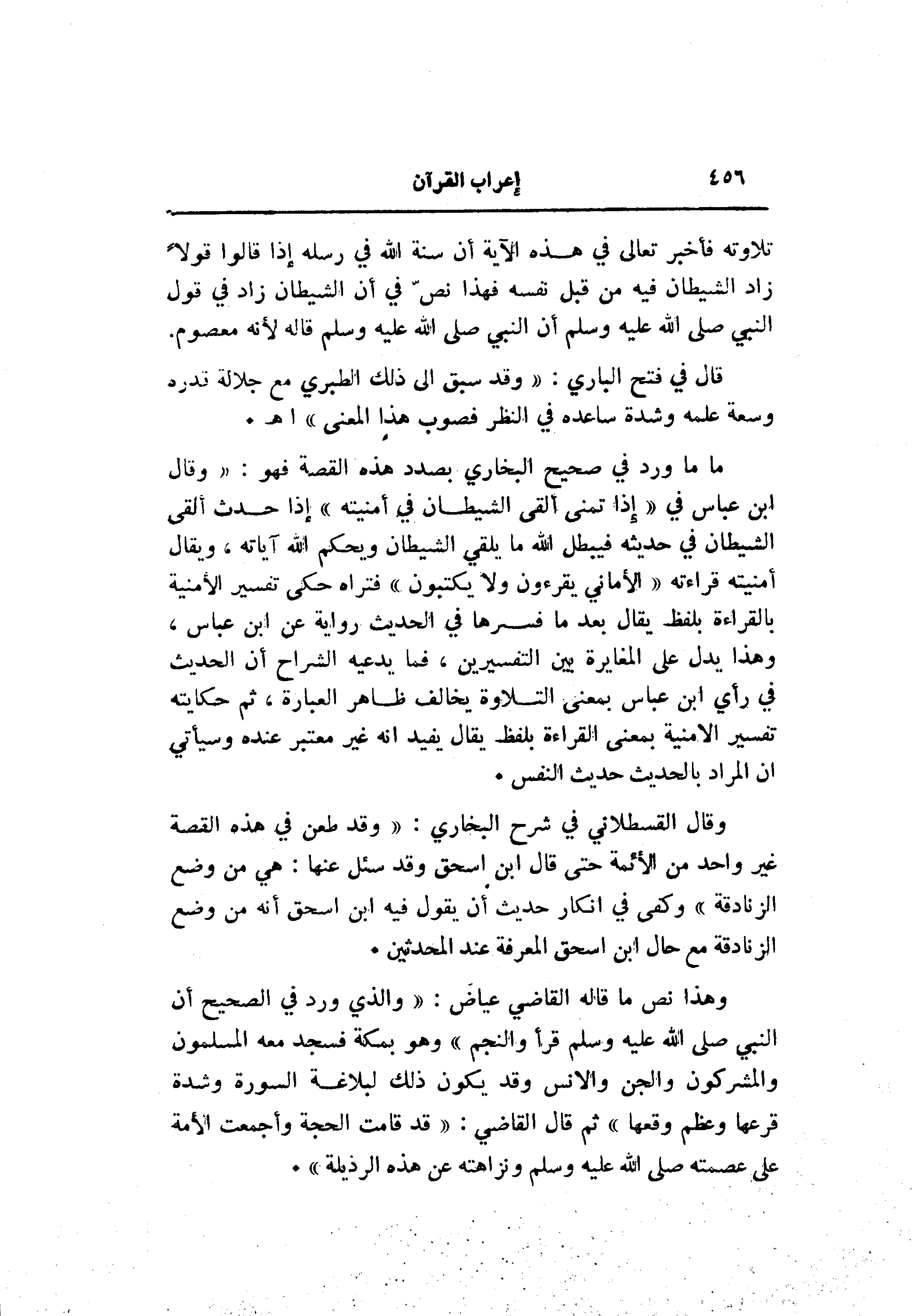 وهذا نص ما قاله القاضي عياض: «والذي ورد في الصحيح أن النبي صلى الله عليه وسلم قرأ والنجم» وهو بمكة فسجد معه المسلمون والمشركون والجن والانس وقد يكون ذلك لبلاغة السورة وشدة قرعها وعظم وقعها» ثم قال القاضي: «قد قامت الحجة وأجمعت الأمة على عصمته صلى الله عليه وسلم ونزاهته عن هذه الرذيلة» .