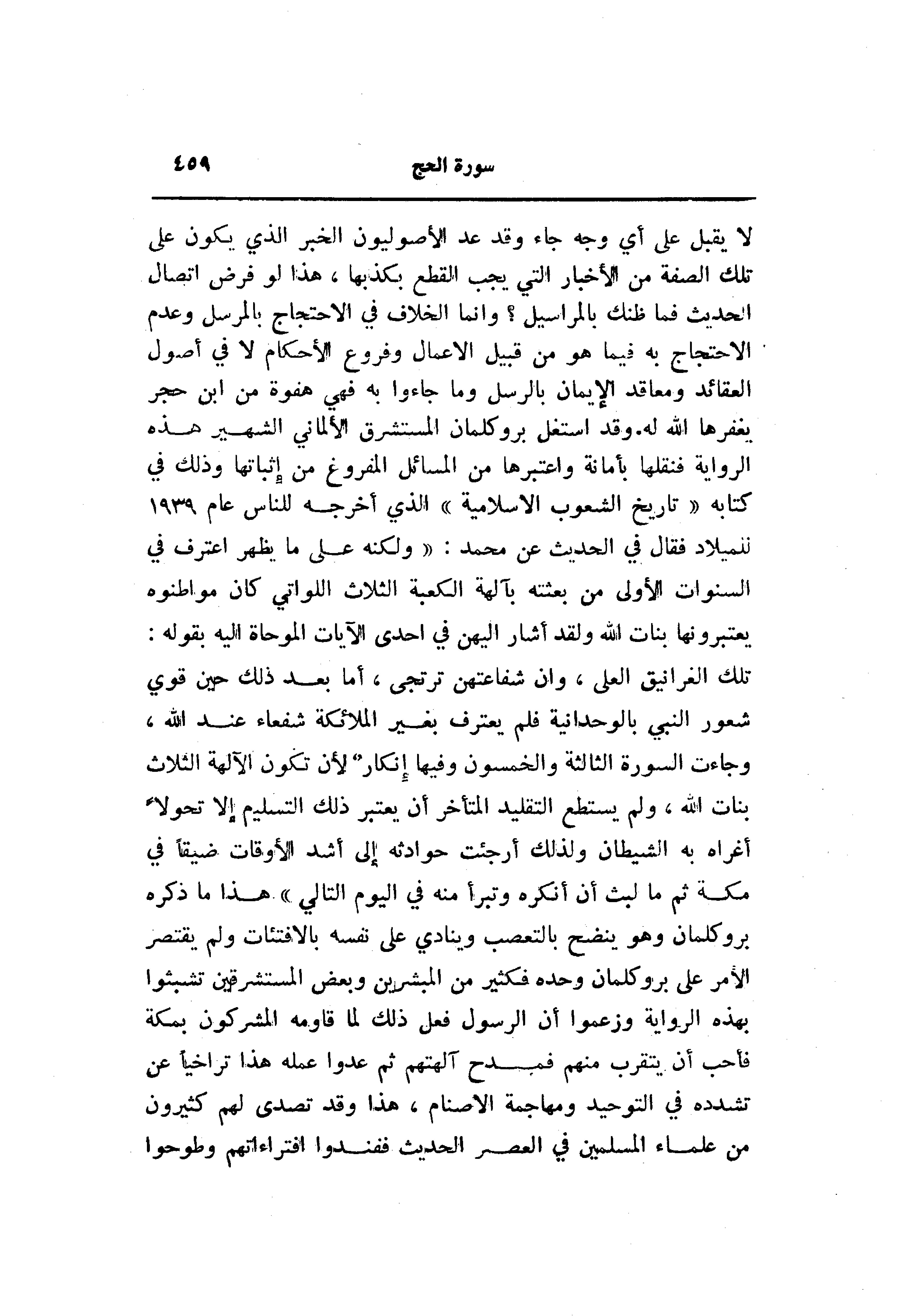 تلك الغرانيق العلى، وان شفاعتهن ترتجى، أما بعد ذلك حين قوي شعور النبي بالوحدانية فلم يعترف بغير الملائكة شفعاء عند الله، وجاءت السورة الثالثة والخمسون وفيها إنكار لأن تكون الآلهة الثلاث بنات الله، ولم يستطع التقليد المتأخر أن يعتبر ذلك التسليم إلا تحولا أغراه به الشيطان ولذلك أرجئت حوادثه إلى أشد الأوقات ضيقا في مكة ثم ما لبث أن أنكره وتبرأ منه في اليوم التالي» هذا ما ذكره بروكلمان وهو ينضح بالتعصب وينادي على نفسه بالافتئات ولم يقتصر الأمر على بروكلمان وحده فكثير من المبشرين وبعض المستشرقين تشبثوا بهذه الرواية وزعموا أن الرسول فعل ذلك لما قاومه المشركون بمكة فأحب أن يتقرب منهم فمدح آلهتهم ثم عدوا عمله هذا تراخيا عن تشدده في التوحيد ومهاجمة الأصنام، هذا وقد تصدى لهم كثيرون من علماء المسلمين في العصر الحديث ففندوا افتراءاتهم وطوحوا