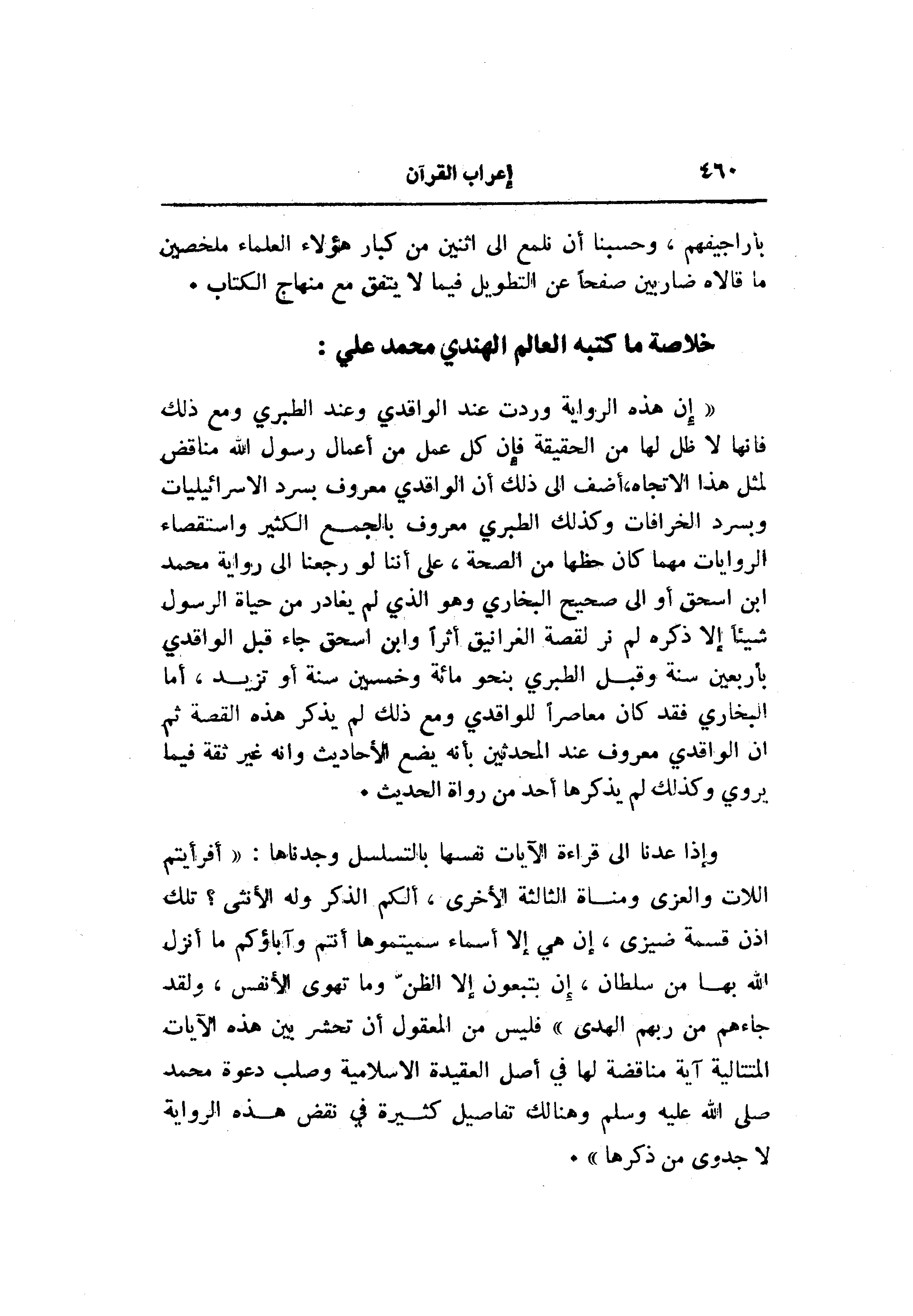 «إن هذه الرواية وردت عند الواقدي وعند الطبري ومع ذلك فانها لا ظل لها من الحقيقة فإن كل عمل من أعمال رسول الله مناقض لمثل هذا الاتجاه، أضف الى ذلك أن الواقدي معروف بسرد الاسرائيليات وبسرد الخرافات وكذلك الطبري معروف بالجمع الكثير واستقصاء الروايات مهما كان حظها من الصحة، على أننا لو رجعنا الى رواية محمد ابن اسحق أو الى صحيح البخاري وهو الذي لم يغادر من حياة الرسول شيئا إلا ذكره لم نر لقصة الغرانيق أثرا وابن اسحق جاء قبل الواقدي بأربعين سنة وقبل الطبري بنحو مائة وخمسين سنة أو تزيد، أما البخاري فقد كان معاصرا للواقدي ومع ذلك لم يذكر هذه القصة ثم ان الواقدي معروف عند المحدثين بأنه يضع الأحاديث وانه غير ثقة فيما يروي وكذلك لم يذكرها أحد من رواة الحديث.