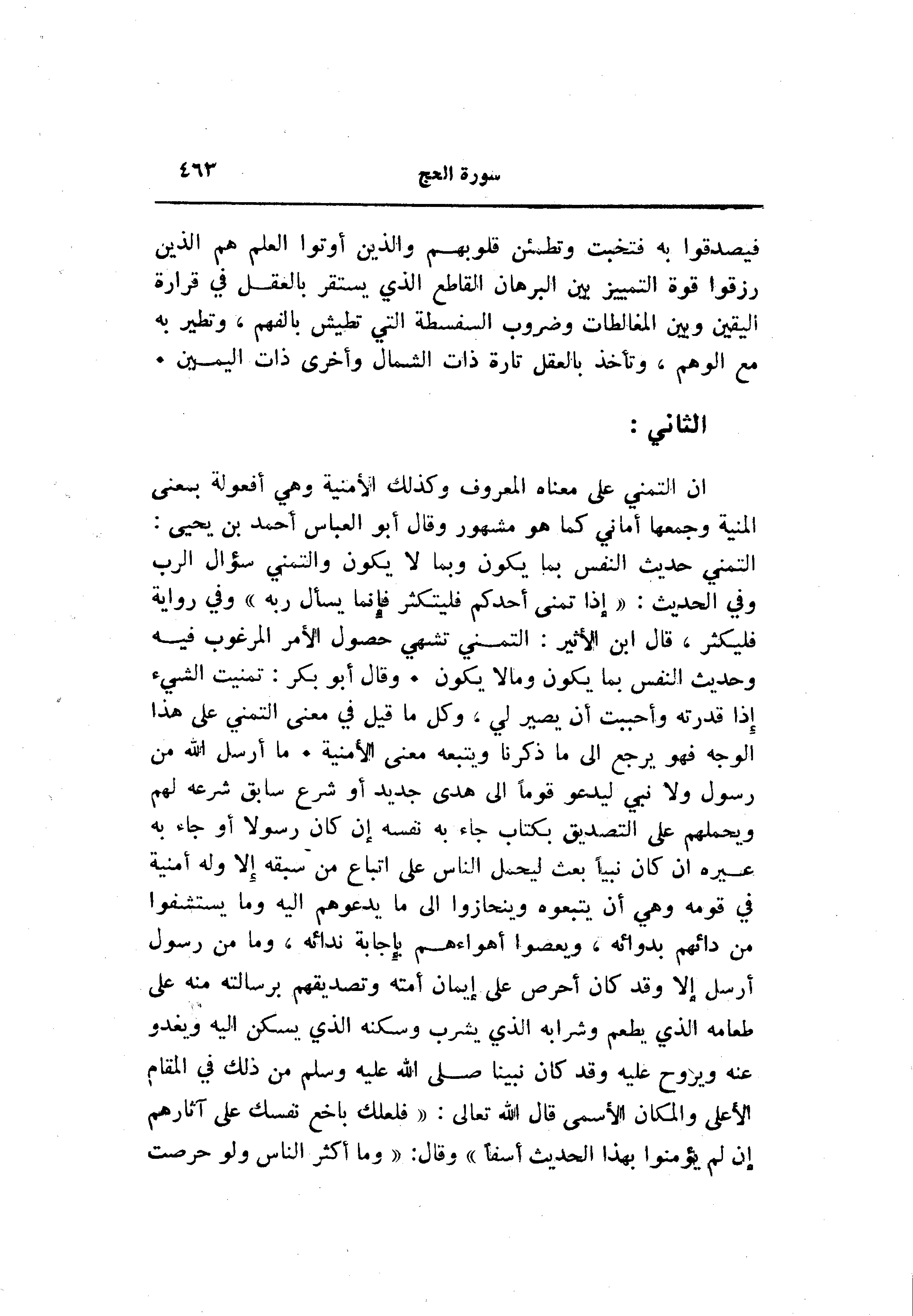 التمني حديث النفس بما يكون وبما لا يكون والتمني سؤال الرب وفي الحديث: «إذا تمنى أحدكم فليتكثر فإنما يسأل ربه» وفي رواية فليكثر، قال ابن الأثير: التمني تشهي حصول الأمر المرغوب فيه وحديث النفس بما يكون وما لا يكون. وقال أبو بكر: تمنيت الشيء إذا قدرته وأحببت أن يصير لي، وكل ما قيل في معنى التمني على هذا الوجه فهو يرجع الى ما ذكرنا ويتبعه معنى الأمنية. ما أرسل الله من رسول ولا نبي ليدعو قوما الى هدى جديد أو شرع سابق شرعه لهم ويحملهم على التصديق بكتاب جاء به نفسه إن كان رسولا أو جاء به عيره ان كان نبيا بعث ليحمل الناس على اتباع من سبقه إلا وله أمنية في قومه وهي أن يتبعوه وينحازوا الى ما يدعوهم اليه وما يستشفوا من دائهم بدوائه، ويعصوا أهواءهم بإجابة ندائه، وما من رسول أرسل إلا وقد كان أحرص على إيمان أمته وتصديقهم برسالته منه على طعامه الذي يطعم وشرابه الذي يشرب وسكنه الذي يسكن اليه ويغدو عنه ويروح عليه وقد كان نبينا صلى الله عليه وسلم من ذلك في المقام الأعلى والمكان الأسمى قال الله تعالى: «فَلَعَلَّكَ باخِعٌ نَفْسَكَ عَلى آثارِهِمْ إِنْ لَمْ يُؤْمِنُوا بِهذَا الْحَدِيثِ أَسَفاً» وقال: «وما أكثر الناس ولو حرصت