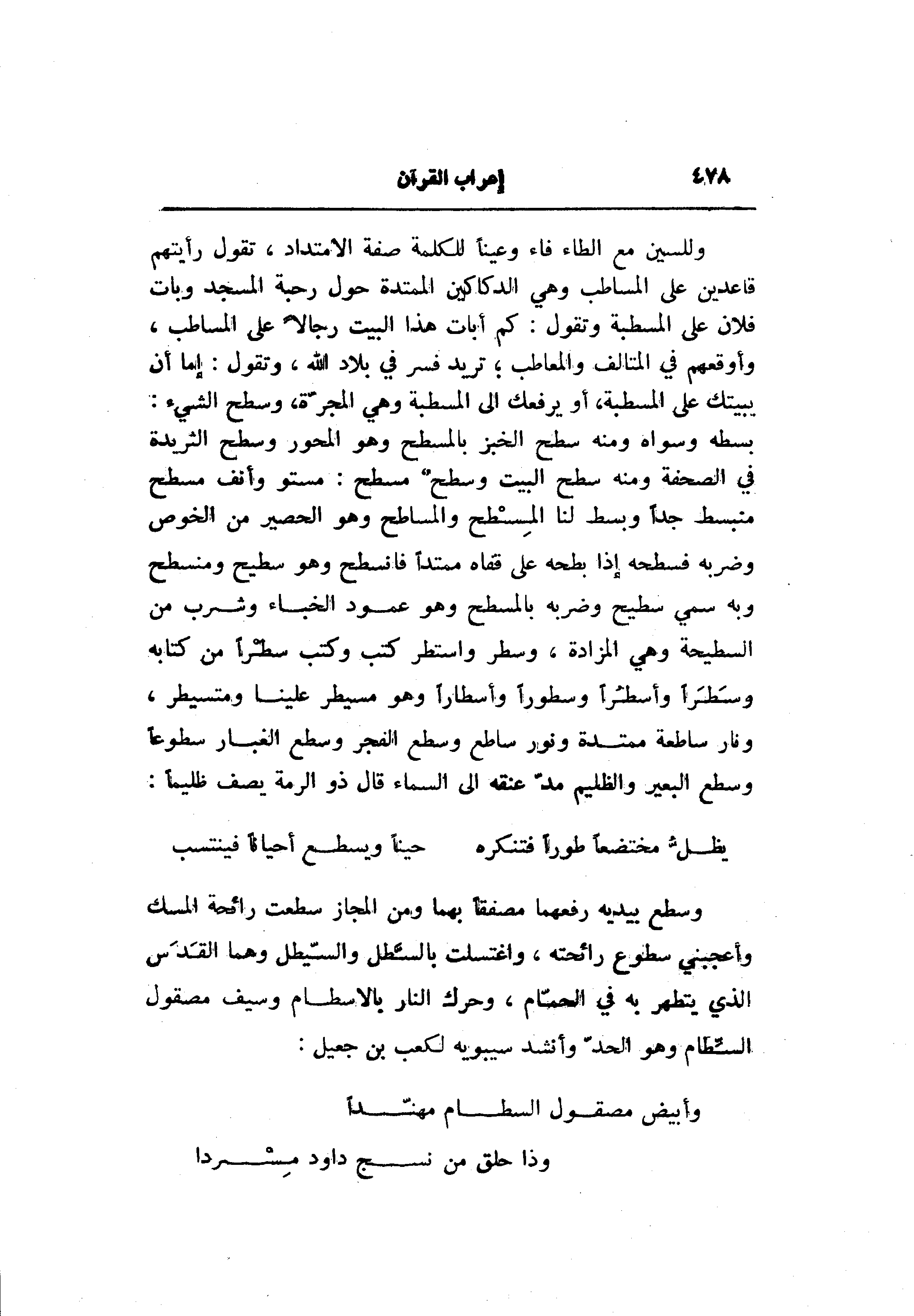 وللسين مع الطاء فاء وعينا للكلمة صفة الامتداد، تقول رأيتهم قاعدين على المساطب وهي الدكاكين الممتدة حول رحبة المسجد وبات فلان على المسطبة وتقول: كم أبات هذا البيت رجالا على المساطب، وأوقعهم في المتالف والمعاطب تريد فسر في بلاد الله، وتقول: إما أن يبيتك على المسطبة، أو يرفعك الى المسطبة وهي المجرّة، وسطح الشيء: