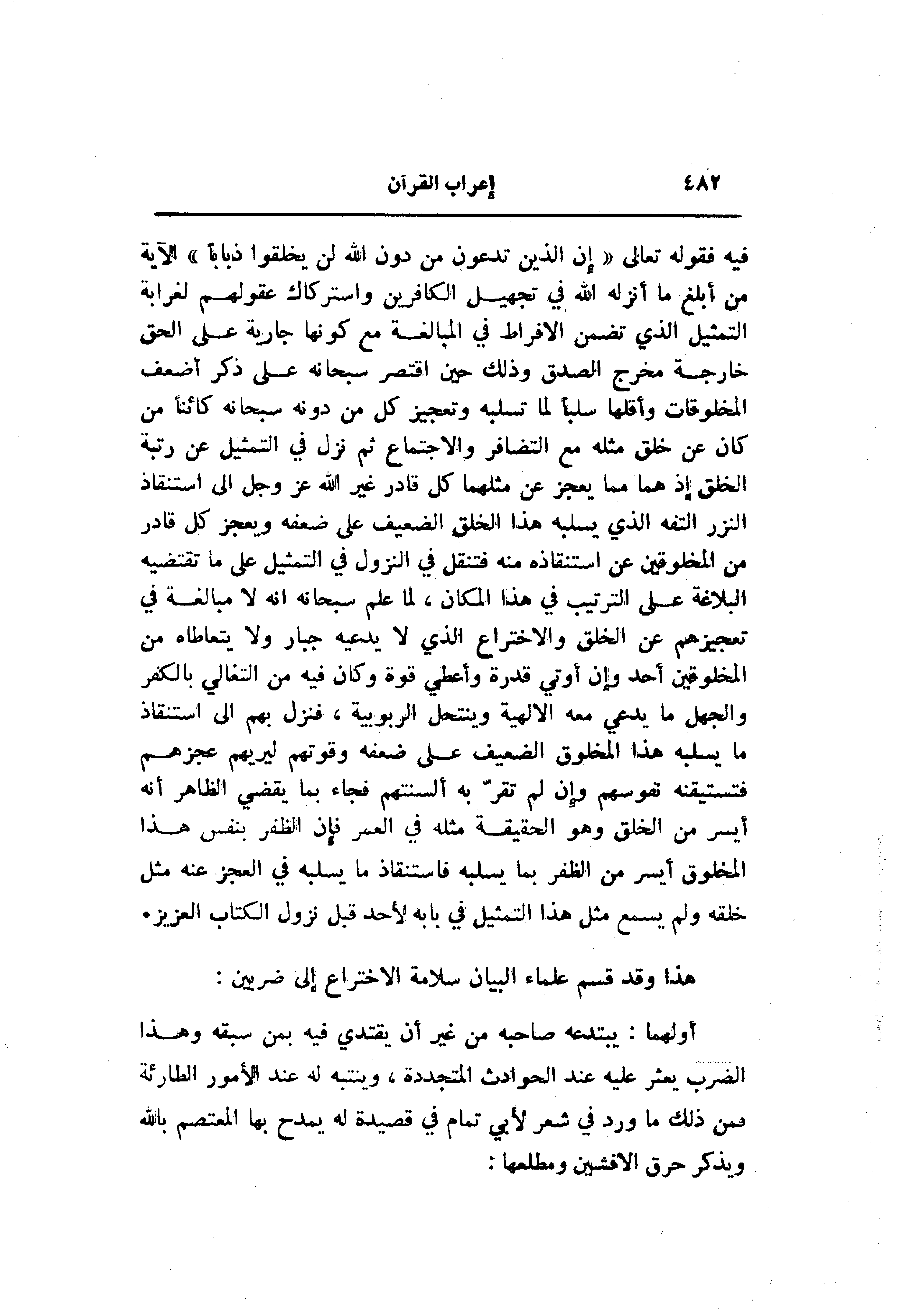 فيه فقوله تعالى «إِنَّ الَّذِينَ تَدْعُونَ مِنْ دُونِ اللَّهِ لَنْ يَخْلُقُوا ذُباباً» الآية من أبلغ ما أنزله الله في تجهيل الكافرين واستركاك عقولهم لغرابة التمثيل الذي تضمن الافراط في المبالغة مع كونها جارية على الحق خارجة مخرج الصدق وذلك حين اقتصر سبحانه على ذكر أضعف المخلوقات وأقلها سلبا لما تسلبه وتعجيز كل من دونه سبحانه كائنا من كان عن خلق مثله مع التضافر والاجتماع ثم نزل في التمثيل عن رتبة الخلق إذ هما مما يعجز عن مثلهما كل قادر غير الله عز وجل الى استنقاذ النزر التفه الذي يسلبه هذا الخلق الضعيف على ضعفه ويعجز كل قادر من المخلوقين عن استنقاذه منه فتنقل في النزول في التمثيل على ما تقتضيه البلاغة على الترتيب في هذا المكان، لما علم سبحانه انه لا مبالغة في تعجيزهم عن الخلق والاختراع الذي لا يدعيه جبار ولا يتعاطاه من المخلوقين أحد وإن أوتي قدرة وأعطي قوة وكان فيه من التغالي بالكفر والجهل ما يدعي معه الالهية وينتحل الربوبية، فنزل بهم الى استنقاذ ما يسلبه هذا المخلوق الضعيف على ضعفه وقوتهم ليريهم عجزهم فتستيقنه نفوسهم وإن لم تقرّ به ألسنتهم فجاء بما يقضي الظاهر أنه أيسر من الخلق وهو الحقيقة مثله في العمر فإن الظفر بنفس هذا المخلوق أيسر من الظفر بما يسلبه فاستنقاذ ما يسلبه في العجز عنه مثل خلقه ولم يسمع مثل هذا التمثيل في بابه لأحد قبل نزول الكتاب العزيز.