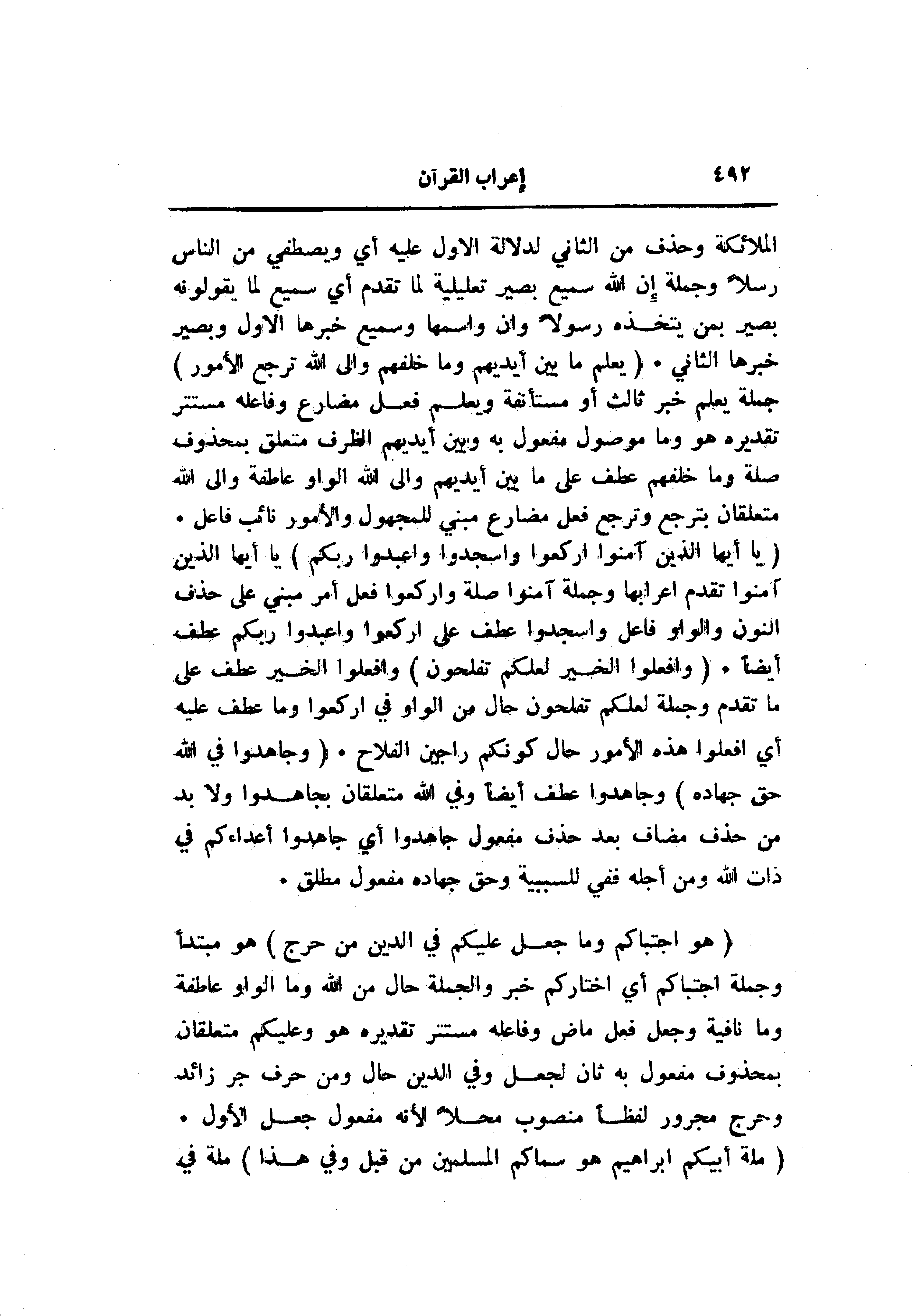 (يا أَيُّهَا الَّذِينَ آمَنُوا ارْكَعُوا وَاسْجُدُوا وَاعْبُدُوا رَبَّكُمْ) يا أيها الذين آمنوا تقدم اعرابها وجملة آمنوا صلة واركعوا فعل أمر مبني على حذف النون والواو فاعل واسجدوا عطف على اركعوا واعبدوا ربكم عطف أيضا. (وَافْعَلُوا الْخَيْرَ لَعَلَّكُمْ تُفْلِحُونَ) وافعلوا الخير عطف على ما تقدم وجملة لعلكم تفلحون حال من الواو في اركعوا وما عطف عليه أي افعلوا هذه الأمور حال كونكم راجين الفلاح. (وَجاهِدُوا فِي اللَّهِ حَقَّ جِهادِهِ) وجاهدوا عطف أيضا وفي الله متعلقان بجاهدوا ولا بد من حذف مضاف بعد حذف مفعول جاهدوا أي جاهدوا أعداءكم في ذات الله ومن أجله ففي للسببية وحق جهاده مفعول مطلق.