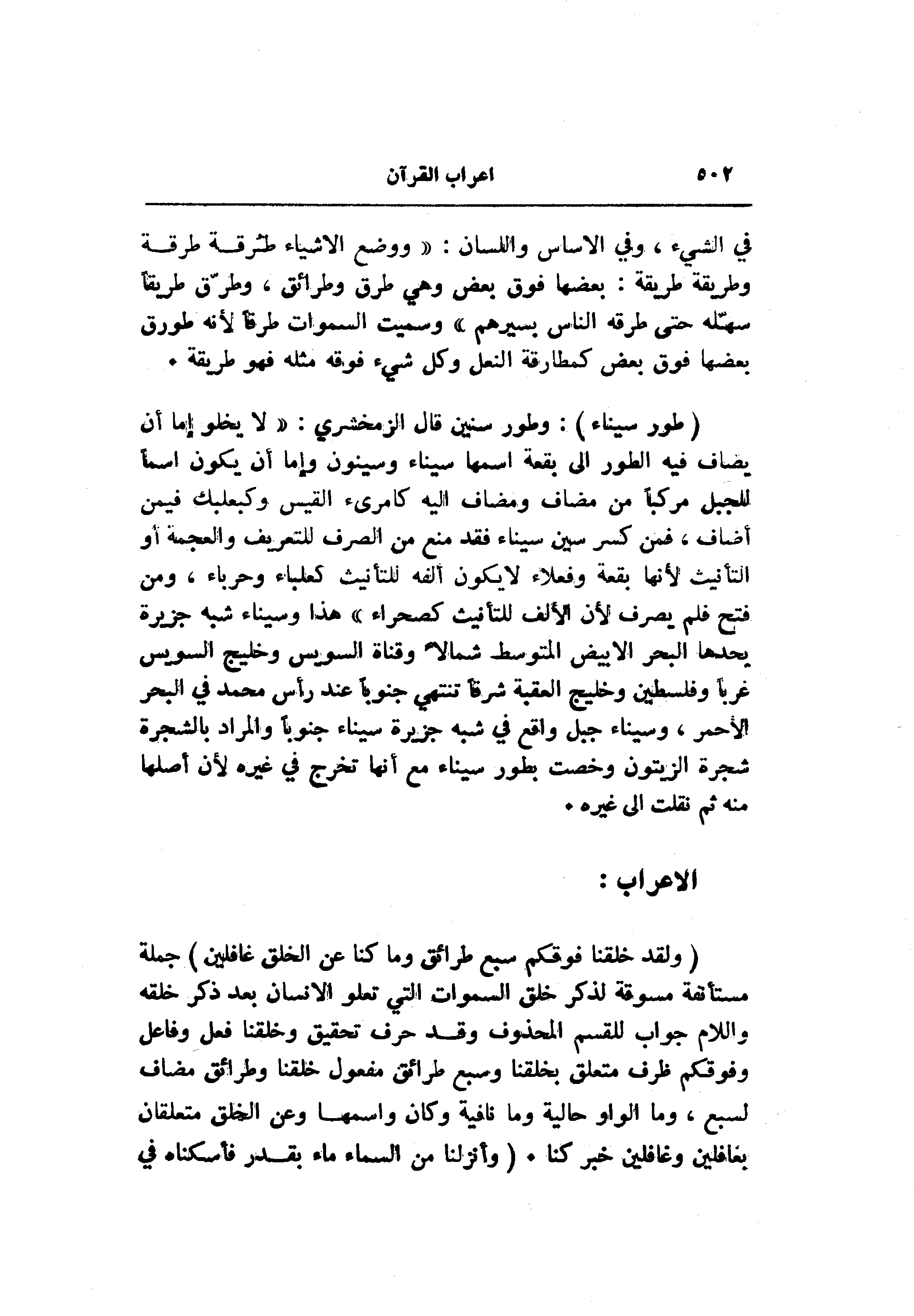 (وَلَقَدْ خَلَقْنا فَوْقَكُمْ سَبْعَ طَرائِقَ وَما كُنَّا عَنِ الْخَلْقِ غافِلِينَ) جملة مستأنفة مسوقة لذكر خلق السموات التي تعلو الإنسان بعد ذكر خلقه واللام جواب للقسم المحذوف وقد حرف تحقيق وخلقنا فعل وفاعل وفوقكم ظرف متعلق بخلقنا وسبع طرائق مفعول خلقنا وطرائق مضاف لسبع، وما الواو حالية وما نافية وكان واسمها وعن الخلق متعلقان بغافلين وغافلين خبر كنا. (وَأَنْزَلْنا مِنَ السَّماءِ ماءً بِقَدَرٍ فَأَسْكَنَّاهُ فِي