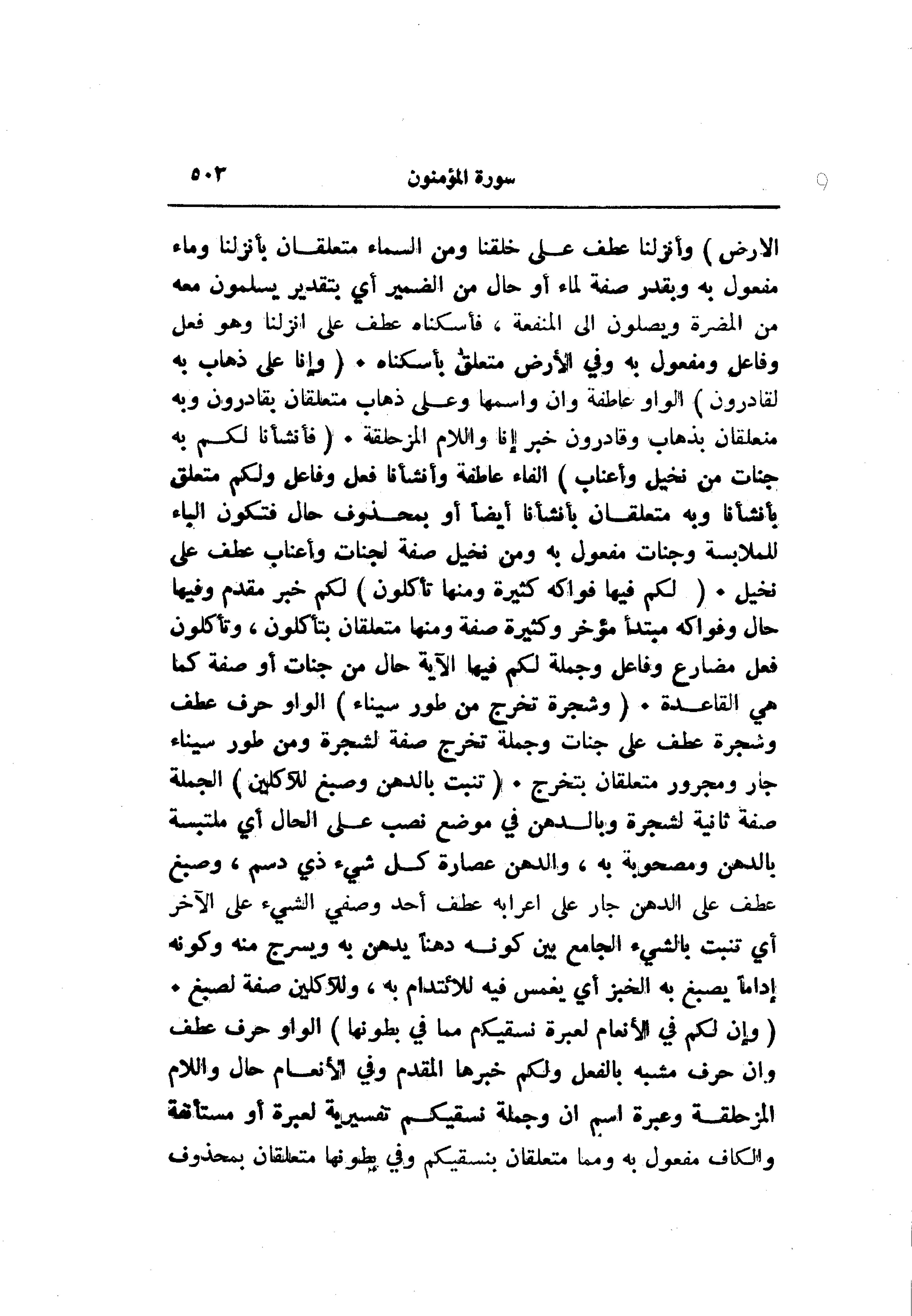 وأنزلنا عطف على خلقنا ومن السماء متعلقان بأنزلنا وماء مفعول به وبقدر صفة لماء أو حال من الضمير أي بتقدير يسلمون معه من المضرة ويصلون الى المنفعة، فأسكناه عطف على أنزلنا وهو فعل وفاعل ومفعول به وفي الأرض متعلق بأسكناه. (وَإِنَّا عَلى ذَهابٍ بِهِ لَقادِرُونَ) الواو عاطفة وان واسمها وعلى ذهاب متعلقان بقادرون وبه متعلقان بذهاب وقادرون خبر إنا واللام المزحلقة. (فَأَنْشَأْنا لَكُمْ بِهِ جَنَّاتٍ مِنْ نَخِيلٍ وَأَعْنابٍ) الفاء عاطفة وأنشأنا فعل وفاعل ولكم متعلق بأنشأنا وبه متعلقان بأنشأنا أيضا أو بمحذوف حال فتكون الباء للملابسة وجنات مفعول به ومن نخيل صفة لجنات وأعناب عطف على نخيل. (لَكُمْ فِيها فَواكِهُ كَثِيرَةٌ وَمِنْها تَأْكُلُونَ) لكم خبر مقدم وفيها حال وفواكه مبتدأ مؤخر وكثيرة صفة ومنها متعلقان بتأكلون، وتأكلون فعل مضارع وفاعل وجملة لكم فيها الآية حال من جنات أو صفة كما هي القاعدة. (وَشَجَرَةً تَخْرُجُ مِنْ طُورِ سَيْناءَ) الواو حرف عطف وشجرة عطف على جنات وجملة تخرج صفة لشجرة ومن طور سيناء جار ومجرور متعلقان بتخرج. (تَنْبُتُ بِالدُّهْنِ وَصِبْغٍ لِلْآكِلِينَ) الجملة صفة ثانية لشجرة وبالدهن في موضع نصب على الحال أي ملتبسة بالدهن ومصحوبة به، والدهن عصارة كل شيء ذي دسم، وصبغ عطف على الدهن جار على إعرابه عطف أحد وصفي الشيء على الآخر أي تنبت بالشيء الجامع بين كونه دهنا يدهن به ويسرج منه وكونه إداما يصبغ به الخبز أي يغمس فيه للائتدام به، وللآكلين صفة لصبغ.