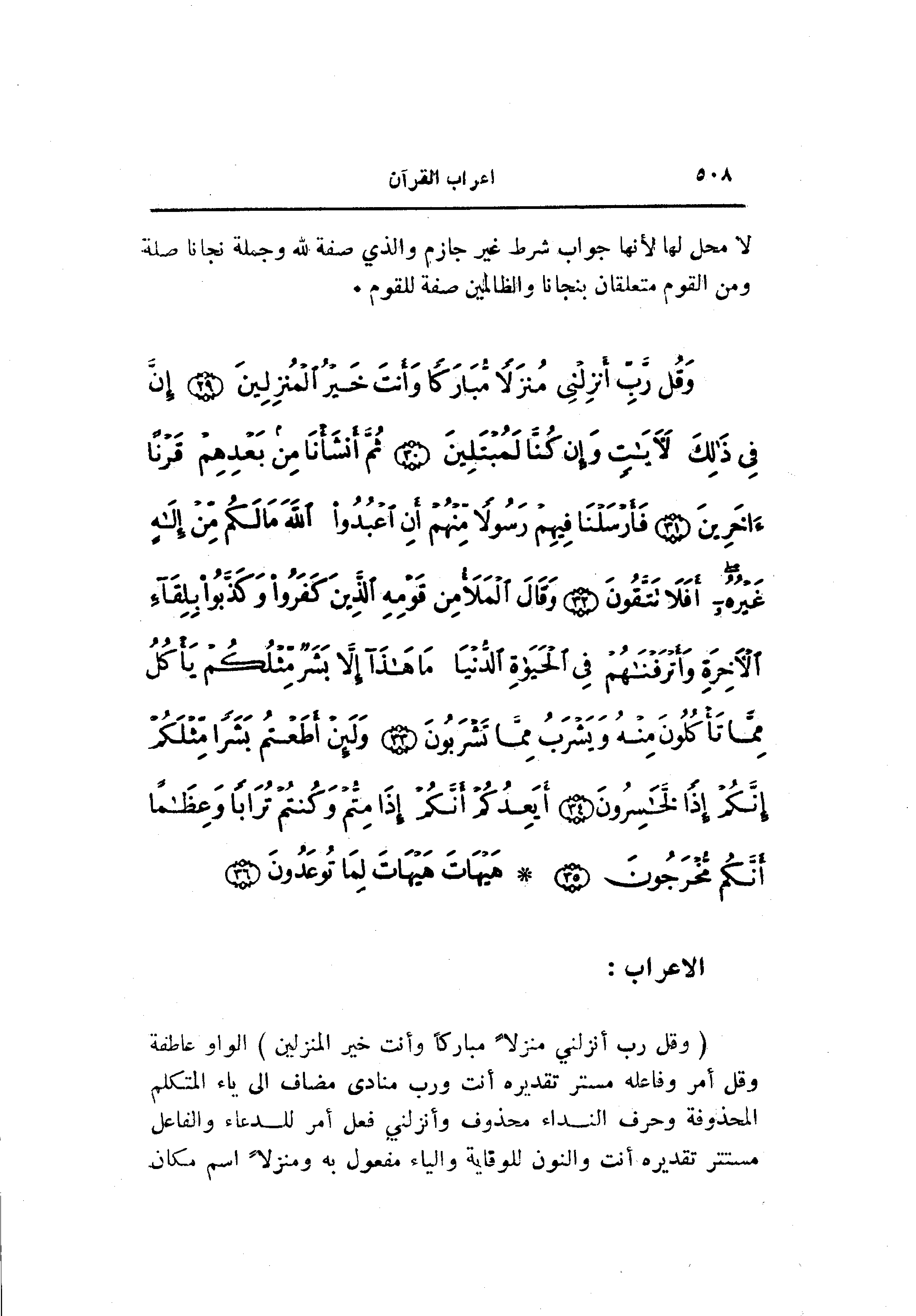 (وَقُلْ رَبِّ أَنْزِلْنِي مُنْزَلًا مُبارَكاً وَأَنْتَ خَيْرُ الْمُنْزِلِينَ) الواو عاطفة وقل أمر وفاعله مستتر تقديره أنت ورب منادى مضاف الى ياء المتكلم المحذوفة وحرف النداء محذوف وأنزلني فعل أمر للدعاء والفاعل مستتر تقديره أنت والنون للوقاية والياء مفعول به ومنزلا اسم مكان