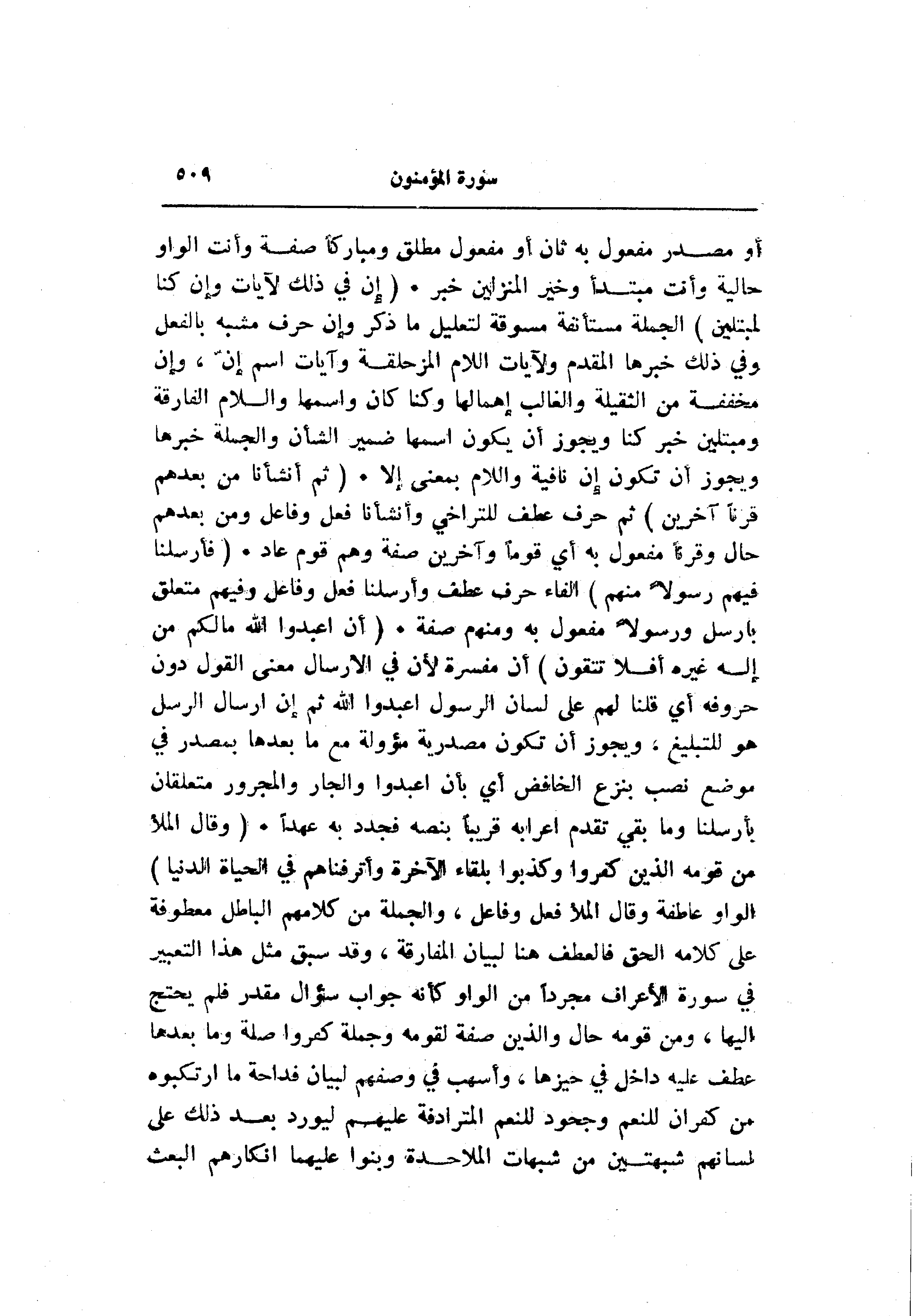 أو مصدر مفعول به ثان أو مفعول مطلق ومباركا صفة وأنت الواو حالية وأنت مبتدأ وخير المنزلين خبر. (إِنَّ فِي ذلِكَ لَآياتٍ وَإِنْ كُنَّا لَمُبْتَلِينَ) الجملة مستأنفة مسوقة لتعليل ما ذكر وإن حرف مشبه بالفعل وفي ذلك خبرها المقدم ولآيات اللام المزحلقة وآيات اسم إنّ، وإن مخففة من الثقيلة والغالب إهمالها وكنا كان واسمها واللام الفارقة ومبتلين خبر كنا ويجوز أن يكون اسمها ضمير الشأن والجملة خبرها ويجوز أن تكون إن نافية واللام بمعنى إلا. (ثُمَّ أَنْشَأْنا مِنْ بَعْدِهِمْ قَرْناً آخَرِينَ) ثم حرف عطف للتراخي وأنشأنا فعل وفاعل ومن بعدهم حال وقرنا مفعول به أي قوما وآخرين صفة وهم قوم عاد. (فَأَرْسَلْنا فِيهِمْ رَسُولًا مِنْهُمْ) الفاء حرف عطف وأرسلنا فعل وفاعل وفيهم متعلق بأرسل ورسولا مفعول به ومنهم صفة. (أَنِ اعْبُدُوا اللَّهَ ما لَكُمْ مِنْ إِلهٍ غَيْرُهُ أَفَلا تَتَّقُونَ) أن مفسرة لأن في الإرسال معنى القول دون حروفه أي قلنا لهم على لسان الرسول اعبدوا الله ثم إن إرسال الرسل هو للتبليغ، ويجوز أن تكون مصدرية مؤولة مع ما بعدها بمصدر في موضع نصب بنزع الخافض أي بأن اعبدوا والجار والمجرور متعلقان بأرسلنا وما بقي تقدم إعرابه قريبا بنصه فجدد به عهدا. (وَقالَ الْمَلَأُ مِنْ قَوْمِهِ الَّذِينَ كَفَرُوا وَكَذَّبُوا بِلِقاءِ الْآخِرَةِ وَأَتْرَفْناهُمْ فِي الْحَياةِ الدُّنْيا) الواو عاطفة وقال الملأ فعل وفاعل، والجملة من كلامهم الباطل معطوفة على كلامه الحق فالعطف هنا لبيان المفارقة، وقد سبق مثل هذا التعبير في سورة الأعراف مجردا من الواو كأنه جواب سؤال مقدر فلم يحتج إليها، ومن قومه حال والذين صفة لقومه وجملة كفروا صلة وما بعدها عطف عليه داخل في حيزها، وأسهب في وصفهم لبيان فداحة ما ارتكبوه من كفران للنعم وجحود للنعم المترادفة عليهم ليورد بعد ذلك على لسانهم شبهتين من شبهات الملاحدة وبنوا عليها انكارهم البعث