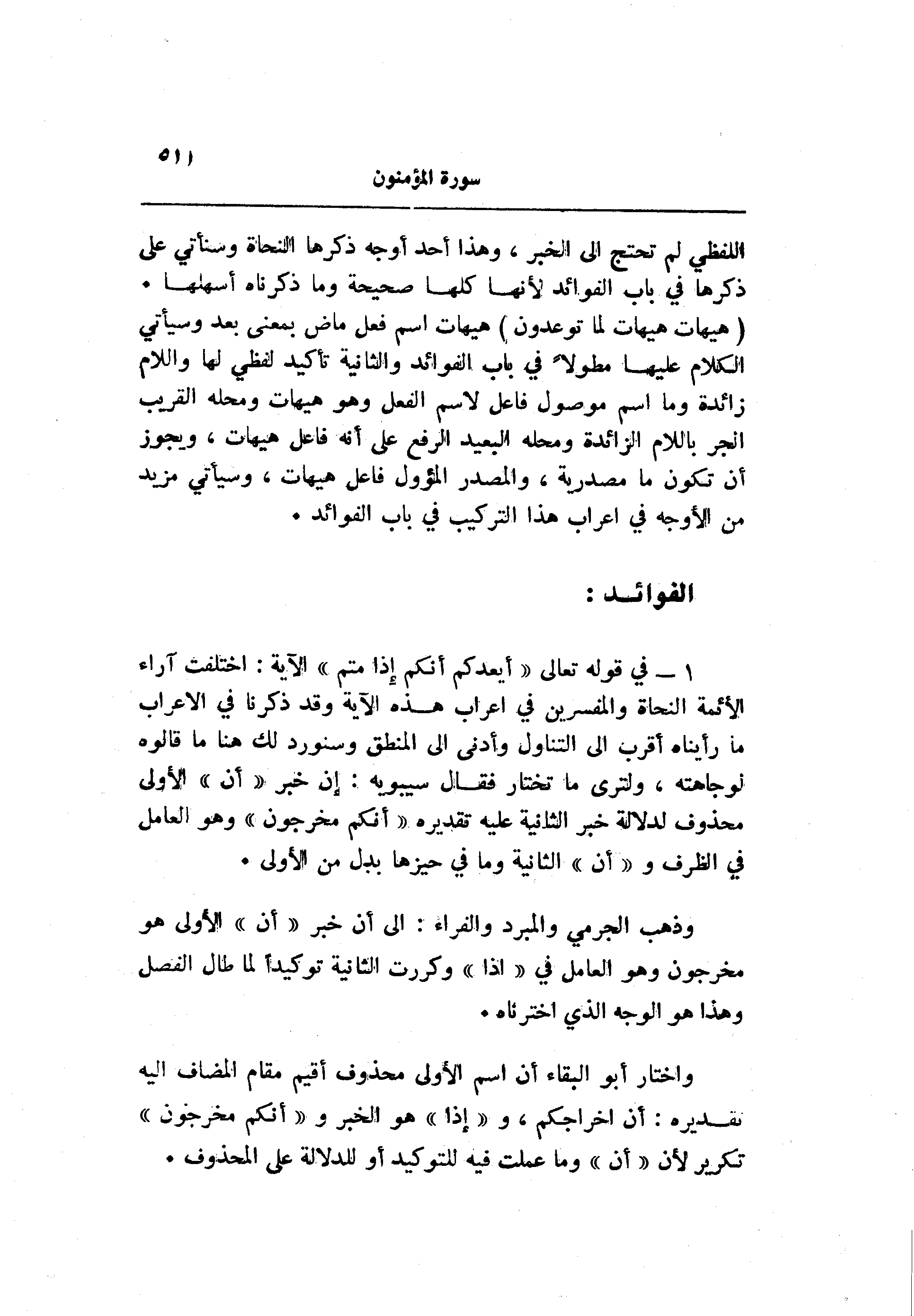 1- في قوله تعالى «أَيَعِدُكُمْ أَنَّكُمْ إِذا مِتُّمْ» الآية: اختلفت آراء الأئمة النحاة والمفسرين في اعراب هذه الآية وقد ذكرنا في الاعراب ما رأيناه أقرب الى التناول وأدنى الى المنطق وسنورد لك هنا ما قالوه لوجاهته، ولترى ما تختار فقال سيبويه: إن خبر «أن» الأولى محذوف لدلالة خبر الثانية عليه تقديره «أنكم مخرجون» وهو العامل في الظرف و «أن» الثانية وما في حيزها بدل من الأولى.