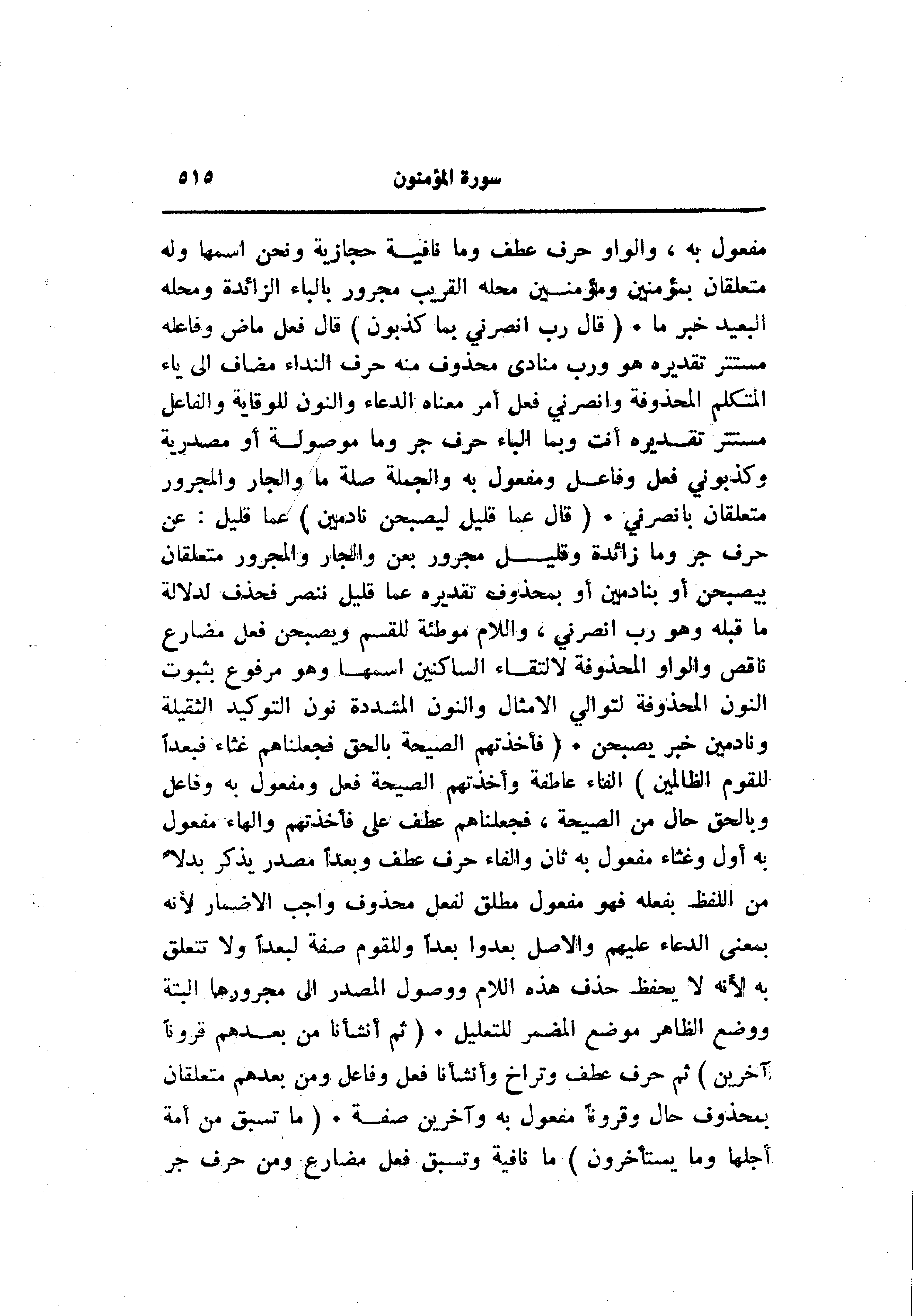 مفعول به، والواو حرف عطف وما نافية حجازية ونحن اسمها وله متعلقان بمؤمنين ومؤمنين محله القريب مجرور بالباء الزائدة ومحله البعيد خبر ما. (قالَ رَبِّ انْصُرْنِي بِما كَذَّبُونِ) قال فعل ماض وفاعله مستتر تقديره هو ورب منادى محذوف منه حرف النداء مضاف الى ياء المتكلم المحذوفة وانصرني فعل أمر معناه الدعاء والنون للوقاية والفاعل مستتر تقديره أنت وبما الباء حرف جر وما موصولة أو مصدرية وكذبوني فعل وفاعل ومفعول به والجملة صلة ما والجار والمجرور متعلقان بانصرني. (قالَ عَمَّا قَلِيلٍ لَيُصْبِحُنَّ نادِمِينَ) عما قليل: عن حرف جر وما زائدة وقليل مجرور بعن والجار والمجرور متعلقان بيصبحن أو بنادمين أو بمحذوف تقديره عما قليل ننصر فحذف لدلالة ما قبله وهو رب انصرني، واللام موطئة للقسم ويصبحن فعل مضارع ناقص والواو المحذوفة لالتقاء الساكنين اسمها وهو مرفوع بثبوت النون المحذوفة لتوالي الأمثال والنون المشددة نون التوكيد الثقيلة ونادمين خبر يصبحن. (فَأَخَذَتْهُمُ الصَّيْحَةُ بِالْحَقِّ فَجَعَلْناهُمْ غُثاءً فَبُعْداً لِلْقَوْمِ الظَّالِمِينَ) الفاء عاطفة وأخذتهم الصيحة فعل ومفعول به وفاعل وبالحق حال من الصيحة، فجعلناهم عطف على فأخذتهم والهاء مفعول به أول وغثاء مفعول به ثان والفاء حرف عطف وبعدا مصدر يذكر بدلا من اللفظ بفعله فهو مفعول مطلق لفعل محذوف واجب الإضمار لأنه بمعنى الدعاء عليهم والأصل بعدوا بعدا وللقوم صفة لبعدا ولا تتعلق به لأنه لا يحفظ حذف هذه اللام ووصول المصدر الى مجرورها البتة ووضع الظاهر موضع المضمر للتعليل. (ثُمَّ أَنْشَأْنا مِنْ بَعْدِهِمْ قُرُوناً آخَرِينَ) ثم حرف عطف وتراخ وأنشأنا فعل وفاعل ومن بعدهم متعلقان بمحذوف حال وقرونا مفعول به وآخرين صفة. (ما تَسْبِقُ مِنْ أُمَّةٍ أَجَلَها وَما يَسْتَأْخِرُونَ) ما نافية وتسبق فعل مضارع ومن حرف جر