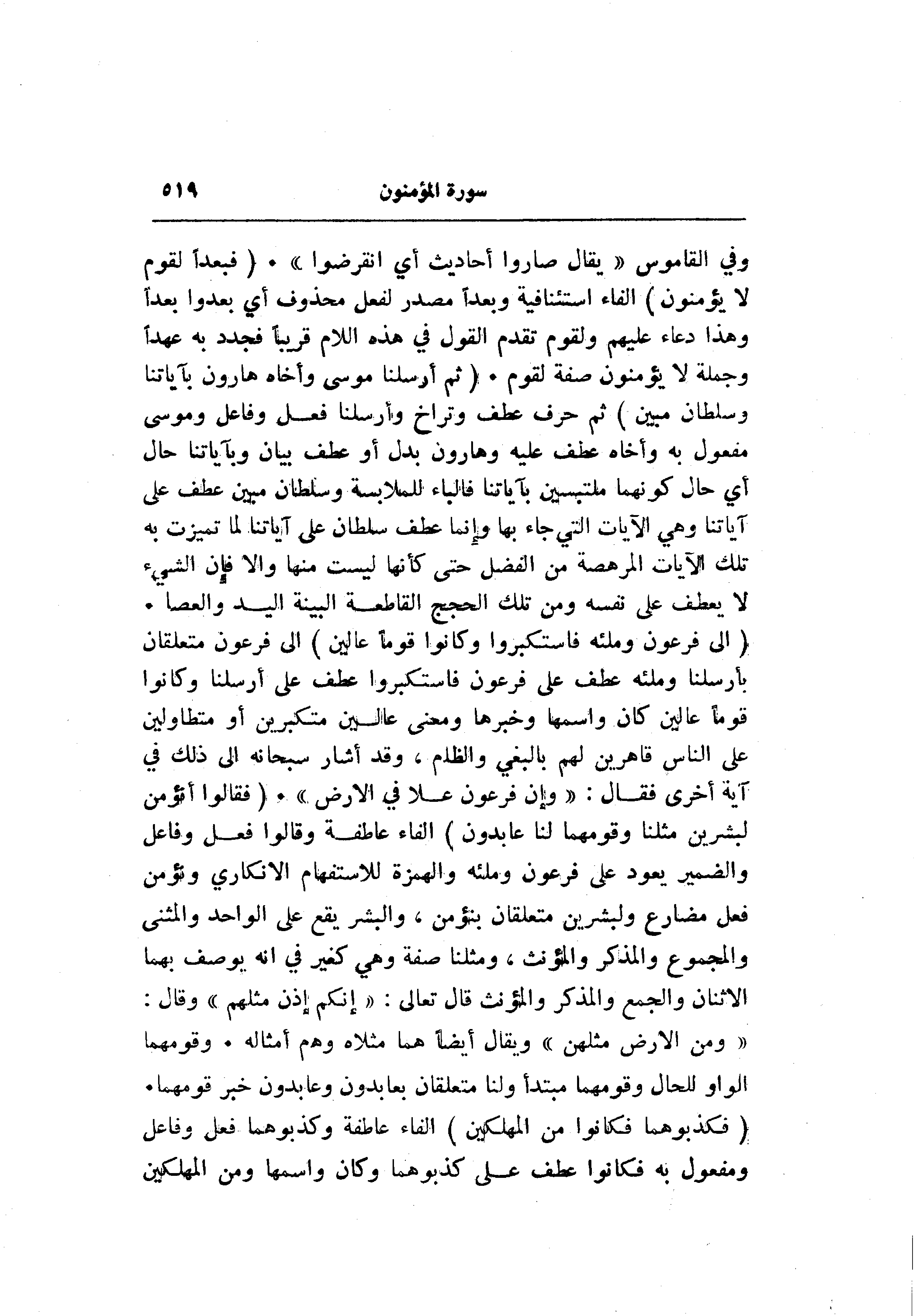 وفي القاموس «يقال صاروا أحاديث أي انقرضوا» . (فَبُعْداً لِقَوْمٍ لا يُؤْمِنُونَ) الفاء استئنافية وبعدا مصدر لفعل محذوف أي بعدوا بعدا وهذا دعاء عليهم ولقوم تقدم القول في هذه اللام قريبا فجدد به عهدا وجملة لا يؤمنون صفة لقوم. (ثُمَّ أَرْسَلْنا مُوسى وَأَخاهُ هارُونَ بِآياتِنا وَسُلْطانٍ مُبِينٍ) ثم حرف عطف وتراخ وأرسلنا فعل وفاعل وموسى مفعول به وأخاه عطف عليه وهارون بدل أو عطف بيان وبآياتنا حال أي حال كونهما ملتبسين بآياتنا فالباء للملابسة وسلطان مبين عطف على آياتنا وهي الآيات التي جاء بها وإنما عطف سلطان على آياتنا لما تميزت به تلك الآيات المرهصة من الفضل حتى كأنها ليست منها والا فإن الشيء لا يعطف على نفسه ومن تلك الحجج القاطعة البينة اليد والعصا.